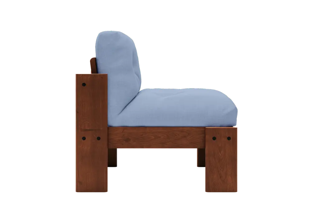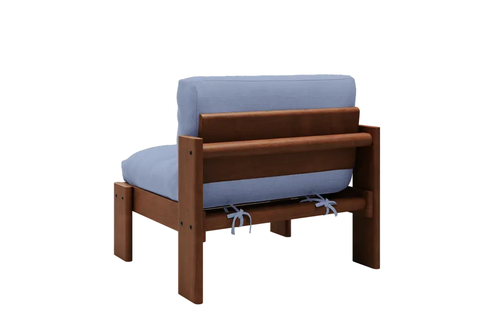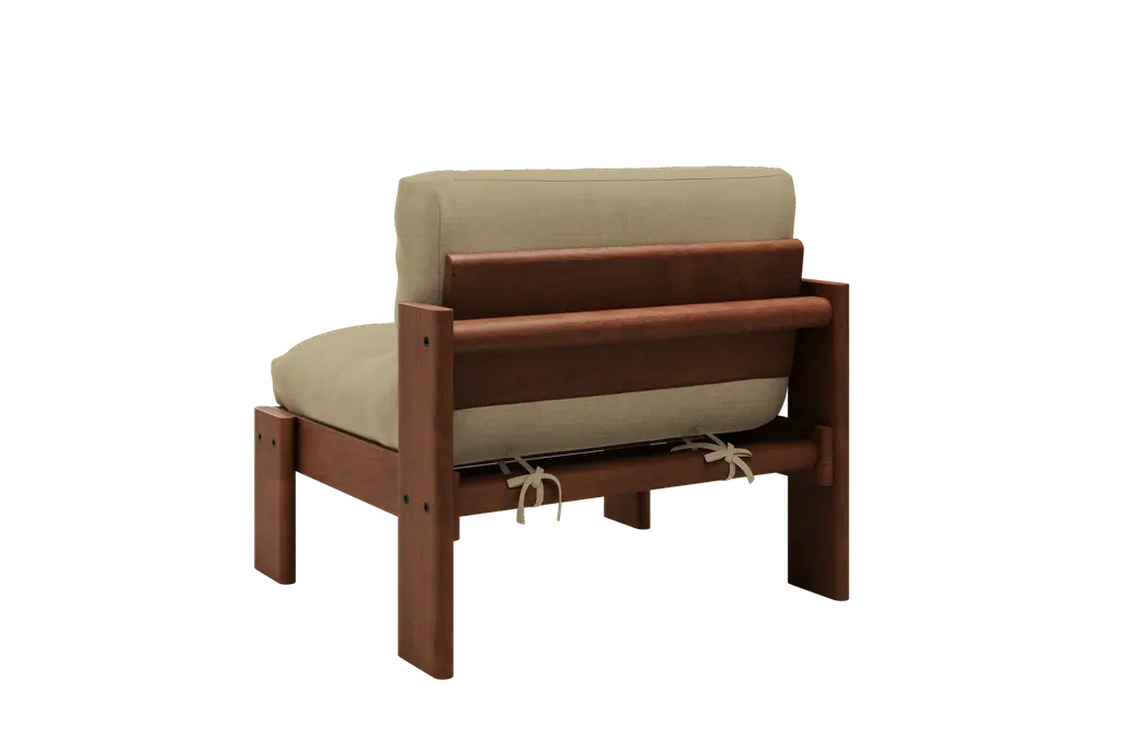 Bacana, slang for "cool" in Brazil, is a collection of laid back lounge chairs in generous proportions. The flat-pack design comes with a removable plush seat cushion that ties to the frame to hold its shape. The design was inspired by the wide plank, rich wood furniture of Brazilian mid century paired with exposed hardware a la Monk Chair by Afra and Tobia Scarpa.