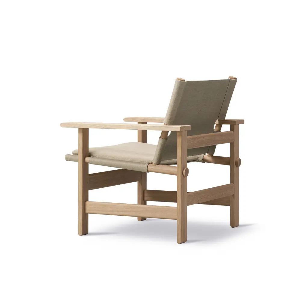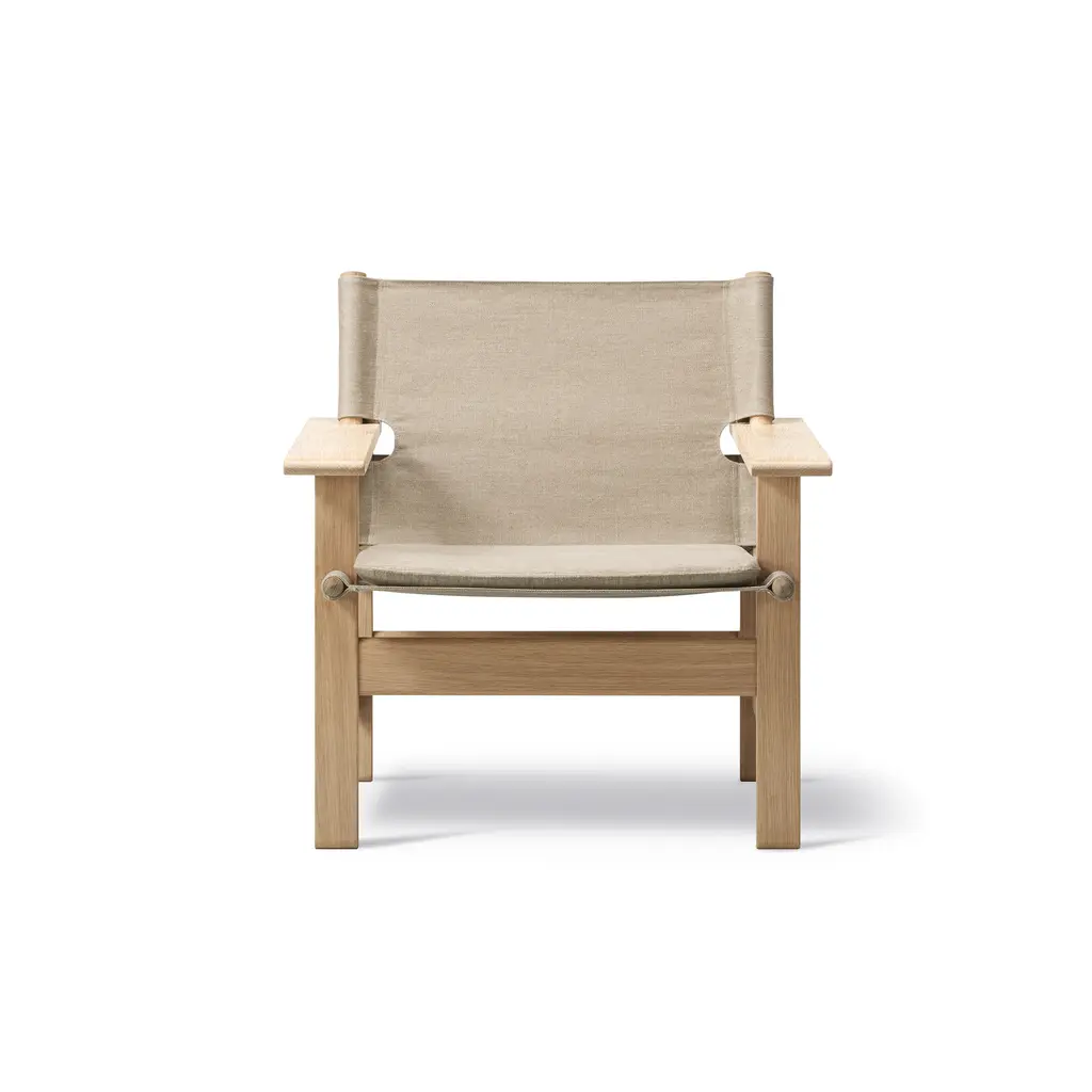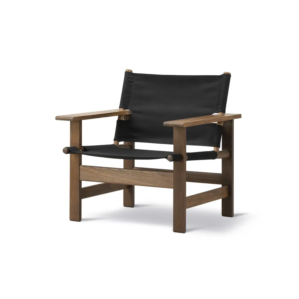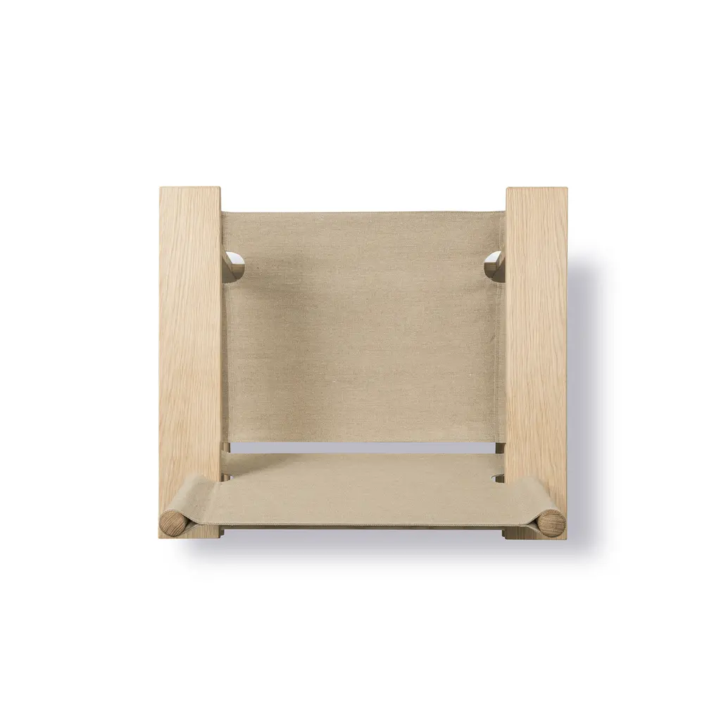 The Canvas Chair by Børge Mogensen showcases a design driven by functionality and simplicity. It features a flat canvas seat and back, suspended between round wooden frames made from prime European oak. The chair’s structure incorporates Mogensen’s signature use of clean horizontal and vertical lines, ensuring both stability and a straightforward aesthetic. Designed in 1970, the Canvas Chair remains relevant with its use of natural materials and unembellished design. Available in black or natural-colored canvas, with an optional cushion in canvas or leather, it suits various decor styles, from modern minimalist to rustic interiors. This chair is suitable for a hotel, lounge, retail space, or private home, providing a versatile and practical seating solution.