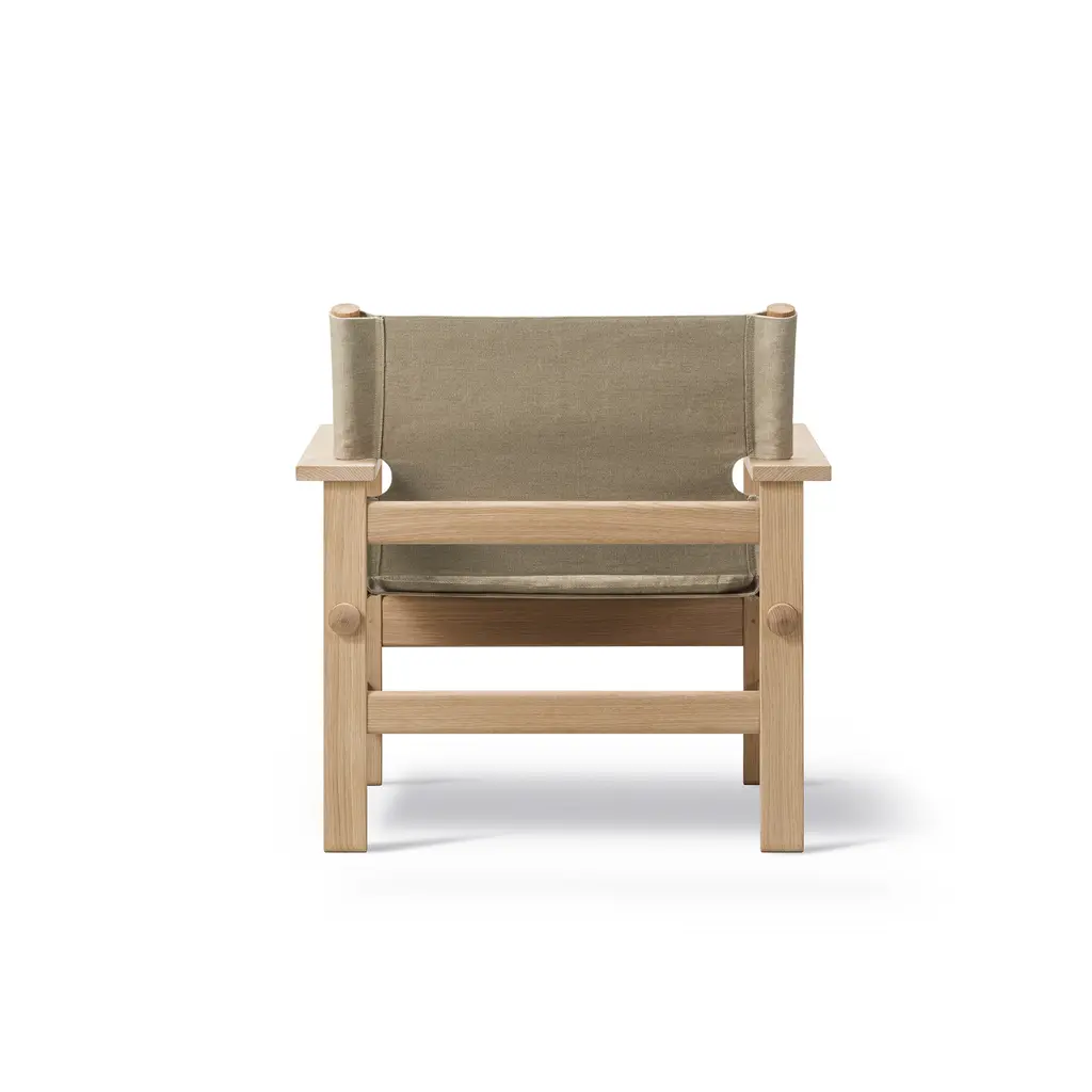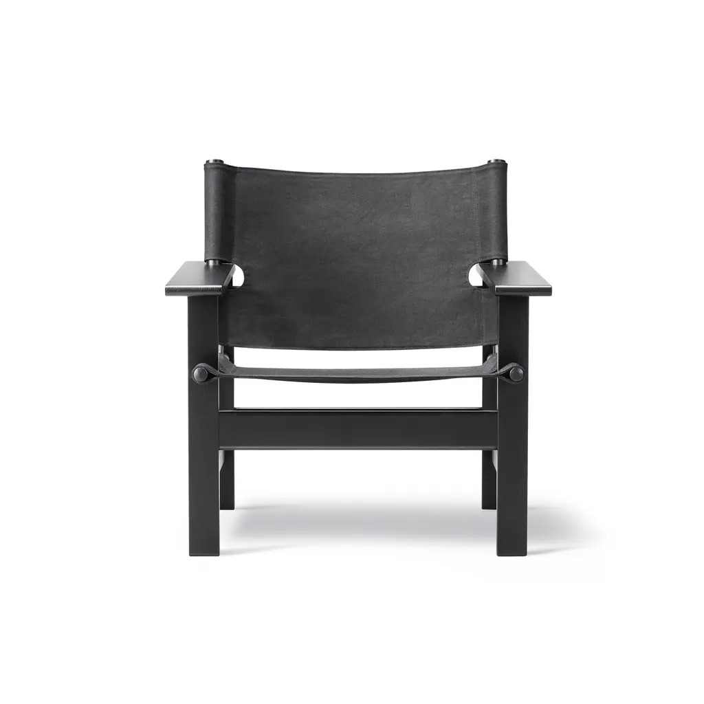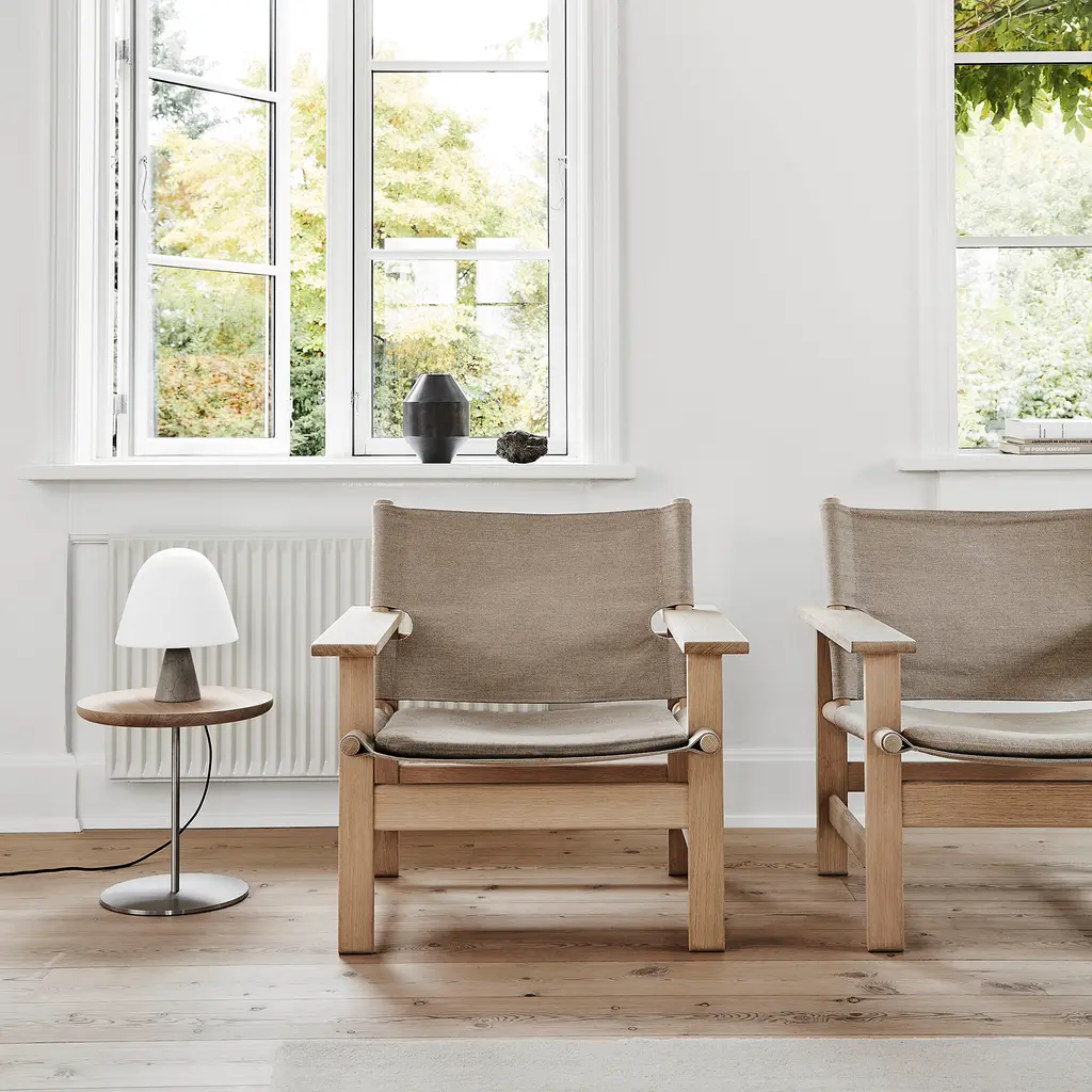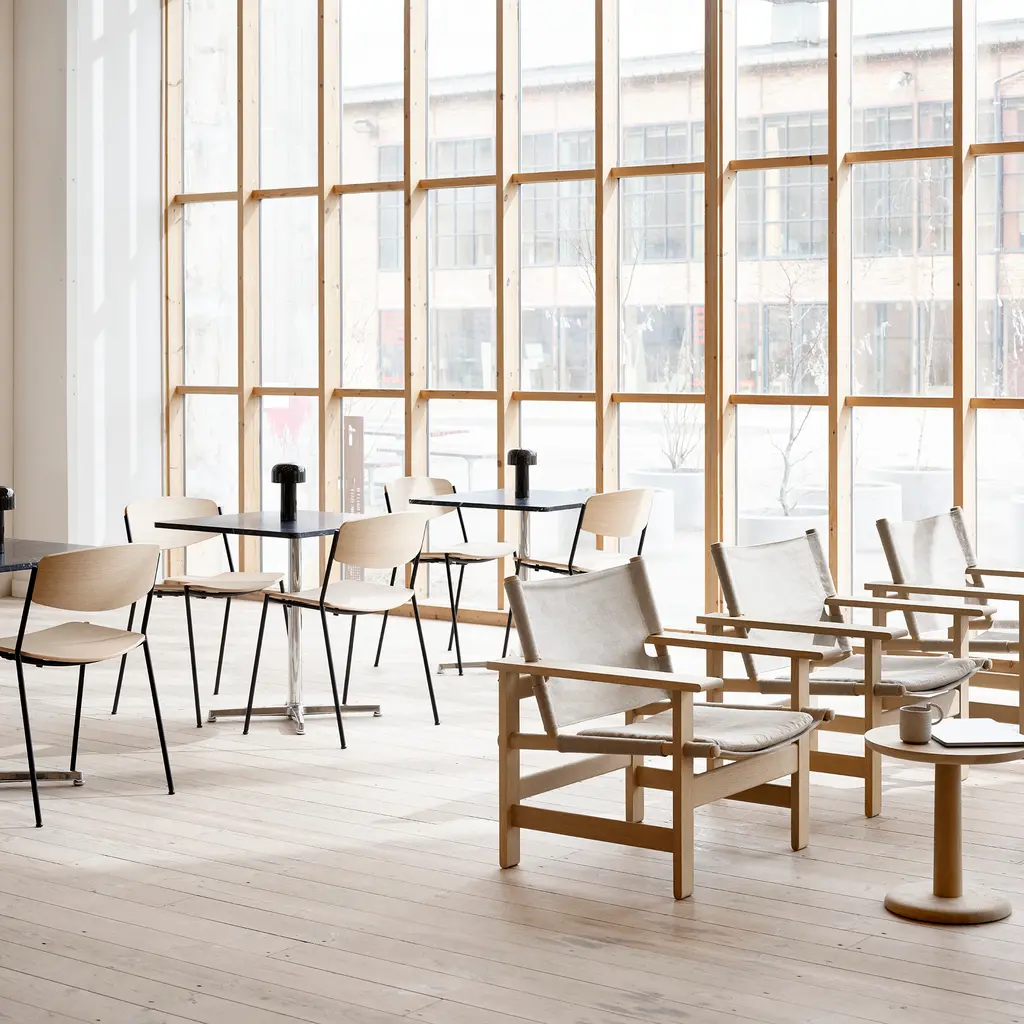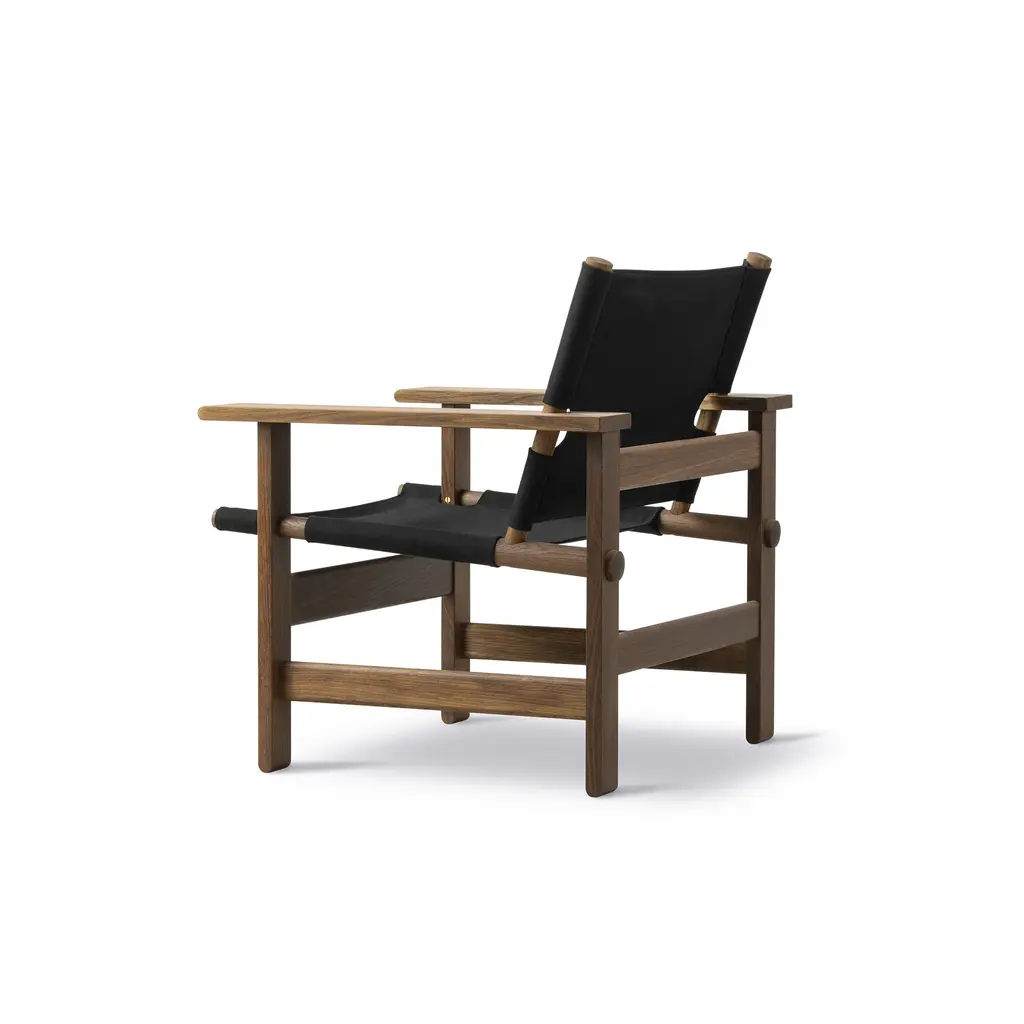 The Canvas Chair by Børge Mogensen showcases a design driven by functionality and simplicity. It features a flat canvas seat and back, suspended between round wooden frames made from prime European oak. The chair’s structure incorporates Mogensen’s signature use of clean horizontal and vertical lines, ensuring both stability and a straightforward aesthetic. Designed in 1970, the Canvas Chair remains relevant with its use of natural materials and unembellished design. Available in black or natural-colored canvas, with an optional cushion in canvas or leather, it suits various decor styles, from modern minimalist to rustic interiors. This chair is suitable for a hotel, lounge, retail space, or private home, providing a versatile and practical seating solution.