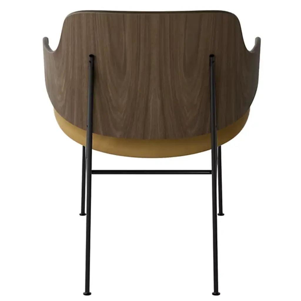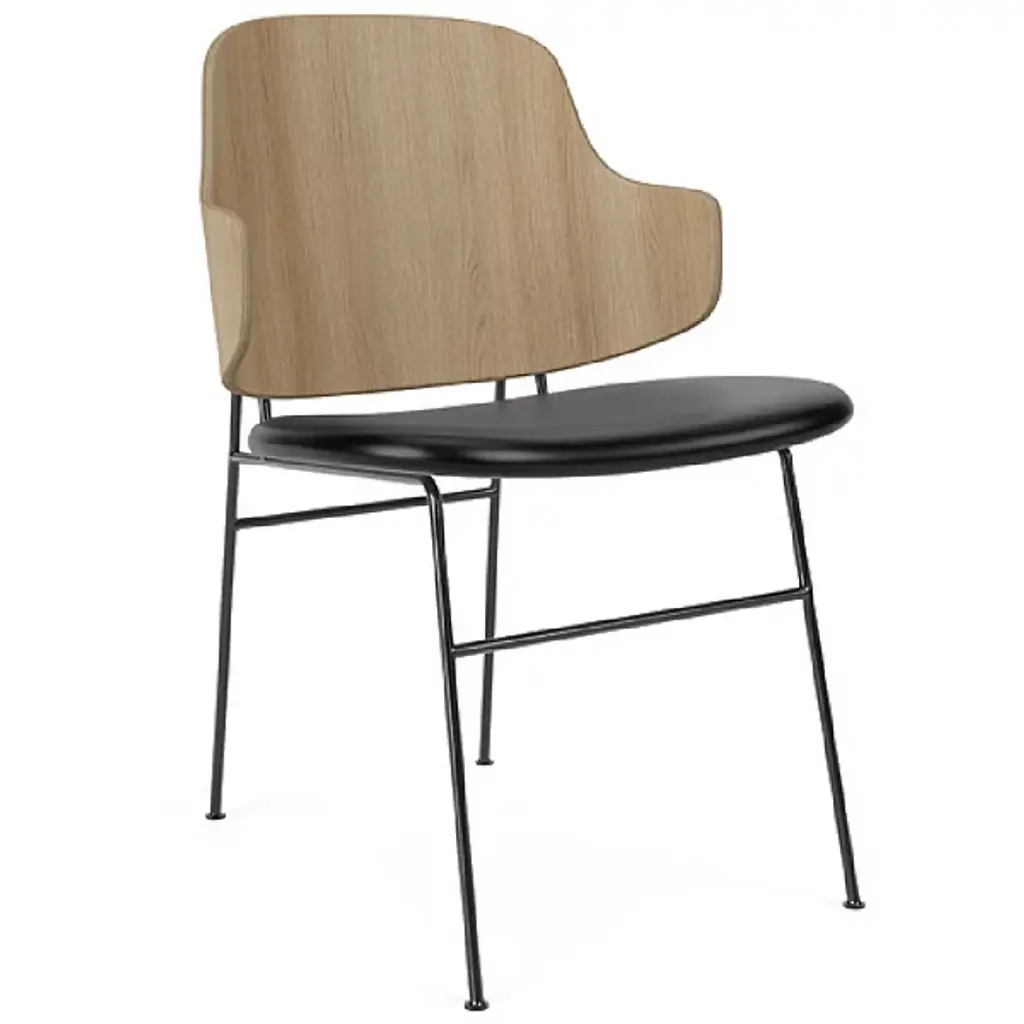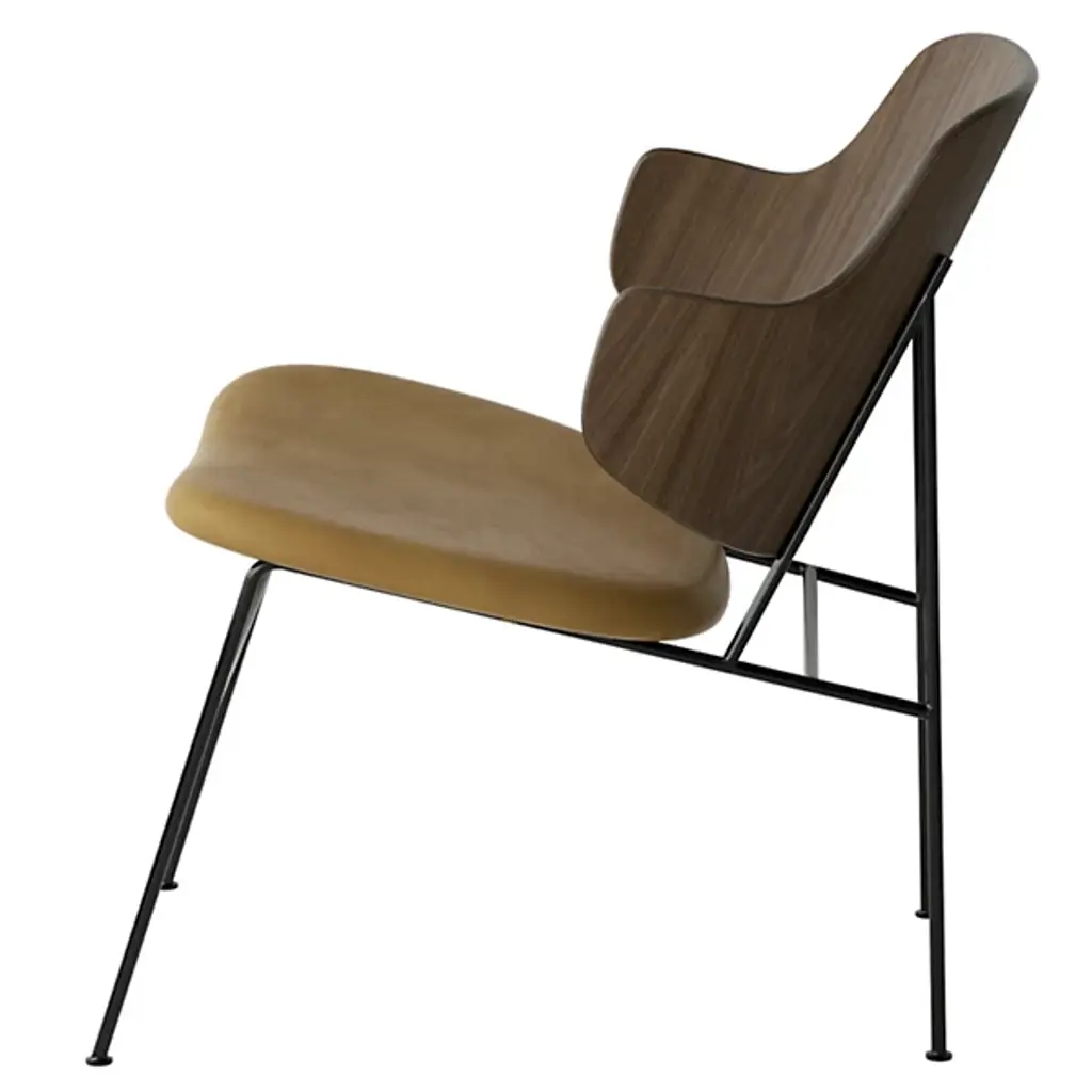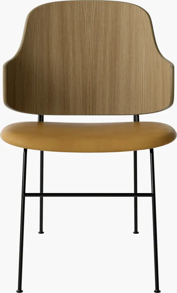 Imagine yourself falling back into the arms of a cozy penguin with The Penguin Lounge Chair, Upholstered Seat from Audo Copenhagen, formerly known as Menu. This Scandinavian-style, mid-century modern icon takes in designer Ib Kofod-Larsen’s renowned clean and sculptural lines. These lines are realized with raw, crafted materials. Slender powder-coated steel rods produce a graphic silhouette and a framework that leans one back with an airy feeling. A leather seat tops it and creates a luscious sensation when lounging courtesy of its foam filling. Inspired by a penguin’s flippers, the chair produces a back shell that hugs one with charming armrests. This shell’s plywood and veneer construction seduces with long wood grain streaks and a golden hue.