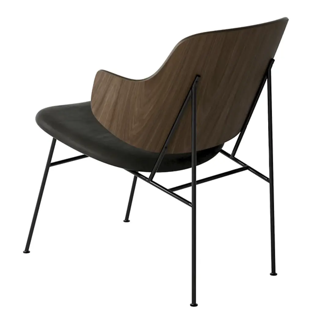 Imagine yourself falling back into the arms of a cozy penguin with The Penguin Lounge Chair, Upholstered Seat from Audo Copenhagen, formerly known as Menu. This Scandinavian-style, mid-century modern icon takes in designer Ib Kofod-Larsen’s renowned clean and sculptural lines. These lines are realized with raw, crafted materials. Slender powder-coated steel rods produce a graphic silhouette and a framework that leans one back with an airy feeling. A leather seat tops it and creates a luscious sensation when lounging courtesy of its foam filling. Inspired by a penguin’s flippers, the chair produces a back shell that hugs one with charming armrests. This shell’s plywood and veneer construction seduces with long wood grain streaks and a golden hue.