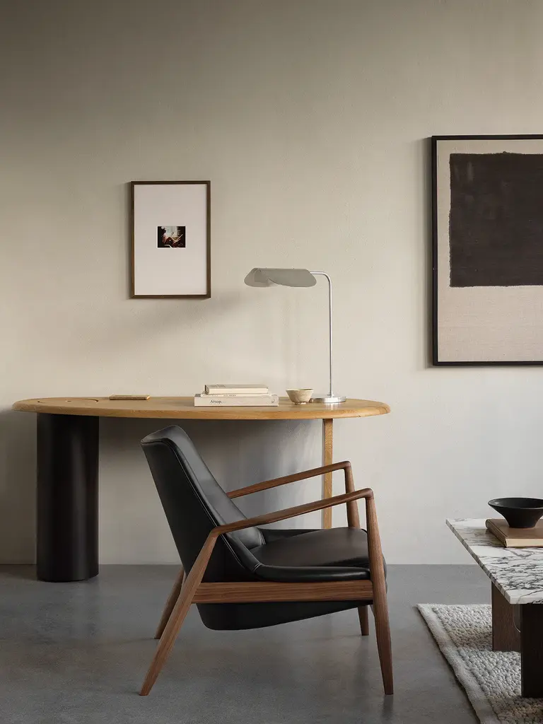 Arguably one of Ib Kofod-Larsen's best-known designs, The Seal is an elegant armchair typical of its time – and yet entirely timeless. The angled frame and armrests and leather upholstery put comfort at the fore, inviting lounging. And despite being made of heavy materials, it has a lightness to it; the shell appears to float inside the wooden frame. Named after the Swedish ski resort, The Seal is a fine example of Ib Kofod-Larsen's organic design and focus on detail and comfort. The chair is available with a low or high back.