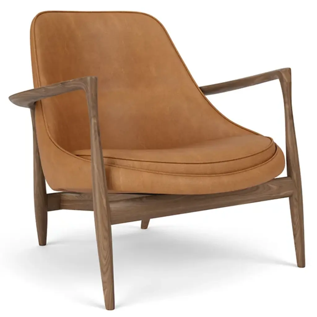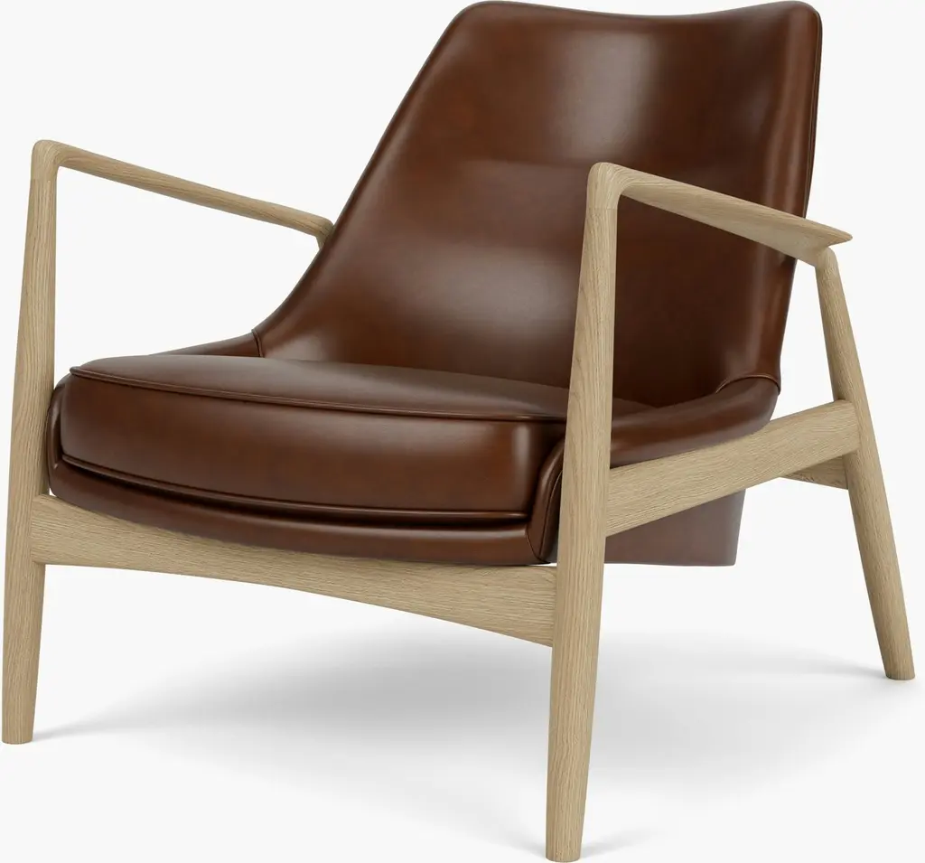 The Seal Low Back Lounge Chair from Audo Copenhagen, formerly known as Menu, makes evident the mid-century aesthetic and the place of restfulness for the home. Designer Ib Kofod-Larsen approached each piece with an emphasis on detail, proportion, and refinement. The chair shows its refinement with the balanced contours of the wood base. This base keeps the feet low to the ground, the arms propped up, and the back leaning gently. In a time-tested combo, leather pairs with wood and plywood in the chair’s cradling seat shell. The tall, curved backrest and plump seat rest feel smooth as they receive a leather wrap. This lounge chair is made in the Scandinavian design tradition. It features a recycled wool, new wool, and nylon spring support. The chair's Greenguard certification reflects adherence to strict low chemical emissions standards.