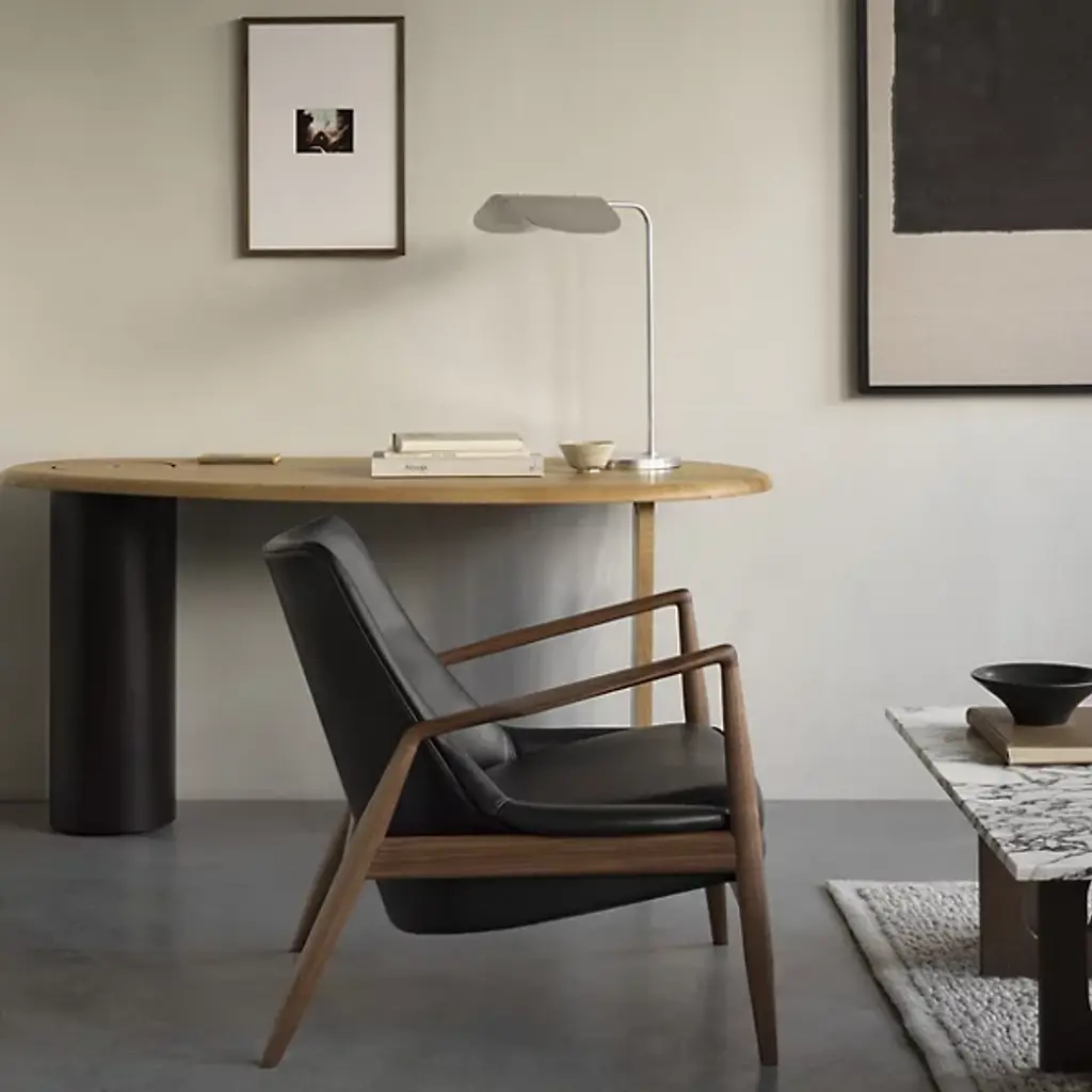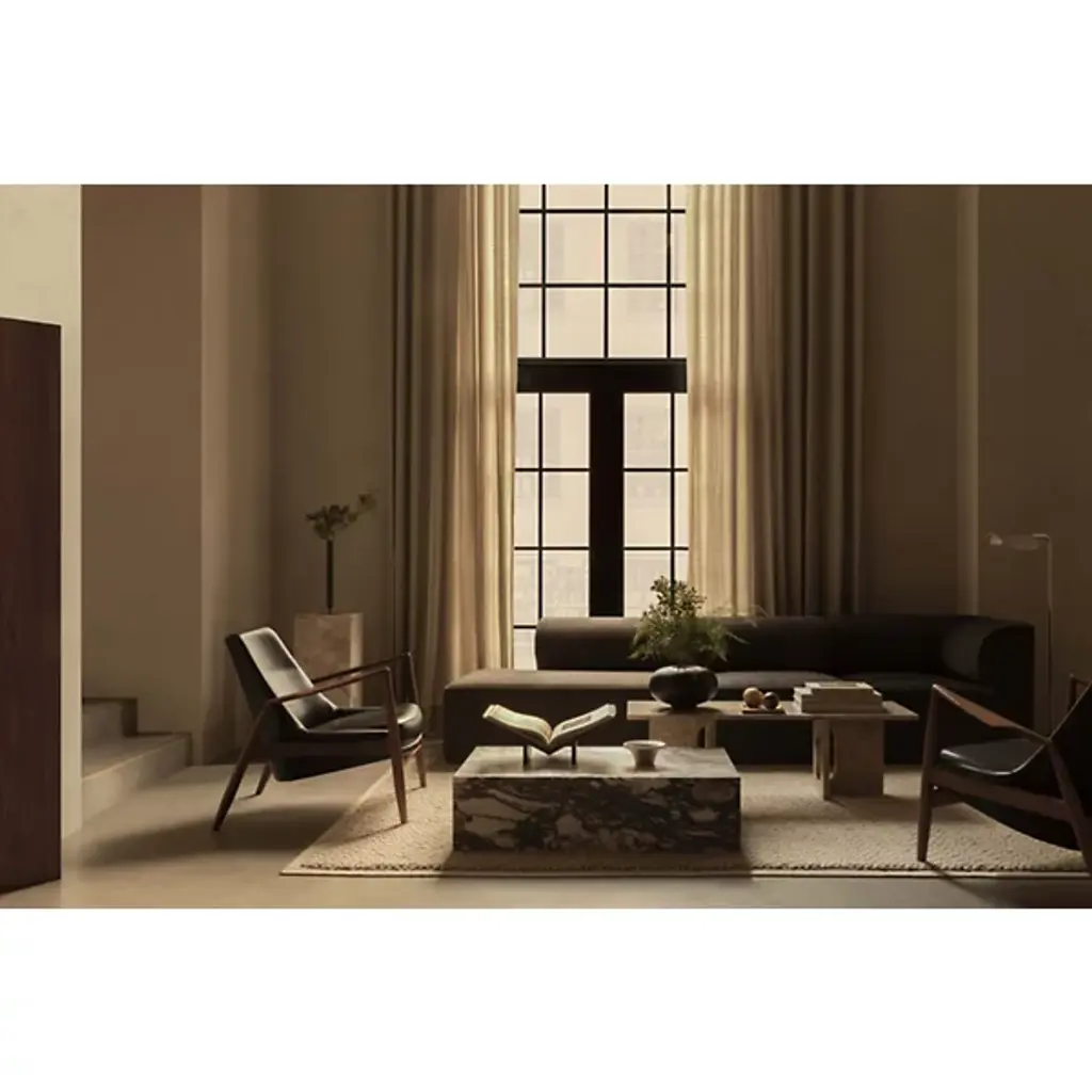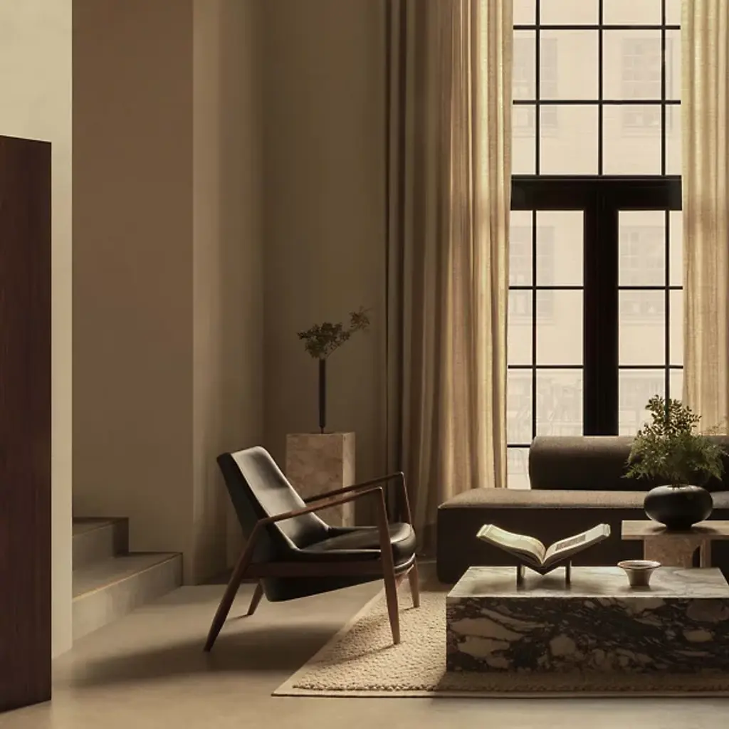 The Seal Low Back Lounge Chair from Audo Copenhagen, formerly known as Menu, makes evident the mid-century aesthetic and the place of restfulness for the home. Designer Ib Kofod-Larsen approached each piece with an emphasis on detail, proportion, and refinement. The chair shows its refinement with the balanced contours of the wood base. This base keeps the feet low to the ground, the arms propped up, and the back leaning gently. In a time-tested combo, leather pairs with wood and plywood in the chair’s cradling seat shell. The tall, curved backrest and plump seat rest feel smooth as they receive a leather wrap. This lounge chair is made in the Scandinavian design tradition. It features a recycled wool, new wool, and nylon spring support. The chair's Greenguard certification reflects adherence to strict low chemical emissions standards.