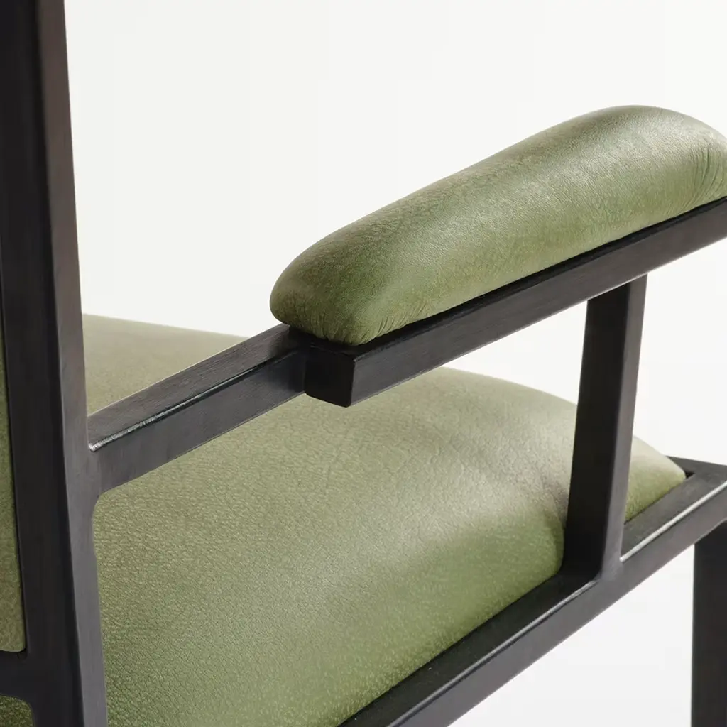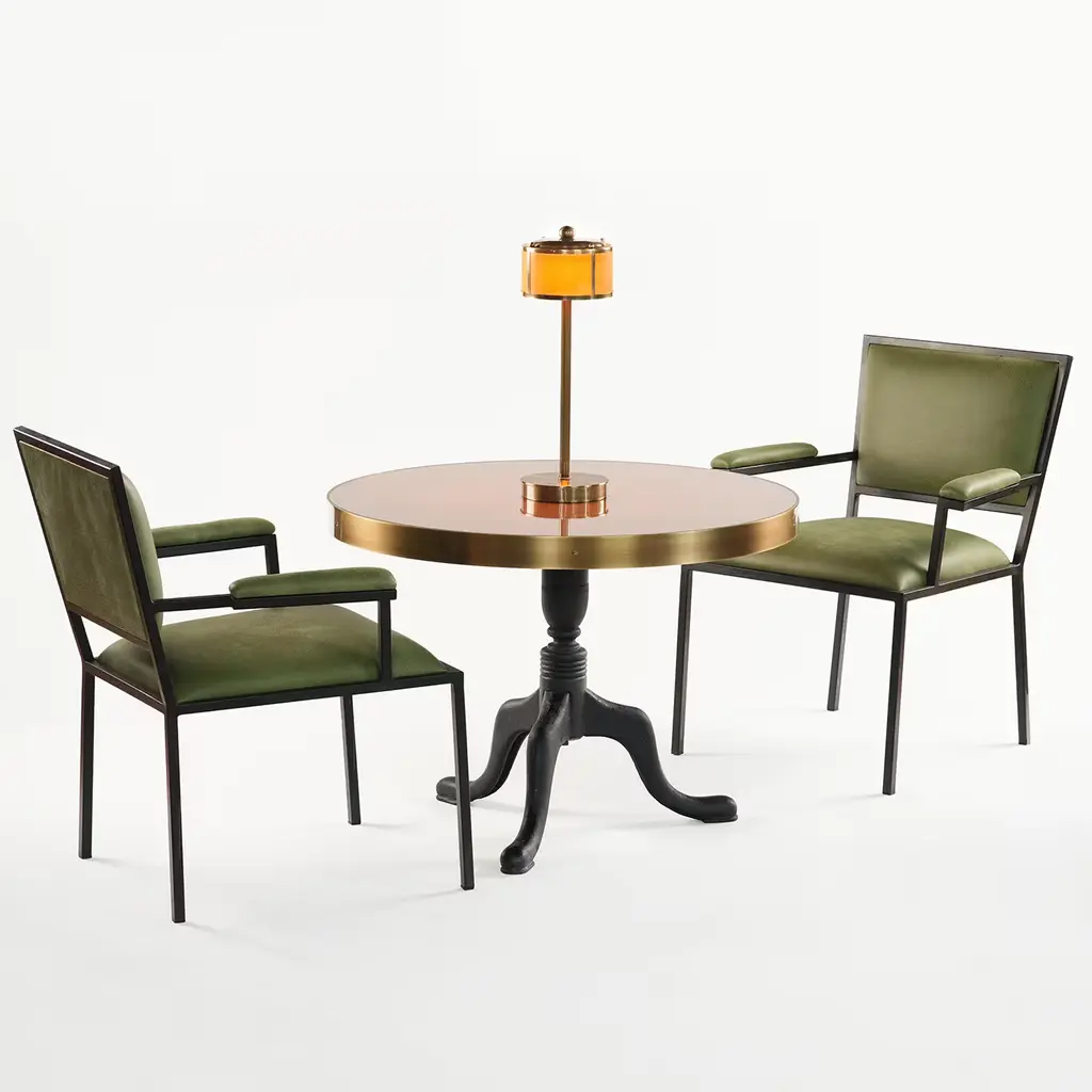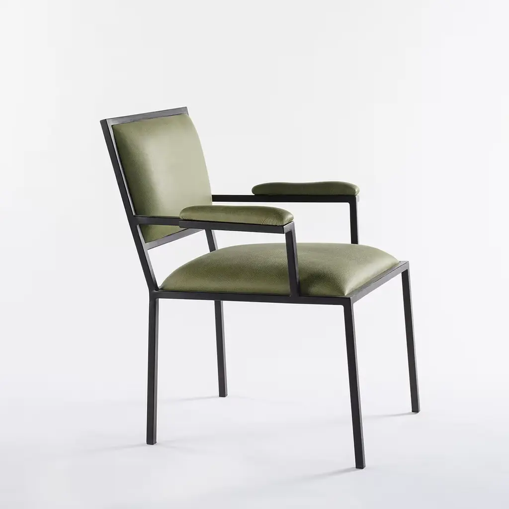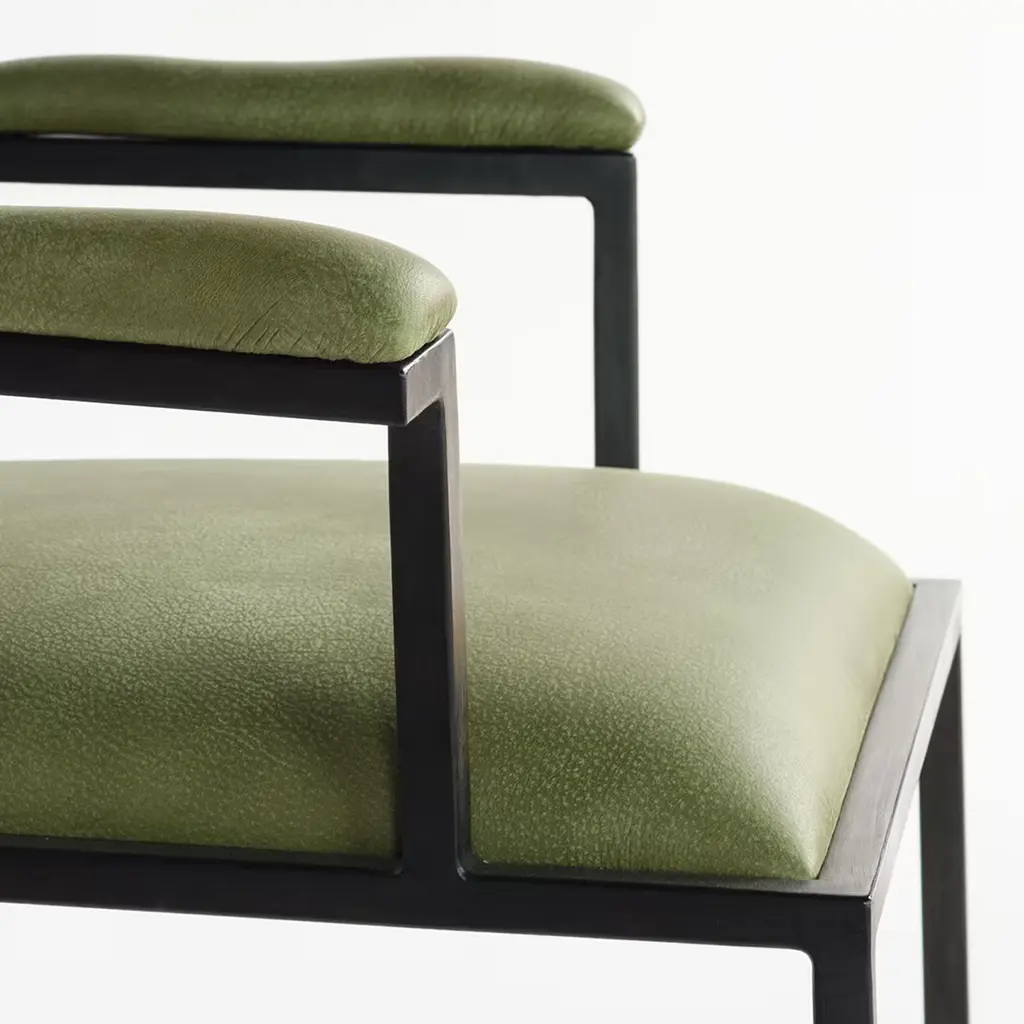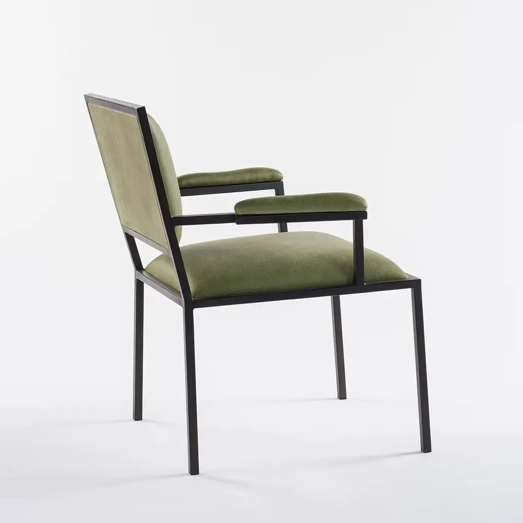 This exclusive chair was designed for the new "Ristorante Alle Scuderie" in a lightweight steel frame coated with black powder. Its clean and unadorned flair harmonizes with the elegant green-hued leather covering the cushioned seat, backrest, and straight armrests to offer a truly comfortable seating experience. This versatile and refined design is available in other leather types as well as in a polished variant of the steel frame, please contact the Concierge for further details.