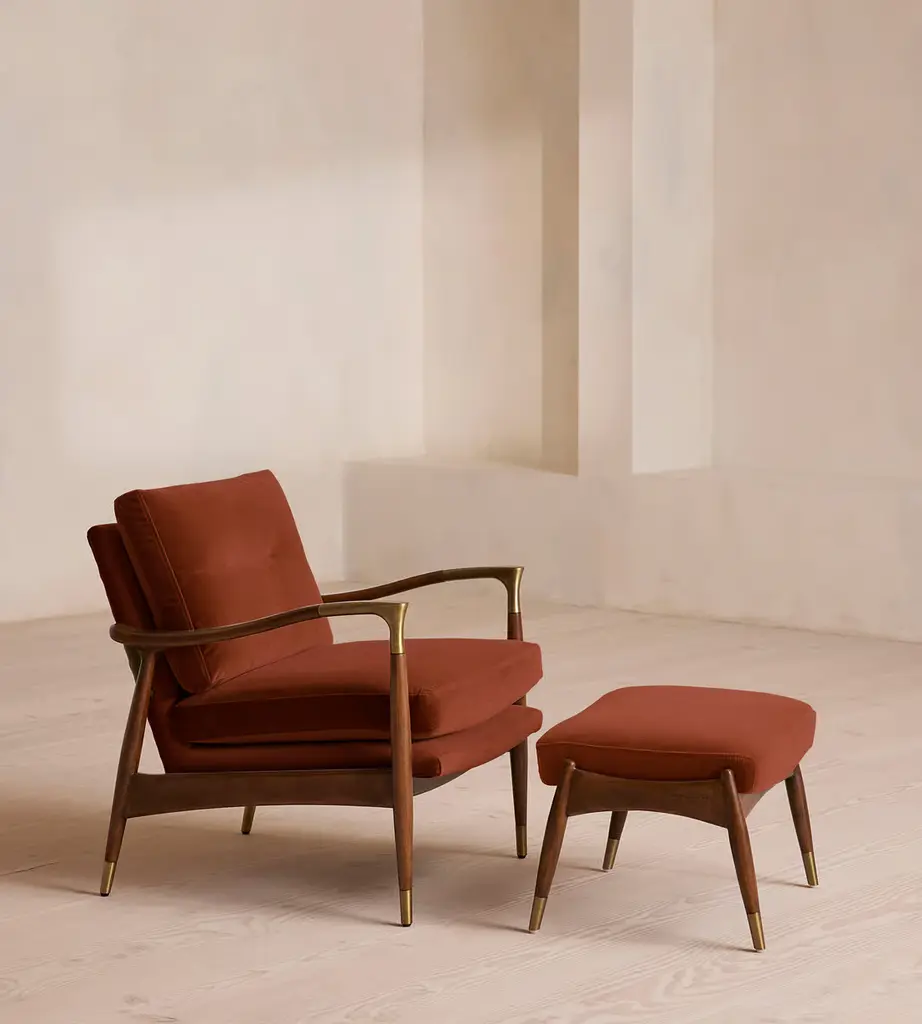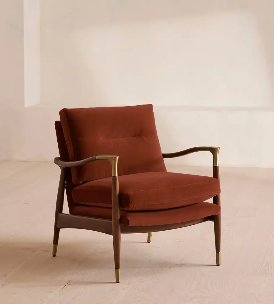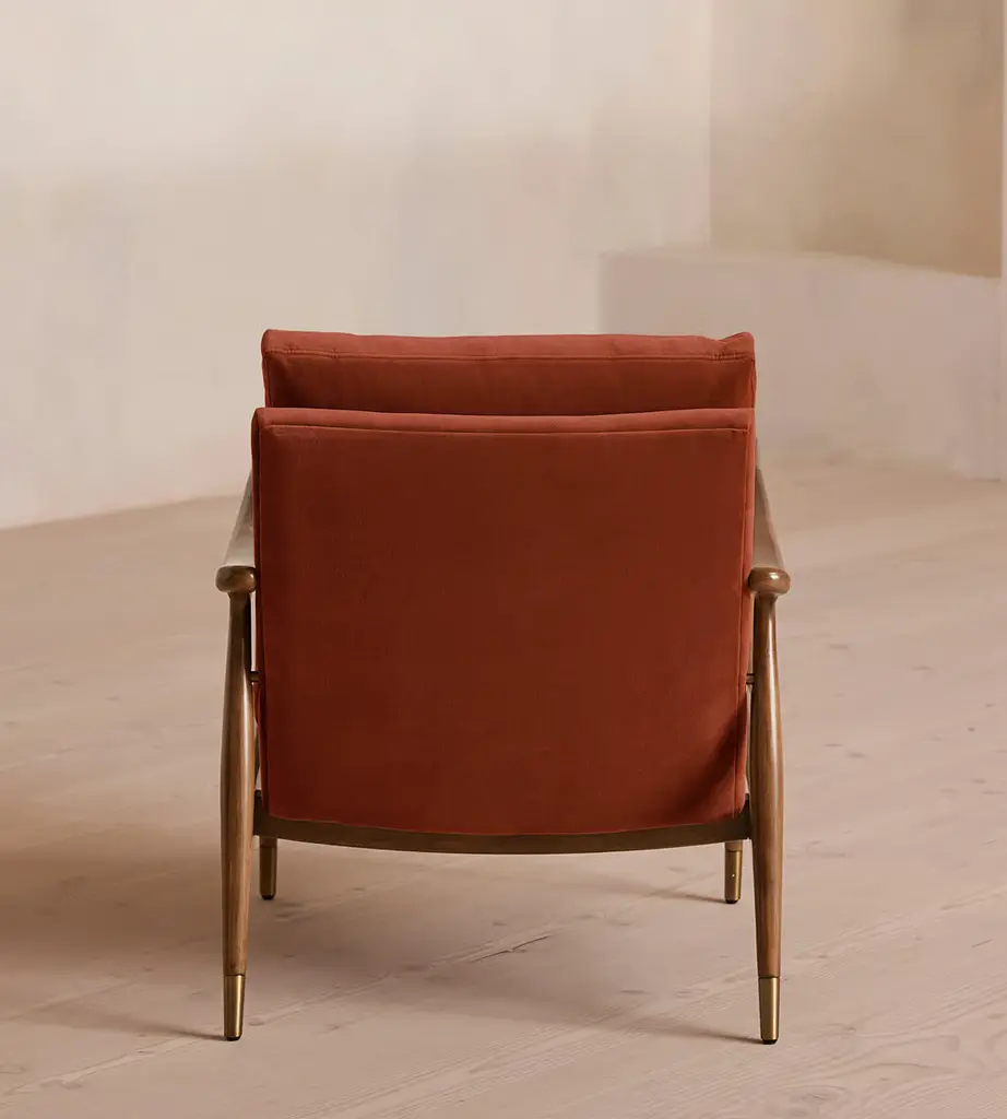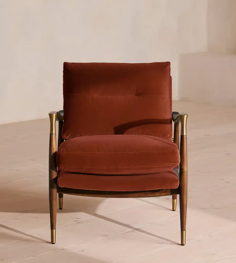 Taking cues from vintage designs at Soho House 40 Greek Street, our Theodore chair will add a fresh focal point to your living space. A comfortable, deep-sit shape with down and feather-wrapped foam cushions is upholstered in rust velvet, while the tapered birch wood frame and brass detail on the arms complement its clean lines.