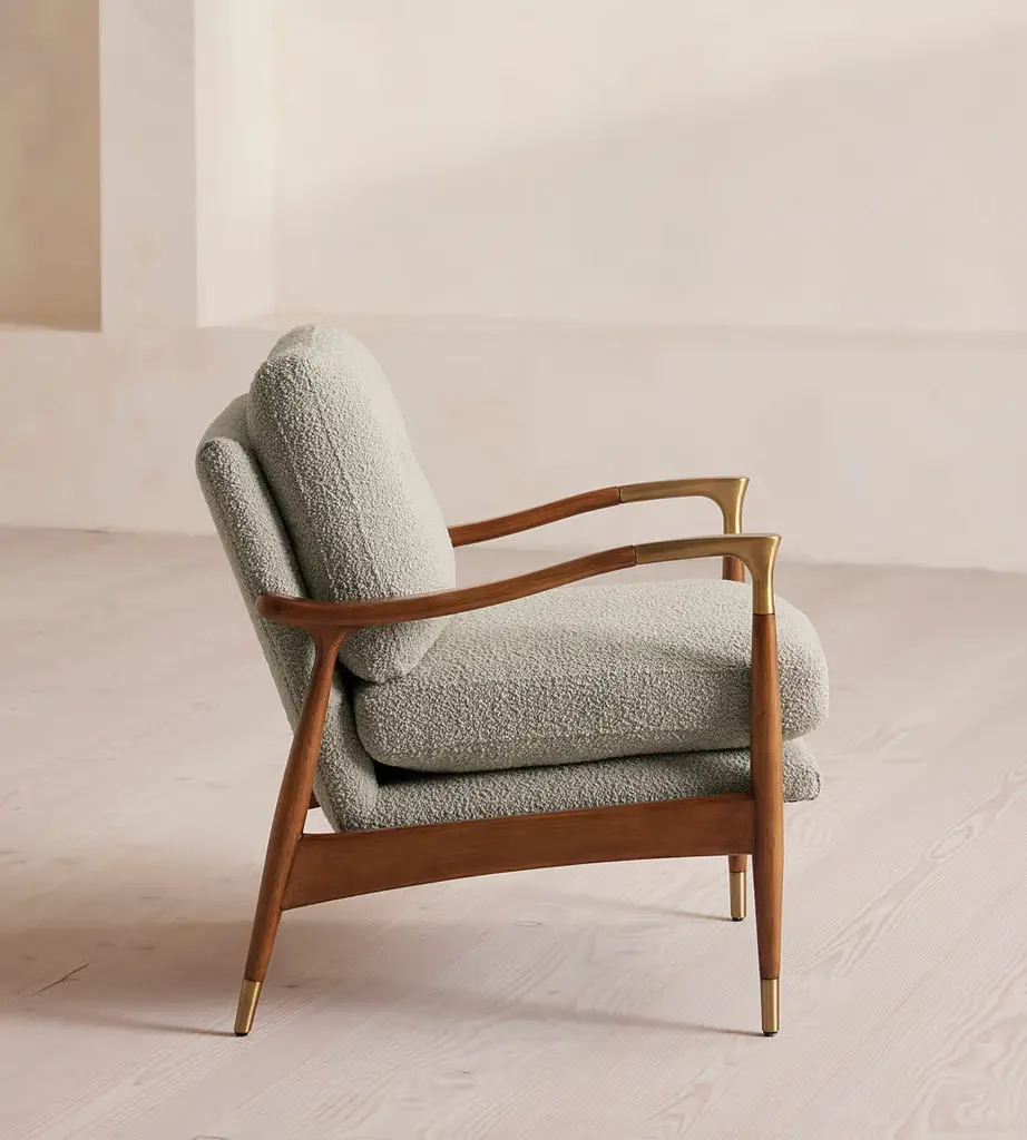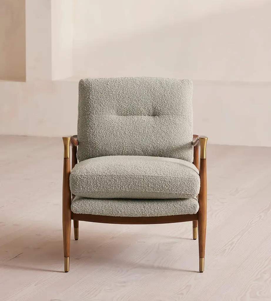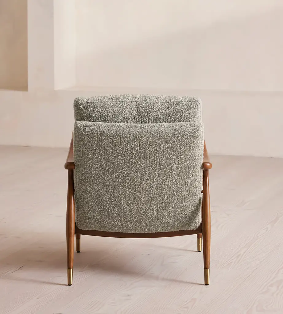A solid oak frame is fitted with feather-wrapped cushions upholstered in tactile boucle. Taking cues from the designs seen in Soho House 40 Greek Street, our Theodore armchair has a solid oak frame fitted with down and feather-wrapped cushions for a comfortable, deep sit, with antique brass caps on the legs and arms for added durability.