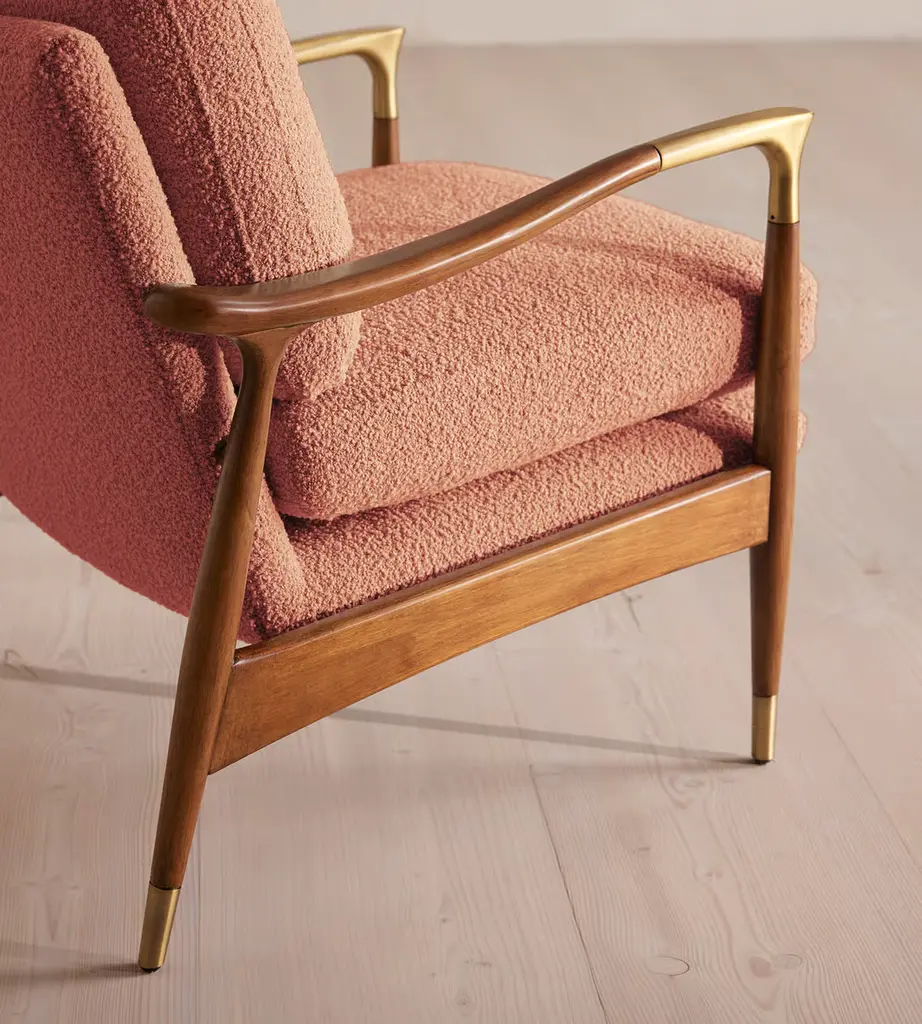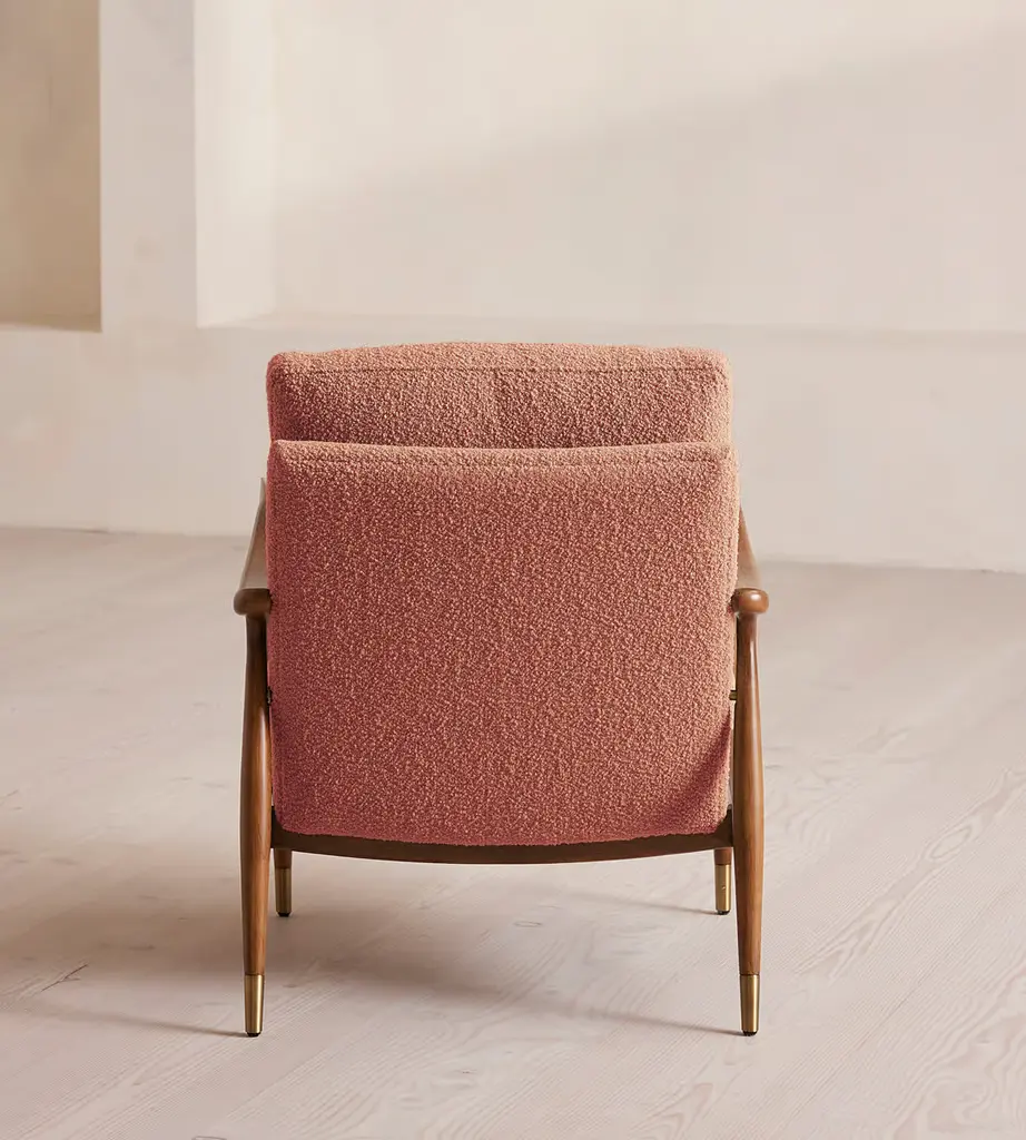 A solid oak frame is fitted with feather-wrapped cushions upholstered in tactile boucle. Taking cues from the designs seen in Soho House 40 Greek Street, our Theodore armchair has a solid oak frame fitted with down and feather-wrapped cushions for a comfortable, deep sit, with antique brass caps on the legs and arms for added durability.