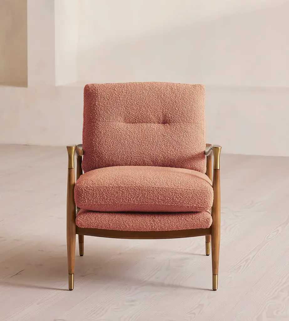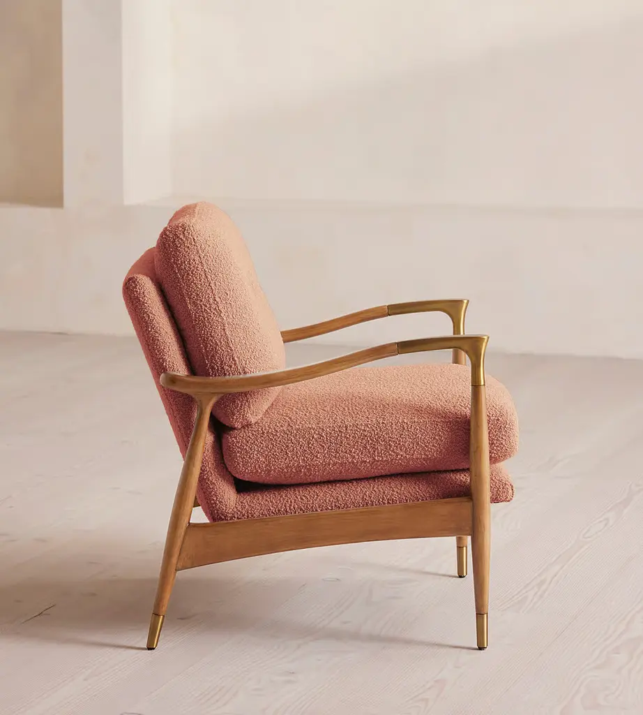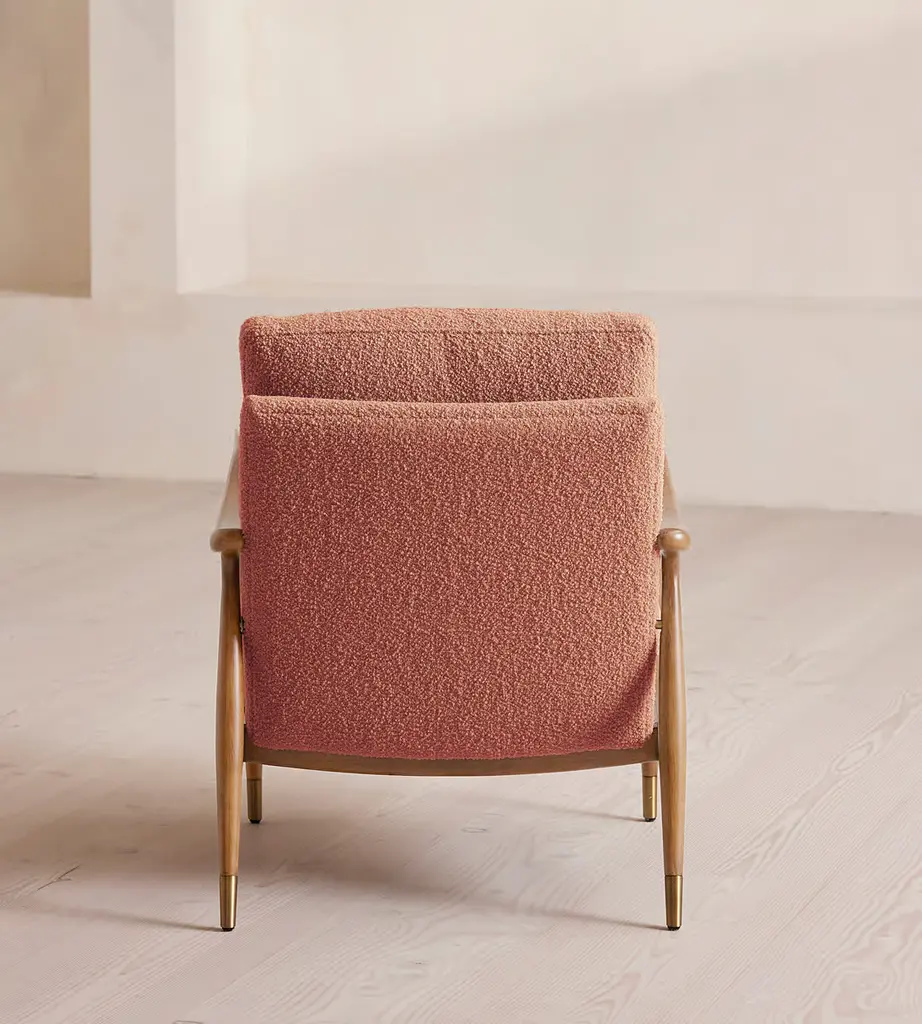 A style seen throughout our Houses, this armchair has a handcrafted frame fitted with wool boucle upholstered cushions. Taking cues from the designs seen in Soho House 40 Greek Street, our Theodore armchair remains a House favorite. Its handcrafted, solid oak frame is fitted with down and feather-wrapped cushions for a comfortable, deep sit.