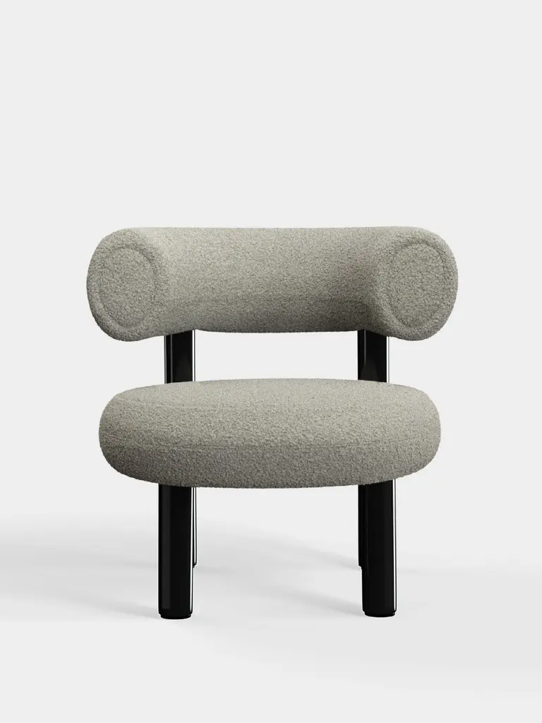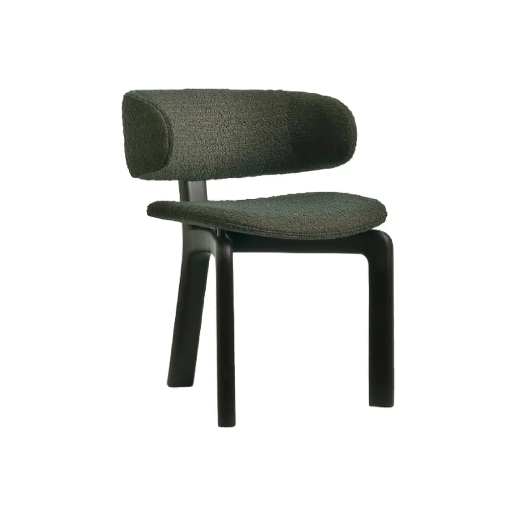 Experience elegance and sophistication with our Hunt Chair. This three-legged design features a unique and playful reinterpretation of a last century concept. Its enveloping backrest and curved legs are crafted from solid ash wood, with a sleek black finish. The seat and back are padded with comfortable polyurethane foam, and can be upholstered in your choice of fabric or leather. Elevate your space with this exclusive piece of functional art.