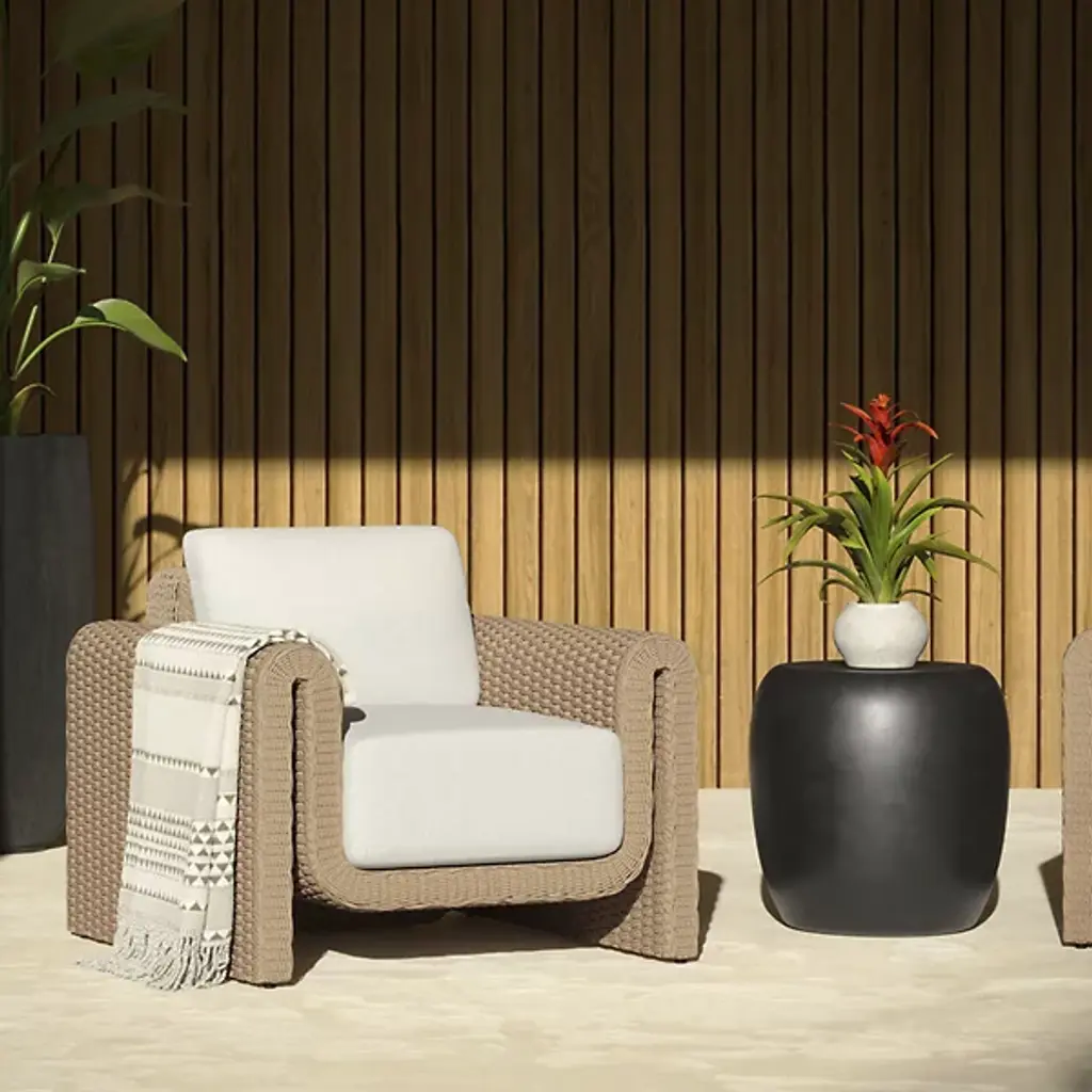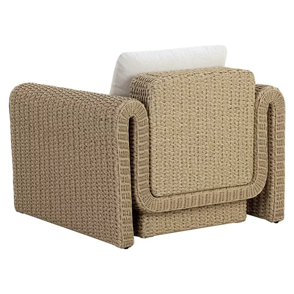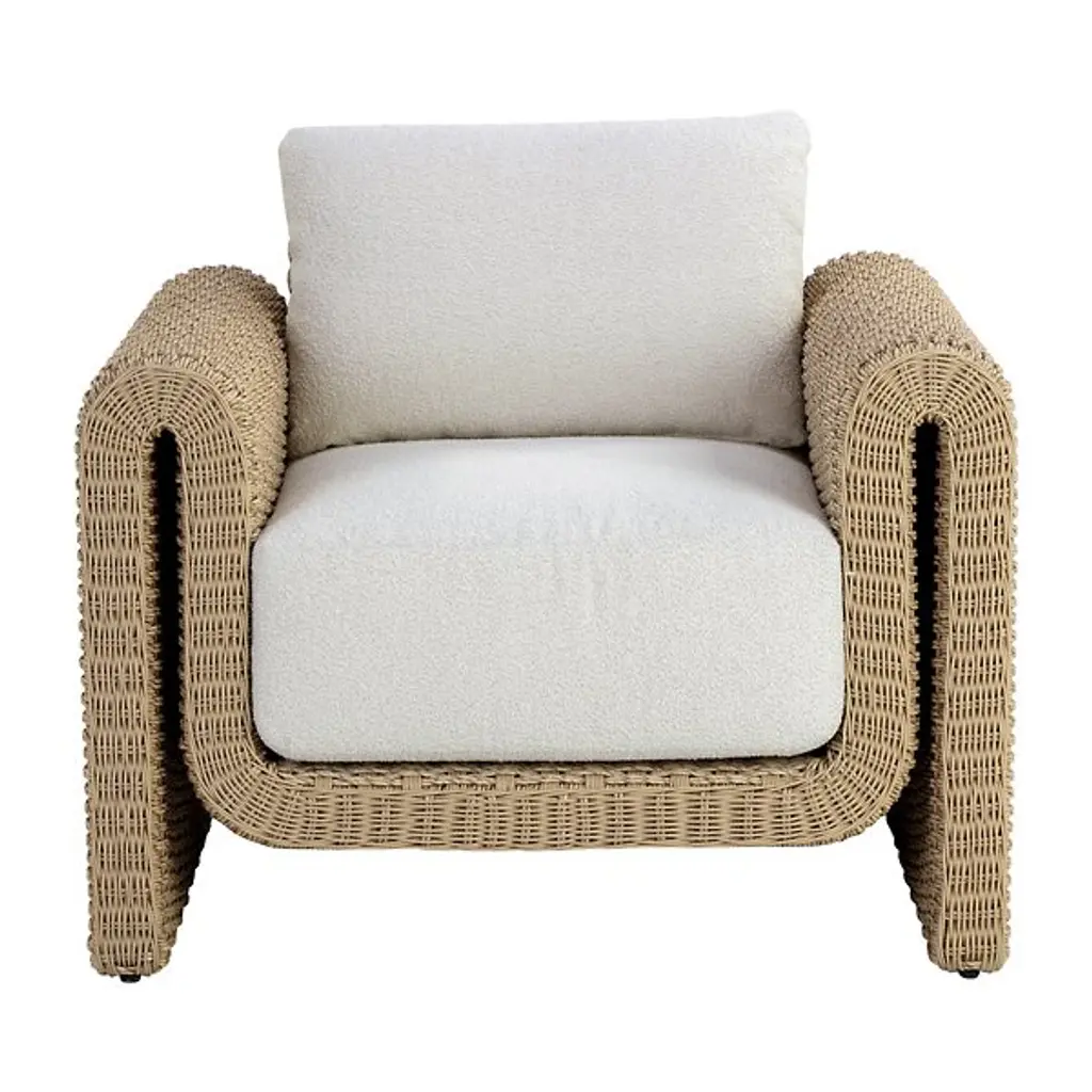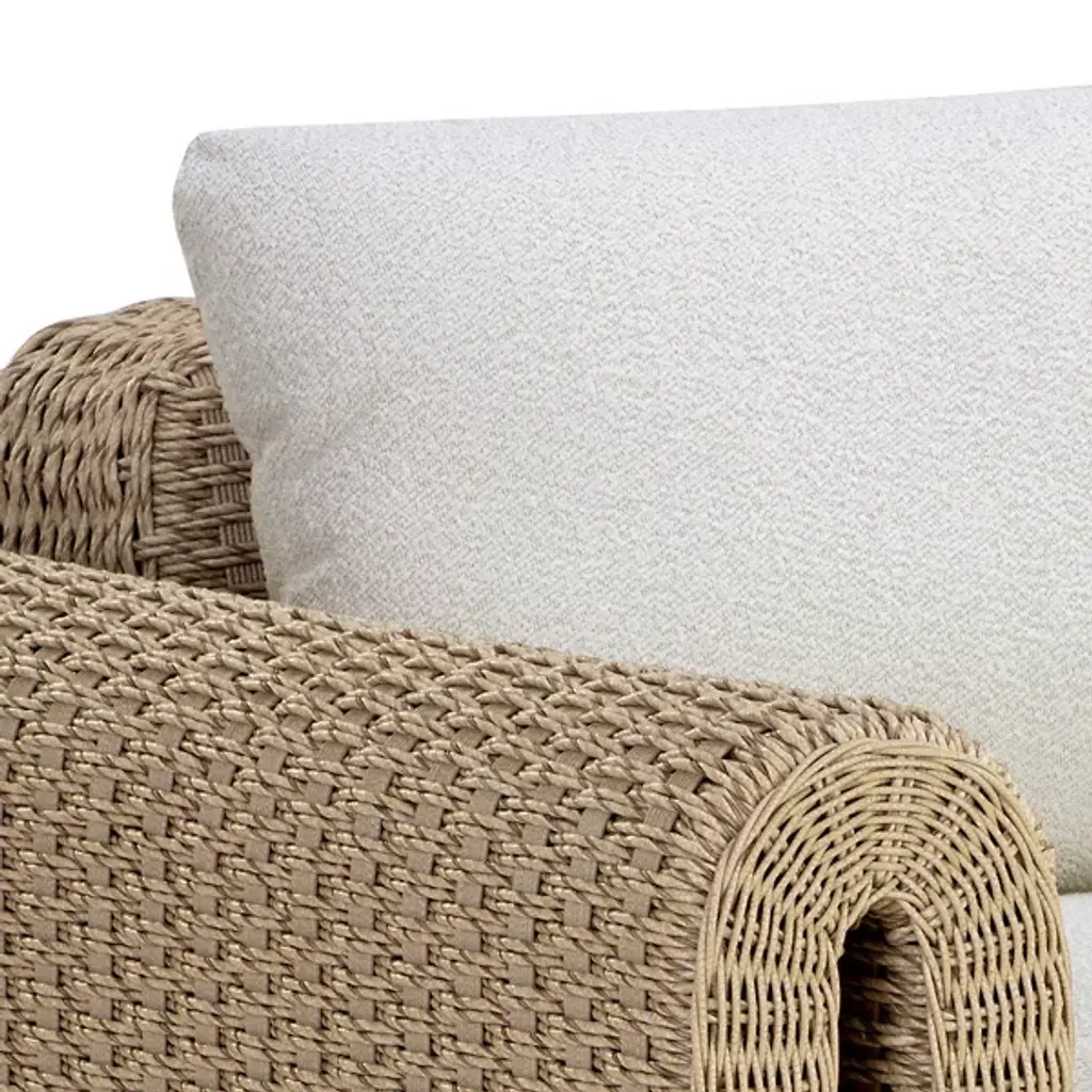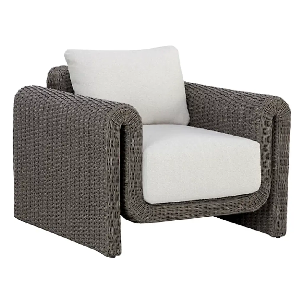 The Tibi Outdoor Lounge Chair from Sunpan brings indoor comfort to open-air spaces through its inviting proportions and thoughtful design. Inspired by the popular Romer Armchair, this Mid-century modern styling meets weather-ready performance. It features expertly woven twisted wicker that flows into rolled arms, creating a natural cradle for plush cushioning wrapped in soft yet strong outdoor-rated fabric. The powder-coated aluminum frame offers long-lasting durability, while fade-resistant synthetic wicker and tear-resistant Textilene mesh construction maintains their beauty season after season.