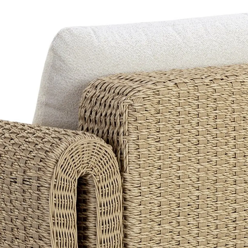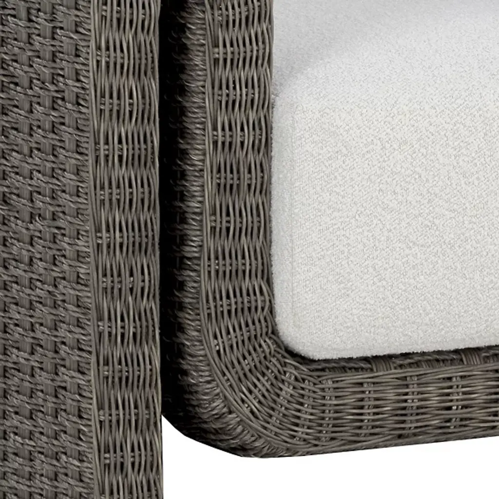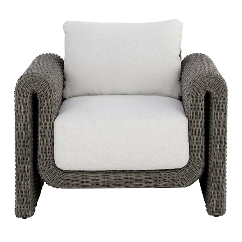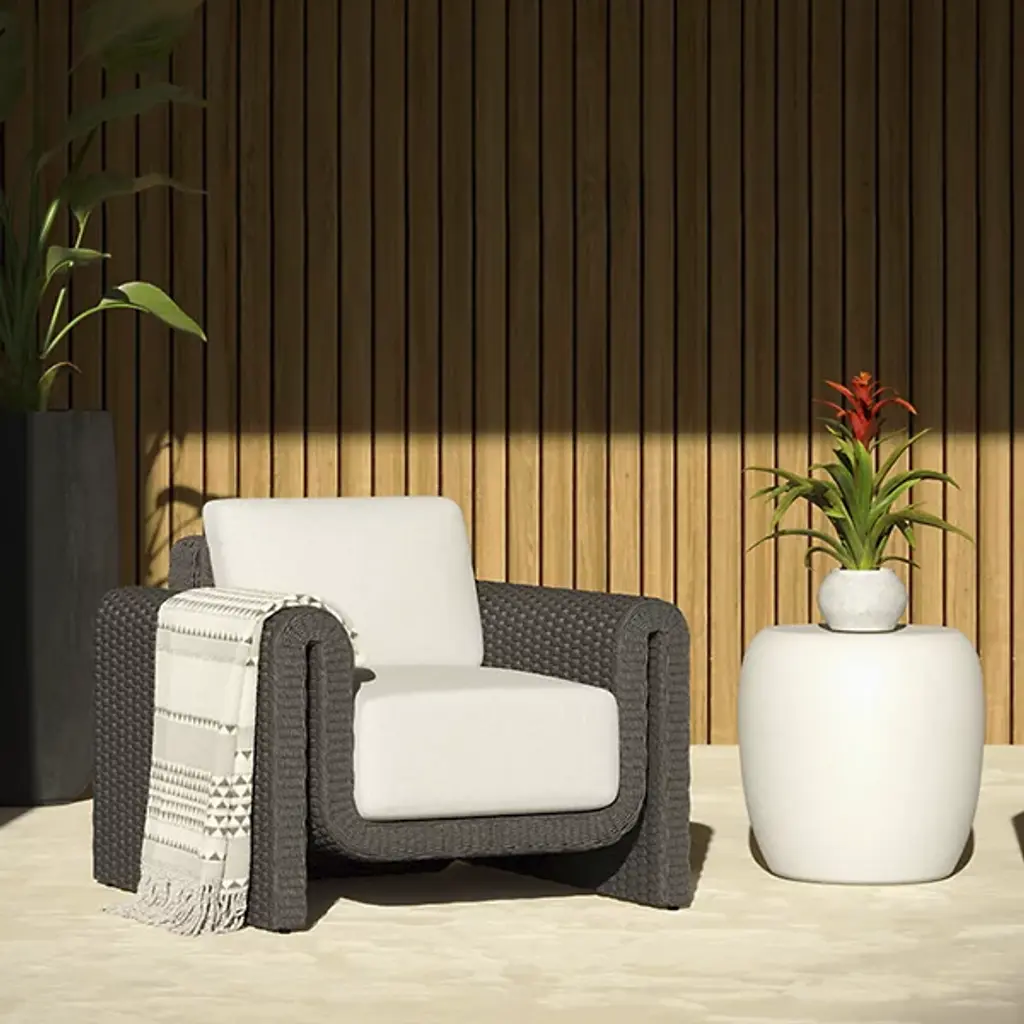 The Tibi Outdoor Lounge Chair from Sunpan brings indoor comfort to open-air spaces through its inviting proportions and thoughtful design. Inspired by the popular Romer Armchair, this Mid-century modern styling meets weather-ready performance. It features expertly woven twisted wicker that flows into rolled arms, creating a natural cradle for plush cushioning wrapped in soft yet strong outdoor-rated fabric. The powder-coated aluminum frame offers long-lasting durability, while fade-resistant synthetic wicker and tear-resistant Textilene mesh construction maintains their beauty season after season.