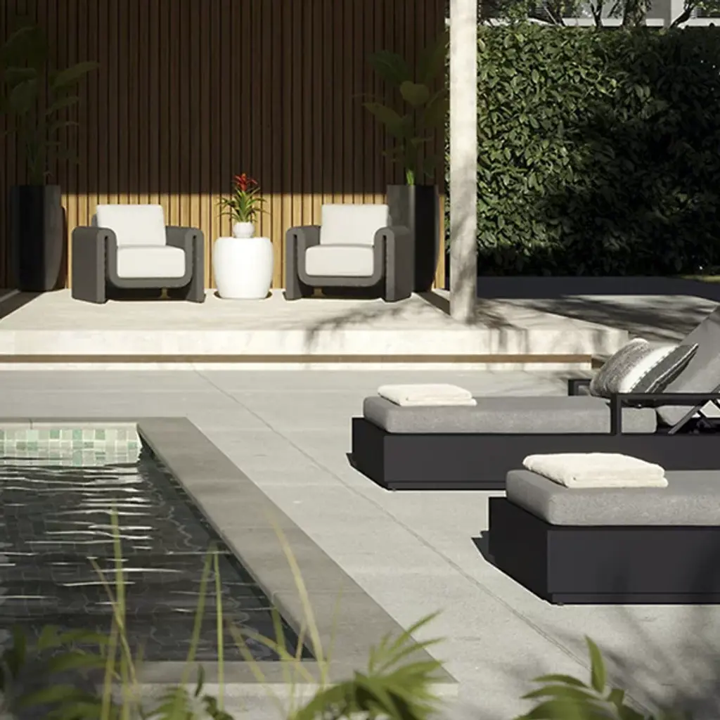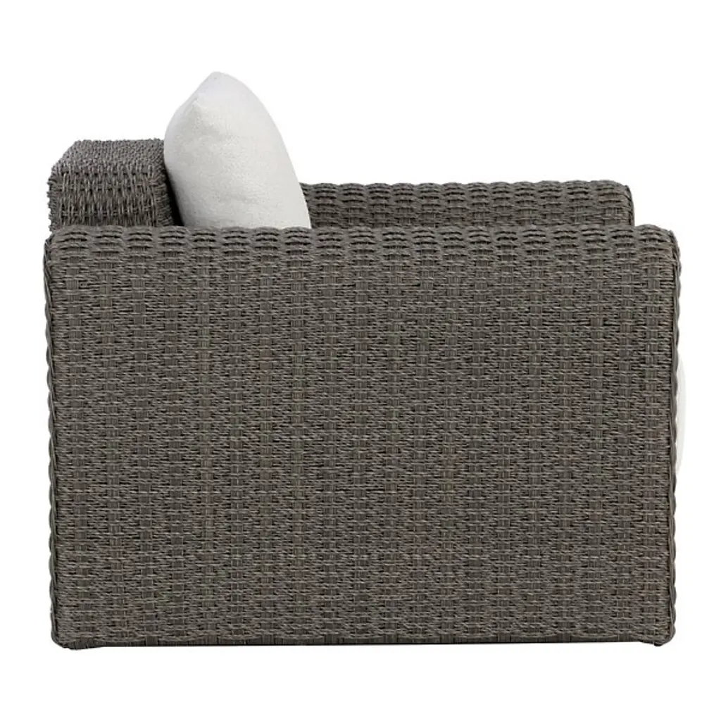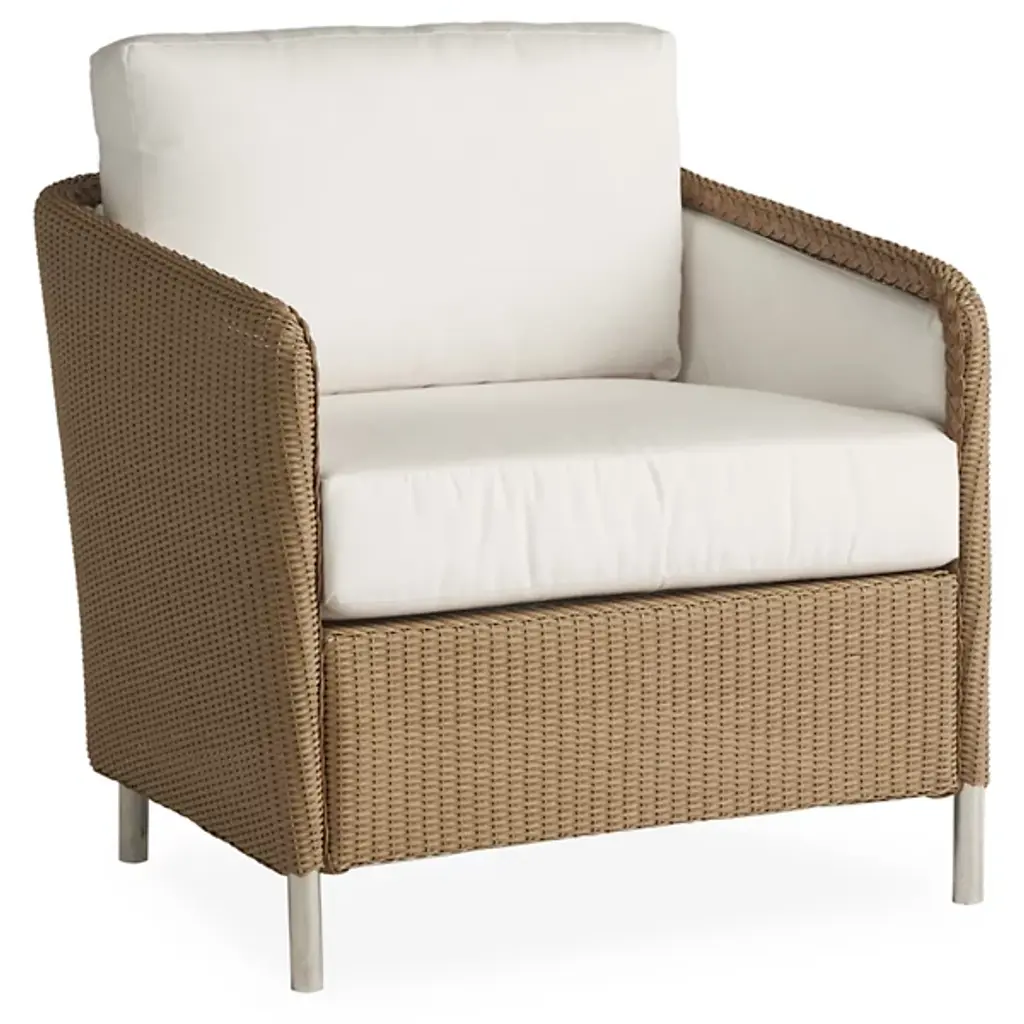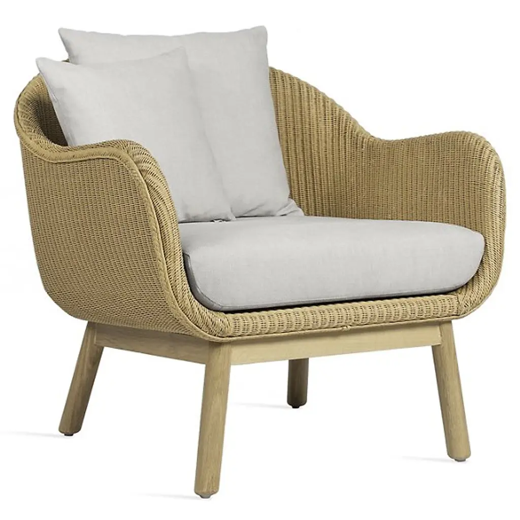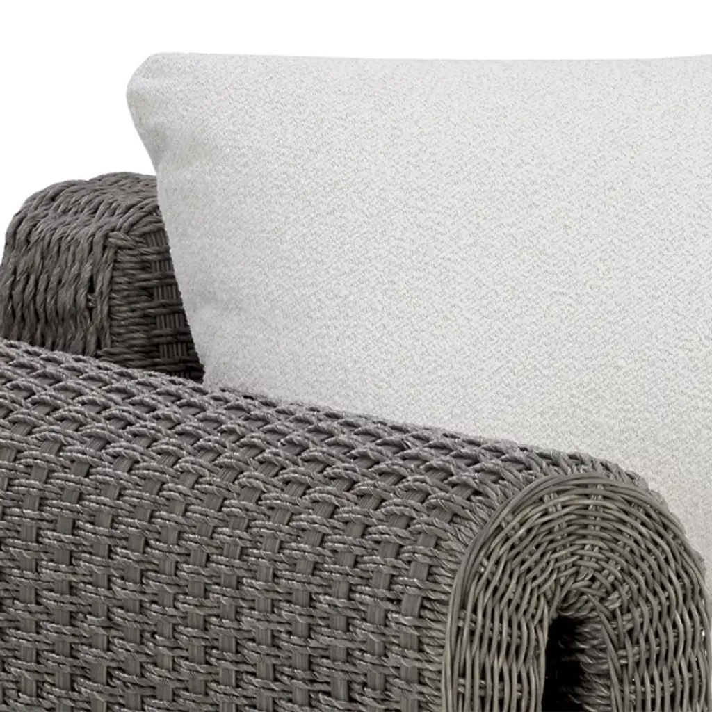 The Tibi Outdoor Lounge Chair from Sunpan brings indoor comfort to open-air spaces through its inviting proportions and thoughtful design. Inspired by the popular Romer Armchair, this Mid-century modern styling meets weather-ready performance. It features expertly woven twisted wicker that flows into rolled arms, creating a natural cradle for plush cushioning wrapped in soft yet strong outdoor-rated fabric. The powder-coated aluminum frame offers long-lasting durability, while fade-resistant synthetic wicker and tear-resistant Textilene mesh construction maintains their beauty season after season.