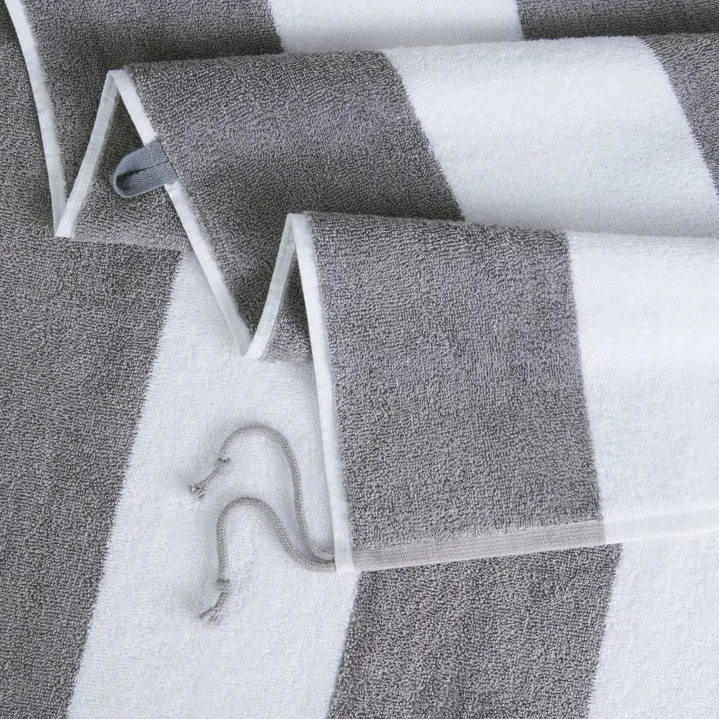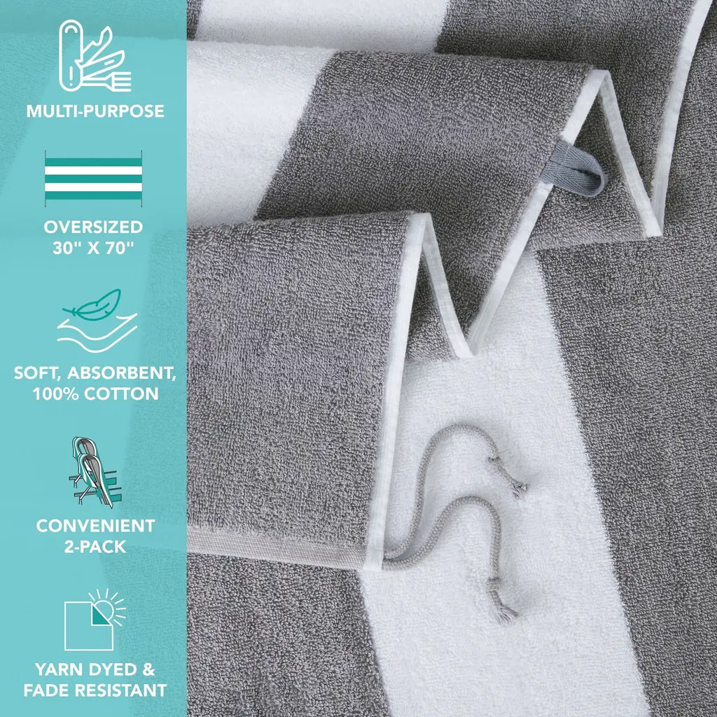 QUALITY TERRY TOWEL: Made from 20Double 100% ring spun cotton, Cabo Cabana beach & pool towels are soft, absorbent, and quick-drying. Our Cabana pool towels are woven with yarn-dyed cotton so will not fade easily. OVERSIZED POOL TOWEL: Generously sized at 30 x 70 inches, this large beach towel features an oversized surface area for drying. Customers also use our pool towels as lounge chair covers and extra-large bath towels. BEACH TOWEL COLORS: Cabo Cabana Towels feature a white base color with alternate colored cabana stripes in seven vibrant color combinations. They make a great bath towel set for your bathroom or guest room.The bright and unique color combinations will make you stand out of the crowd at a beach, pool or resort. MULTIPURPOSE CABANA TOWEL: Originally developed as a hotel pool towel, Our striped cabana beach towel pack make terrific home bath towels, hotel towels, resort beach towels, Airbnb bed and breakfast bath towels, VRBO vacation rental, gym towels, and hotel spa towels.