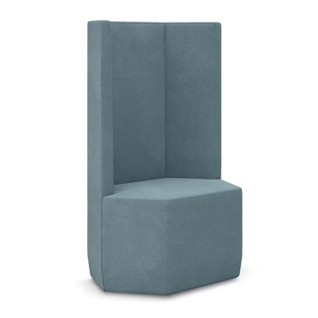 This sculptural lounge chair is sure to make an impactful statement in any contemporary decor. The hexagonal-like cut reveals its geometric inspiration, while the choice of a towering volume for the upper shell underlines its eccentric character. The quietly elegant Air Force-blue hue of the two-way stretch polyester bouclé fabric upholstery tempers the general sharpness.