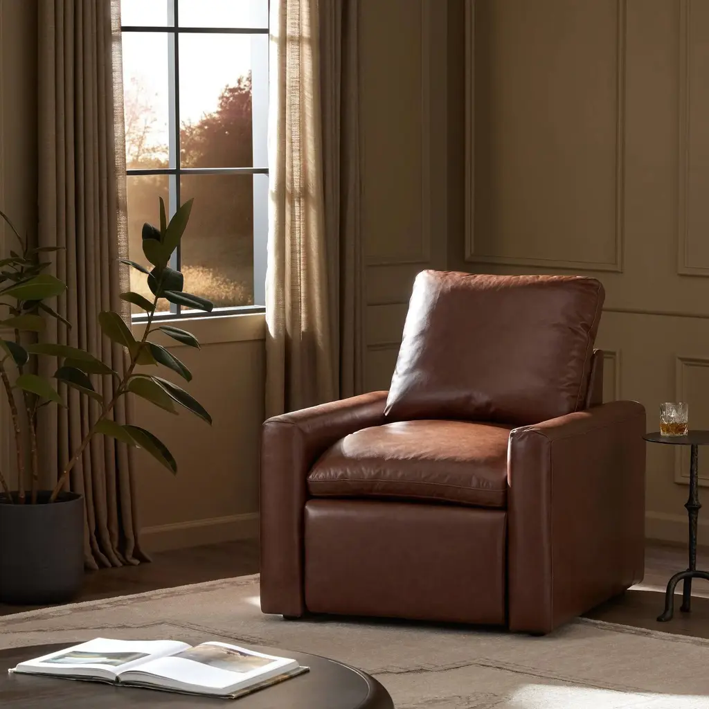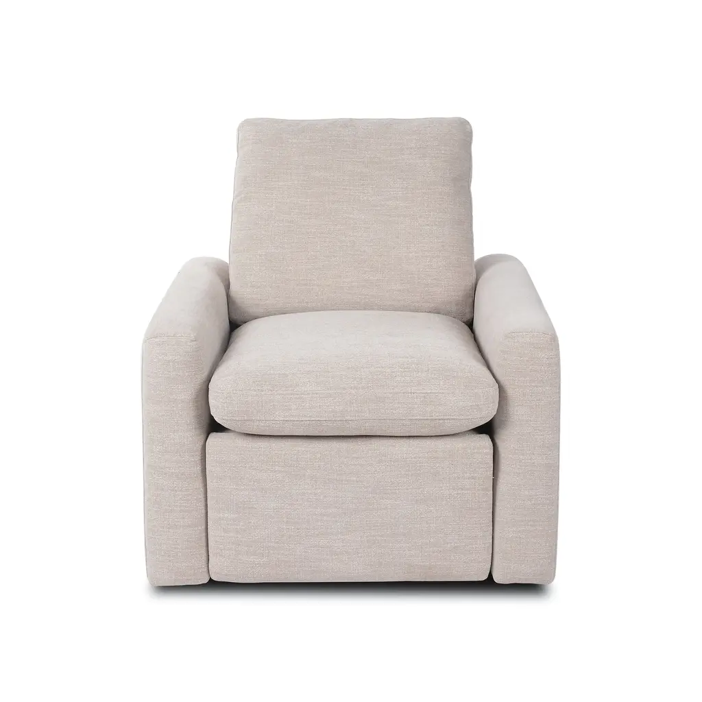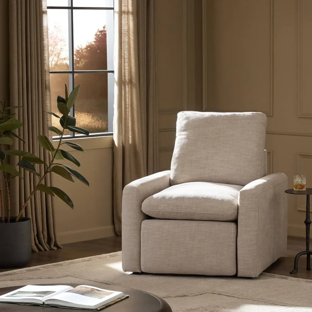 Elevate your relaxation experience with the Tillery Power Recliner Accent Chair from Four Hands. This modern twist on the traditional recliner offers customizable comfort with hidden button controls. Enjoy a higher seat and backrest, sleek arms, and a motion footrest. The plush feather-blend cushions provide ultimate comfort while the zero-clearance design allows for placement against any wall. Each motor comes with a two-year warranty, making this chair a luxurious addition to any space. Highlights