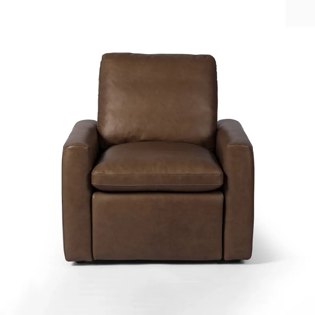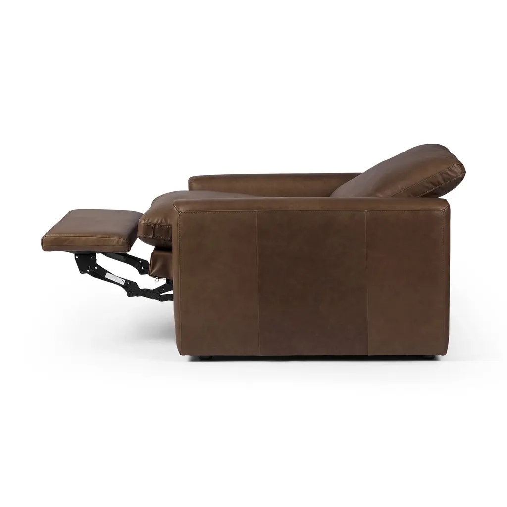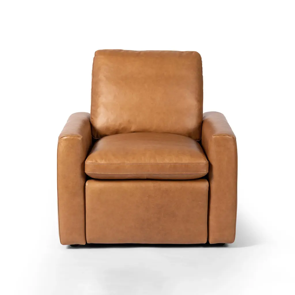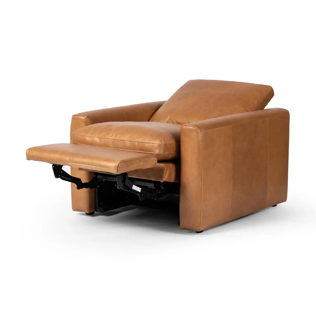 Elevate your relaxation experience with the Tillery Power Recliner Accent Chair from Four Hands. This modern twist on the traditional recliner offers customizable comfort with hidden button controls. Enjoy a higher seat and backrest, sleek arms, and a motion footrest. The plush feather-blend cushions provide ultimate comfort while the zero-clearance design allows for placement against any wall. Each motor comes with a two-year warranty, making this chair a luxurious addition to any space. Highlights