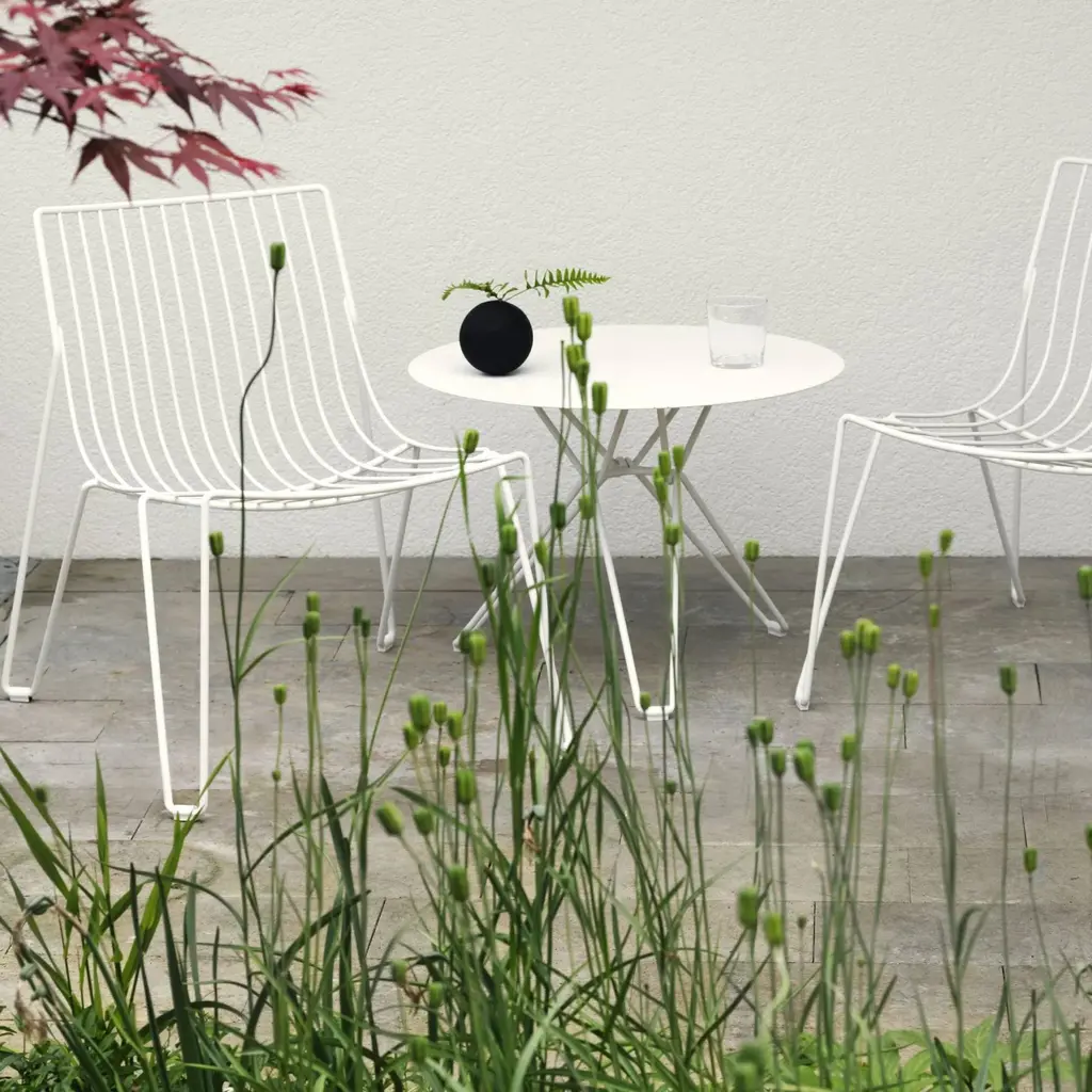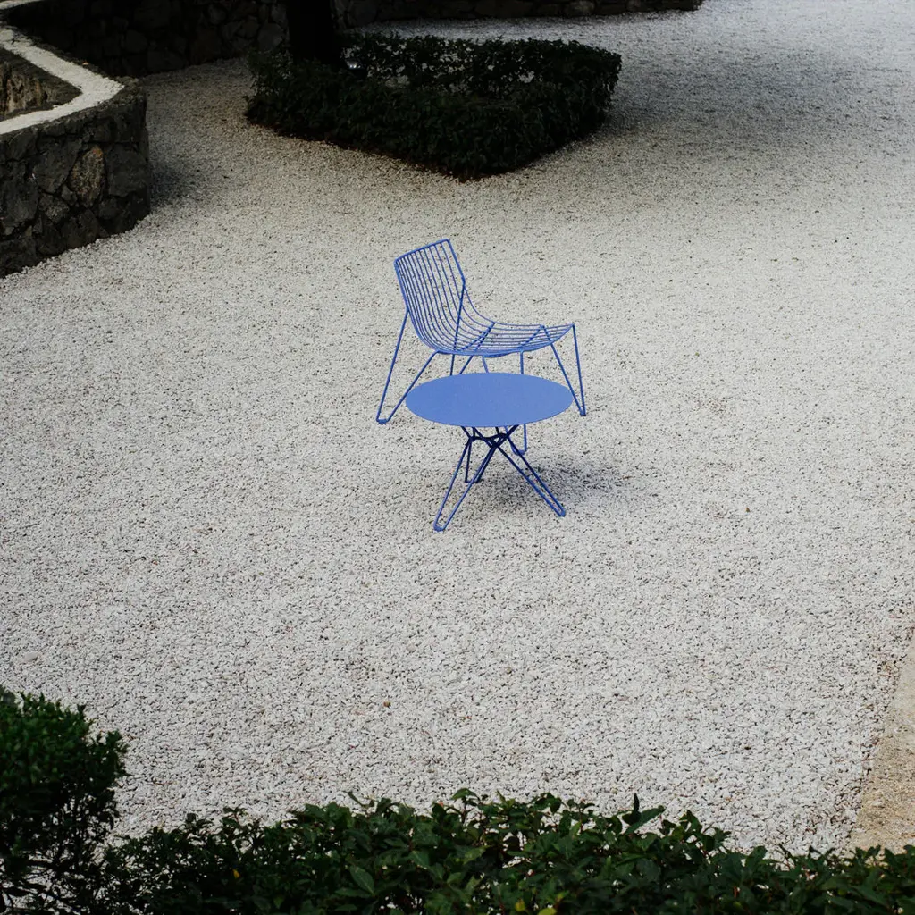 Easy does it in this lounge version of the award-winning Tio Chair. As with the other seating in the line, it's versatile and stackable, fabricated in sturdy polyester powder-coated galvanized wire. And in 10 purposeful colors (with or without the option of a padded seat, available separately), Tio fits in anywhere, inside or outdoors. Chris and design partner Magnus Elebäck take outdoor-indoor furniture to another level via their Stockholm-based firm, Massproductions. The extensive Tio collection offers high-quality tables to seating, in a range of incarnations. "Our goal is to use industrial processes to create furniture which people can get excited about," says Chris. "Something that gives them pride of ownership. You can do that with a hand-crafted piece, but for us the satisfaction comes from achieving it with an industrially produced article.