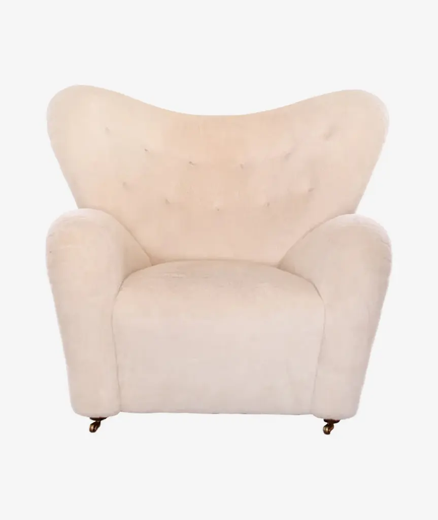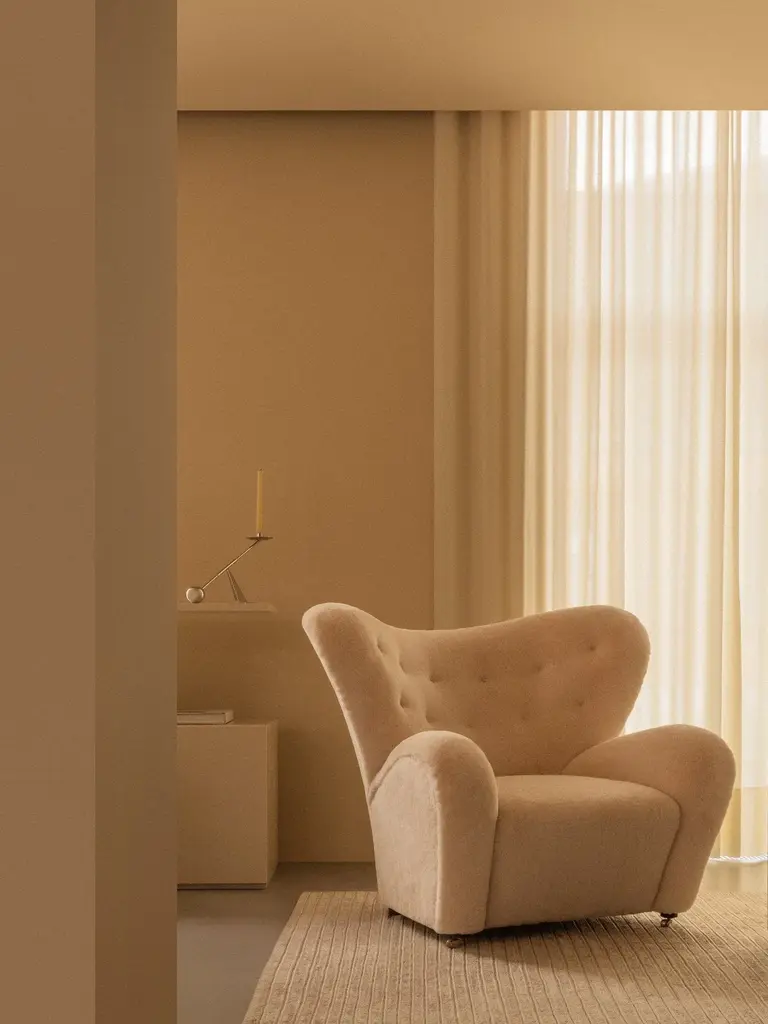 The Tired Man was launched at the Copenhagen Cabinetmakers’ Guild Exhibition in 1935 and has since become an icon of Danish design. The epitome of craftsmanship and comfort, the characteristically curved armchair was designed by Flemming Lassen to feel “as warm and snug as a polar bear cub in the arms of its mother.” Relaunched in 2015, the award-winning design is offered in plush upholstery, including sheepskin in a nod to the original, and with natural or dark-oiled oak heartwood legs and front brass casters for easy movement. A corresponding footstool ensures further comfort.