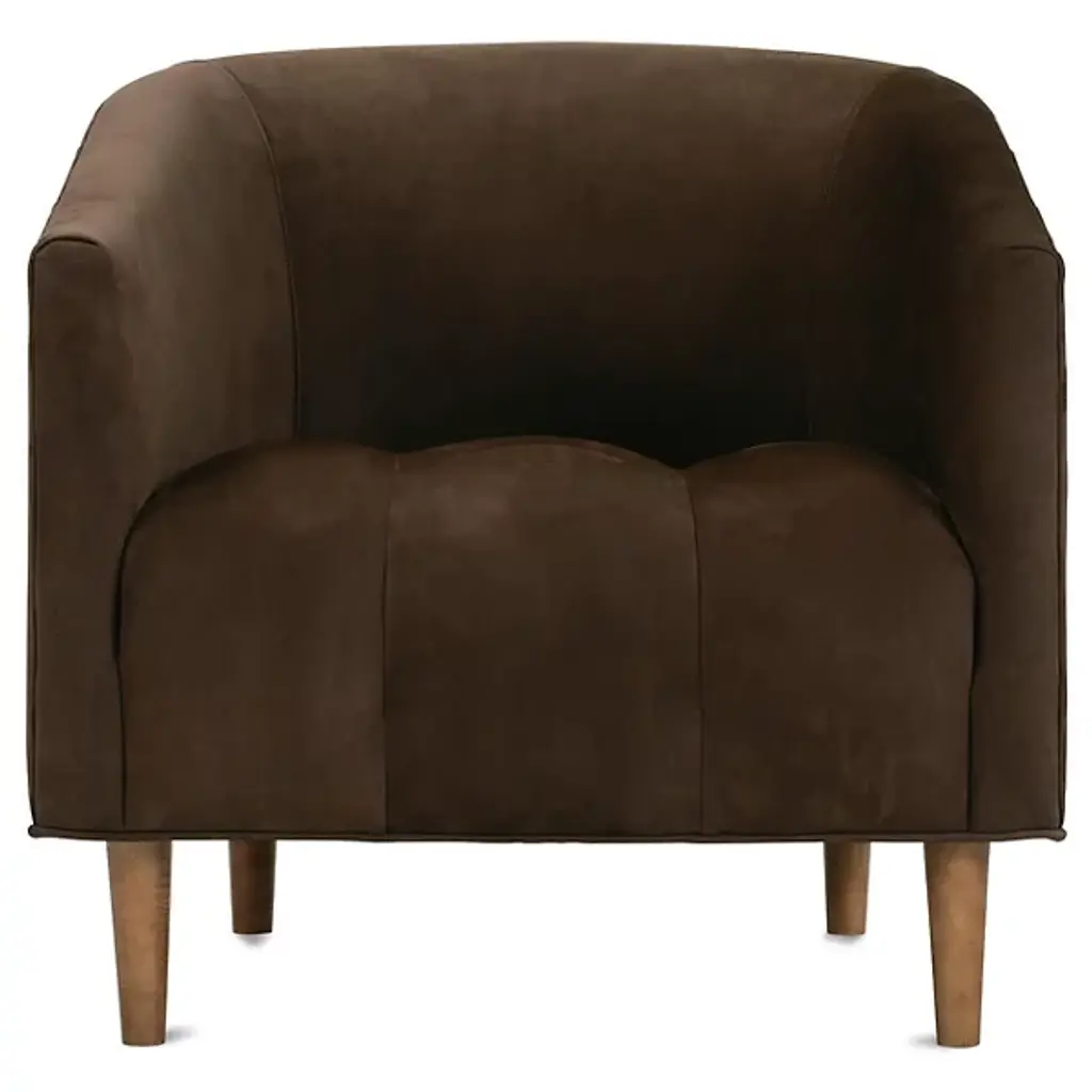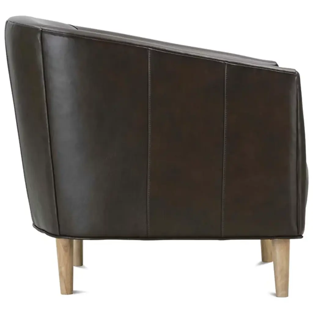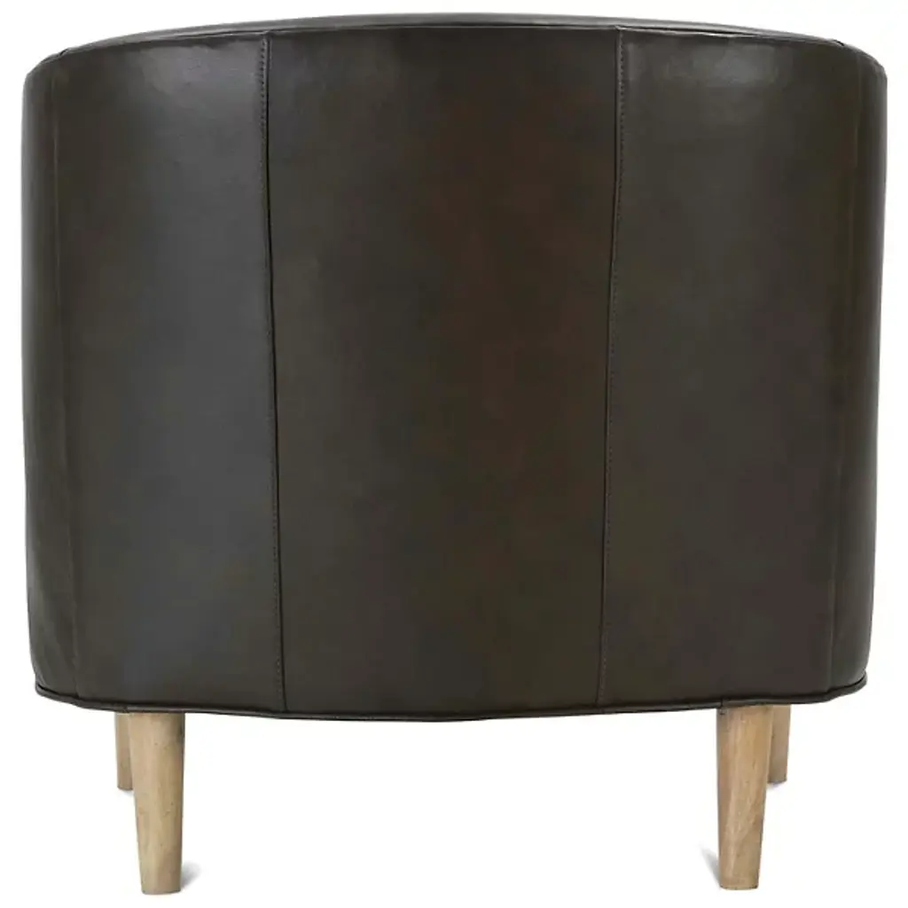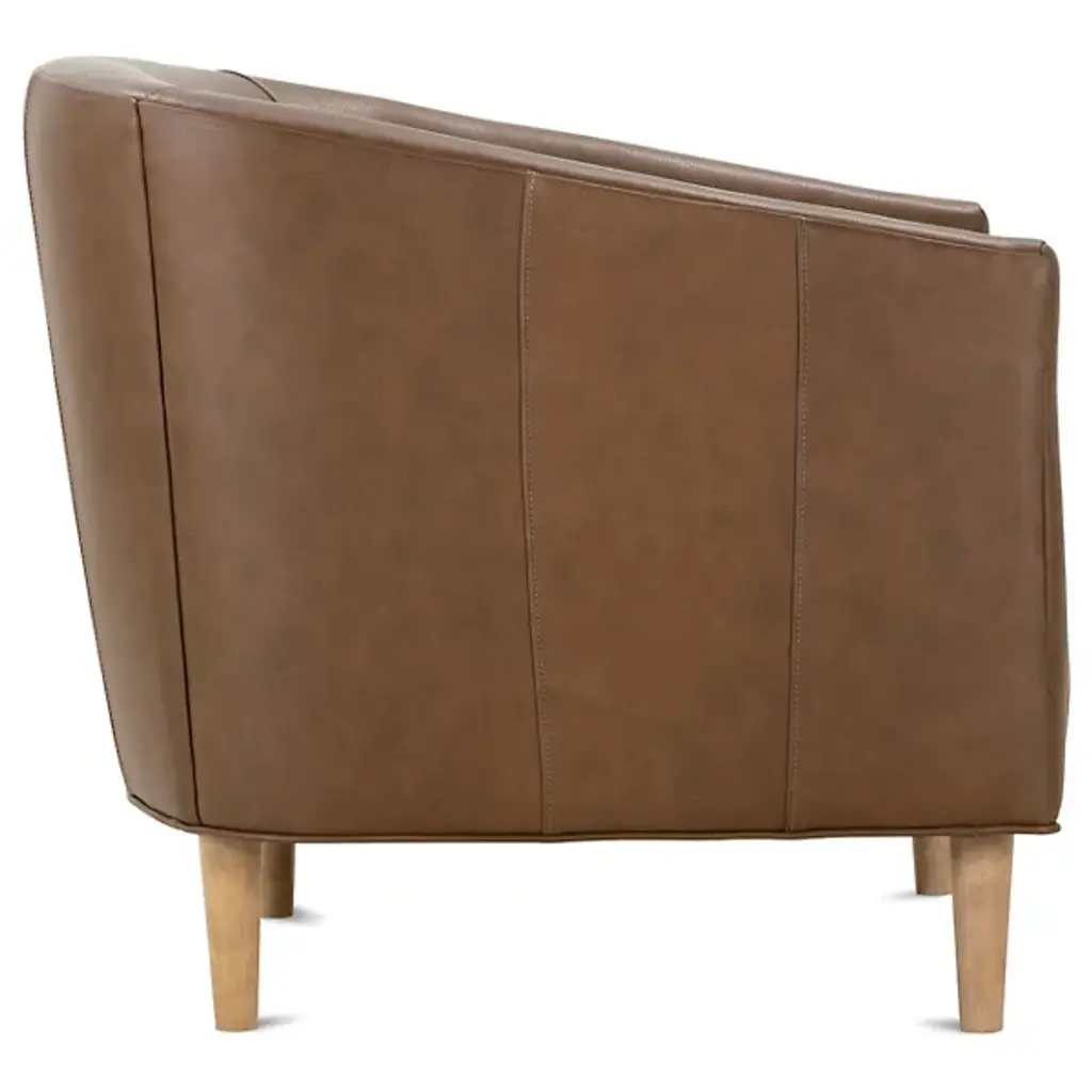 The Tiva Leather Accent Chair from Alder & Ore is a classy addition to your living space. It has a curved profile to keep you comfortably enveloped as you sit on exquisite leather for maximum relaxation. This accent chair is supported by durable wooden legs that further accentuate the natural quality of this piece. The chair has a contemporary design, making it versatile. Sleek, straight-track arms add a modern touch.