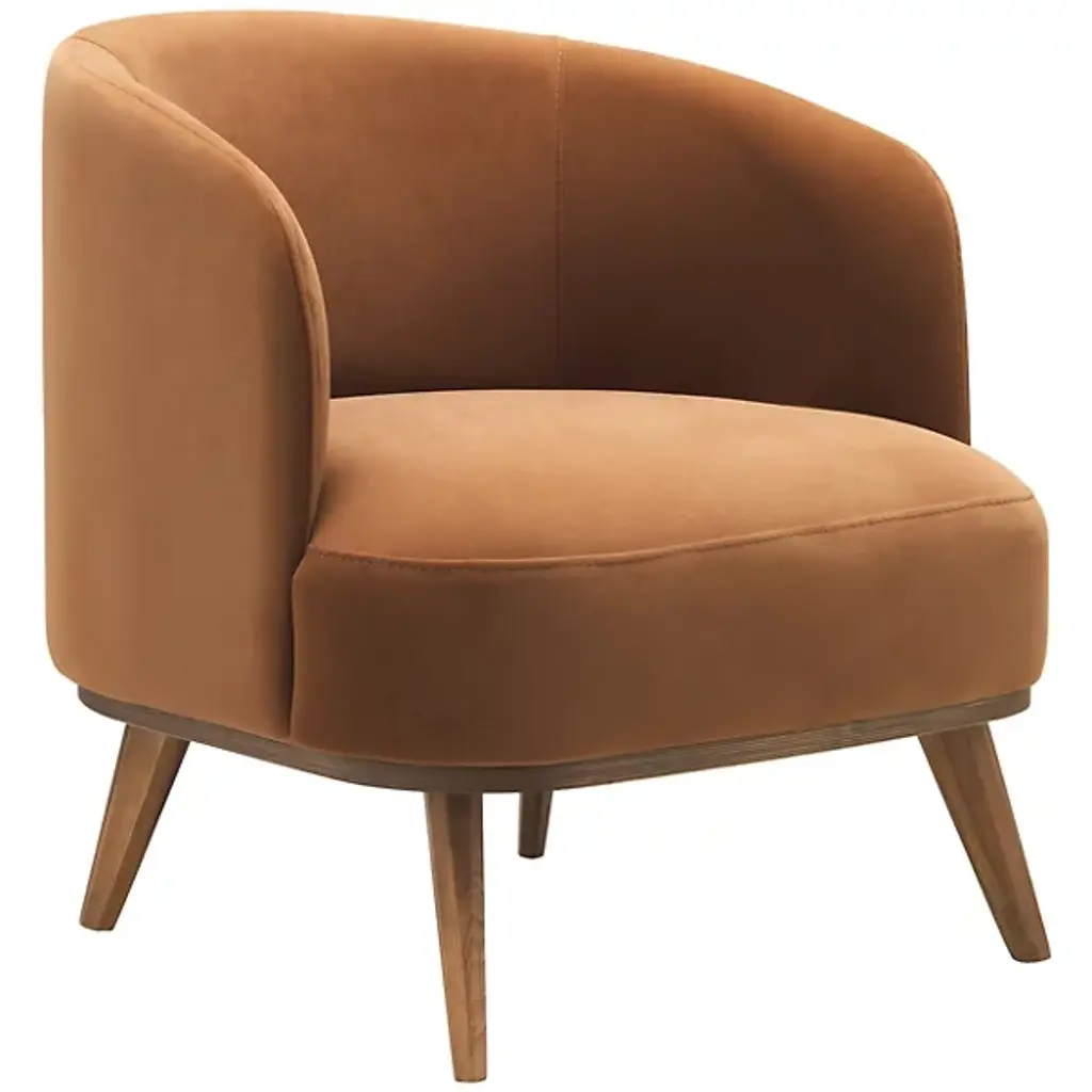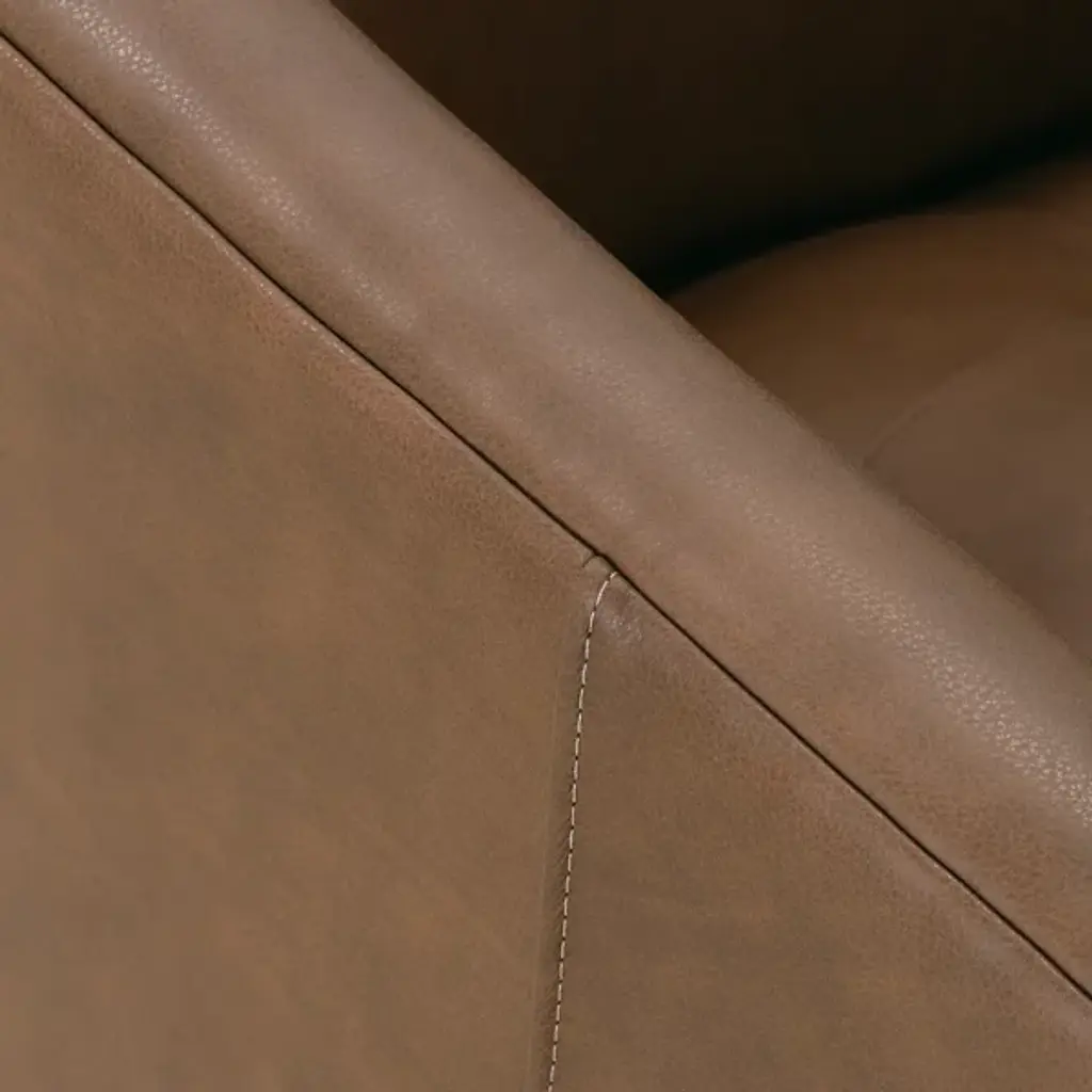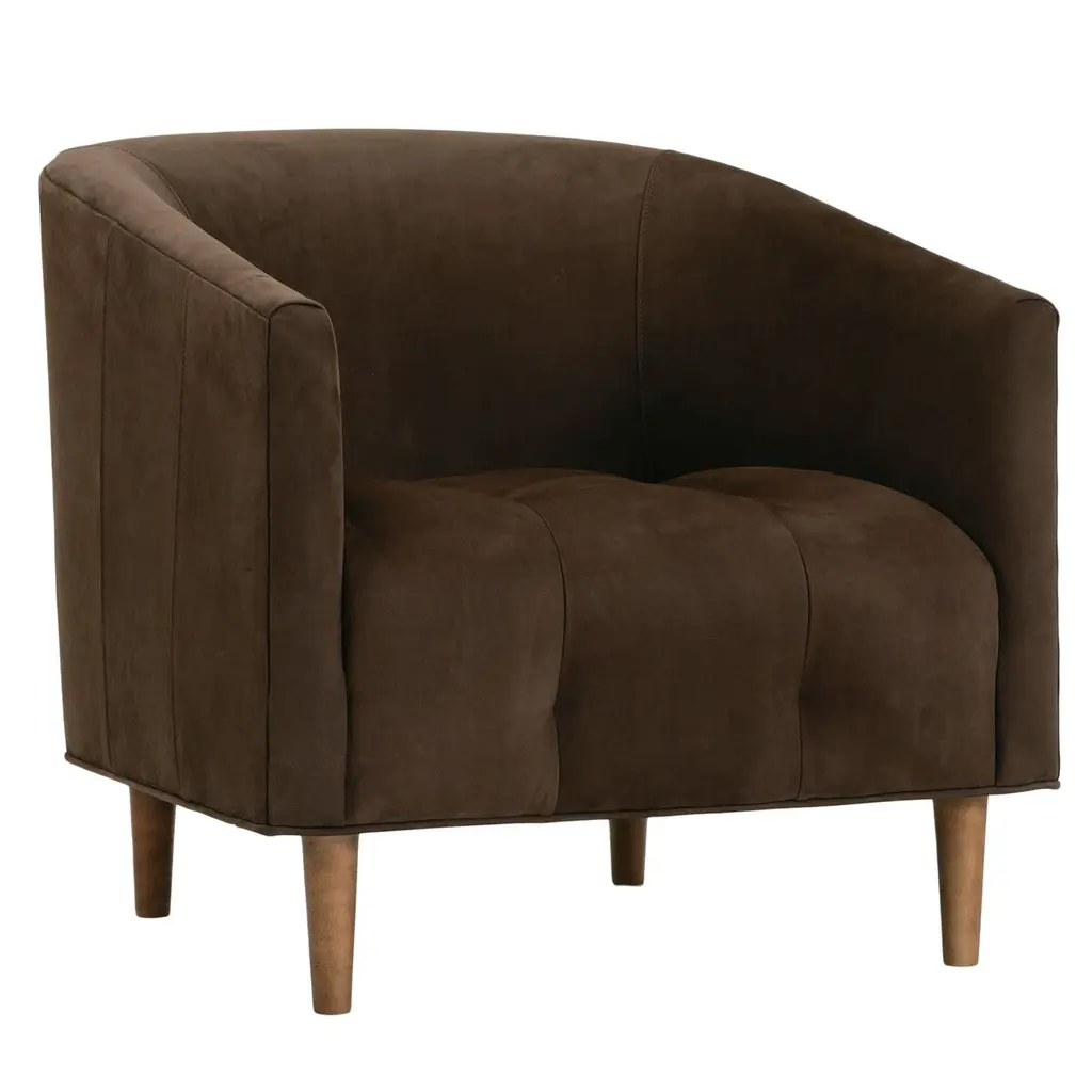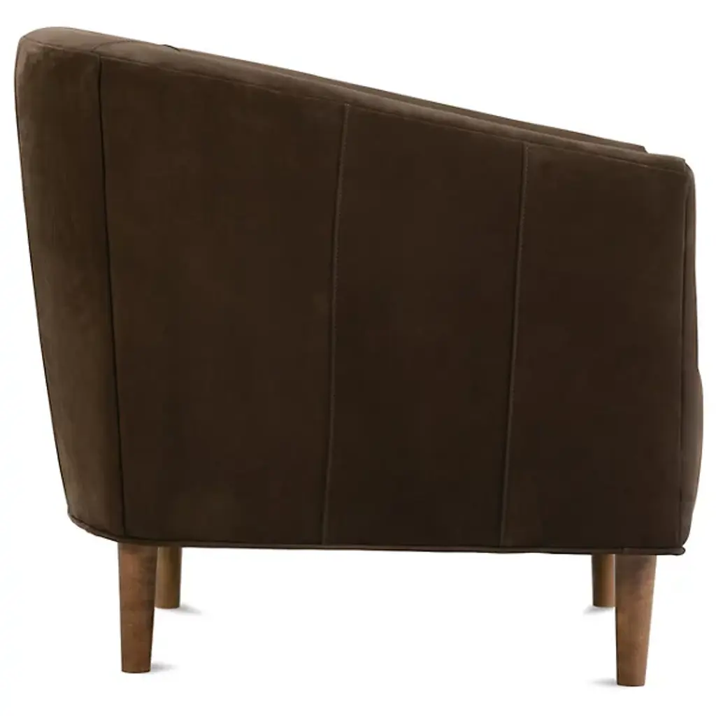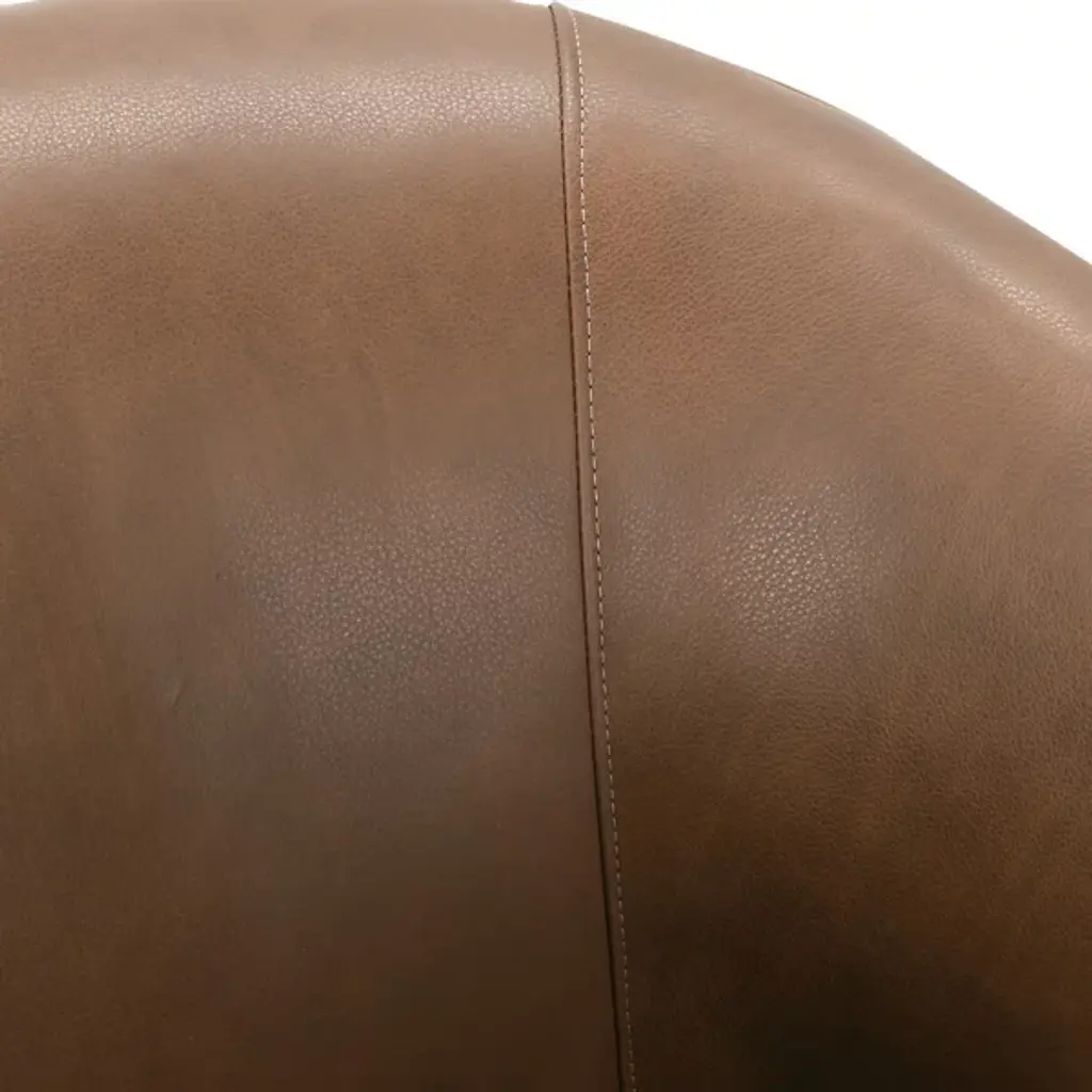 The Tiva Leather Accent Chair from Alder & Ore is a classy addition to your living space. It has a curved profile to keep you comfortably enveloped as you sit on exquisite leather for maximum relaxation. This accent chair is supported by durable wooden legs that further accentuate the natural quality of this piece. The chair has a contemporary design, making it versatile. Sleek, straight-track arms add a modern touch.