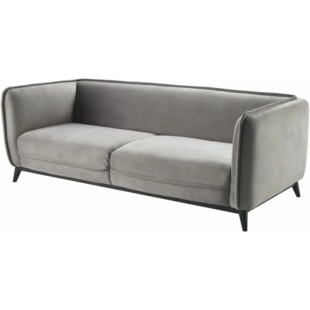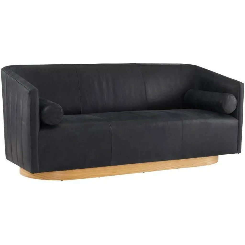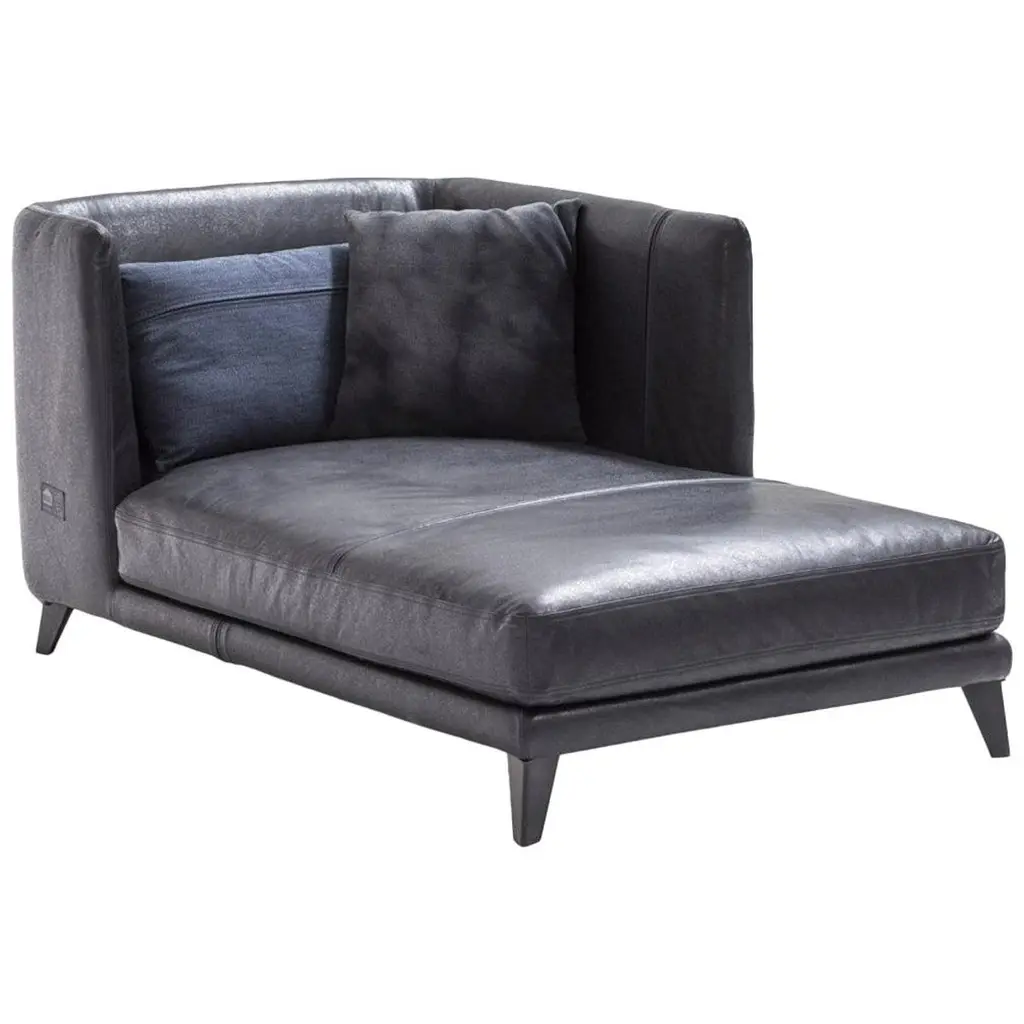 The sculpted look distinuishing this armchair merges clean lines softend by smoothed corners. Raised on four egg-shaped ash feet (also in polished aluminum upon request), the design counterbalances an inner steel frame with a structure in directional European plywood. The padding in natural latex and organic cotton is entirely covered in mineral-tanned, gray-hued leather with evident stitching meant to accent its peculiar silhouette.