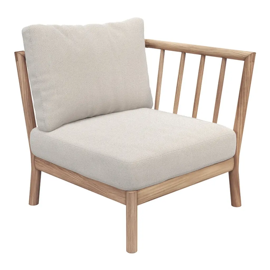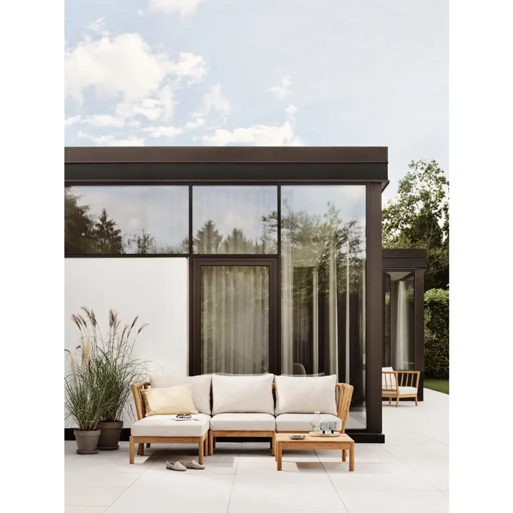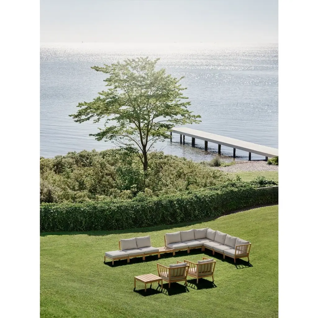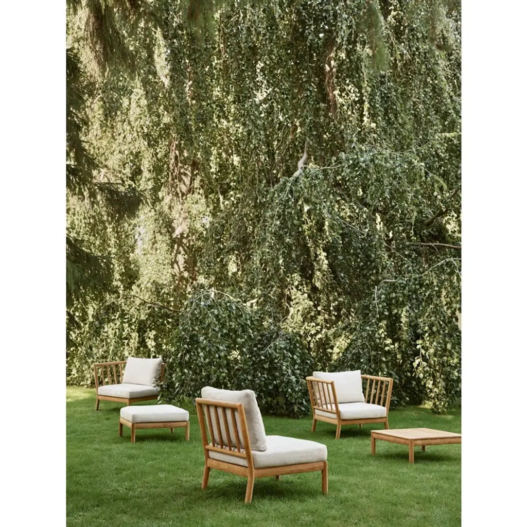 Skagerak's Tradition lounge chair is part of a teak wood outdoor collection that combines classic esthetics with a modular structure, making it easily customisable and thus suitable for spaces of various sizes. This lounge chair features a beautiful spindle backrest and plush seat cushions, which are upholstered in weather-resistant Sunbrella acrylic fabric and filled with quick-drying foam. Complete your inviting summer oasis with other pieces from the Tradition series. The Tradition patio furniture was created by Danish designer Povl B. Eskildsen. Having grown up with one foot in a teak furniture factory, Eskildsen's extensive experience with teak is evident in the furniture's skilful details and serene simplicity, which leaves room for the wood's natural beauty. You can preserve the teak's original warm tone by regularly oiling the surface or allow it to slowly patina to an attractive gray shade.