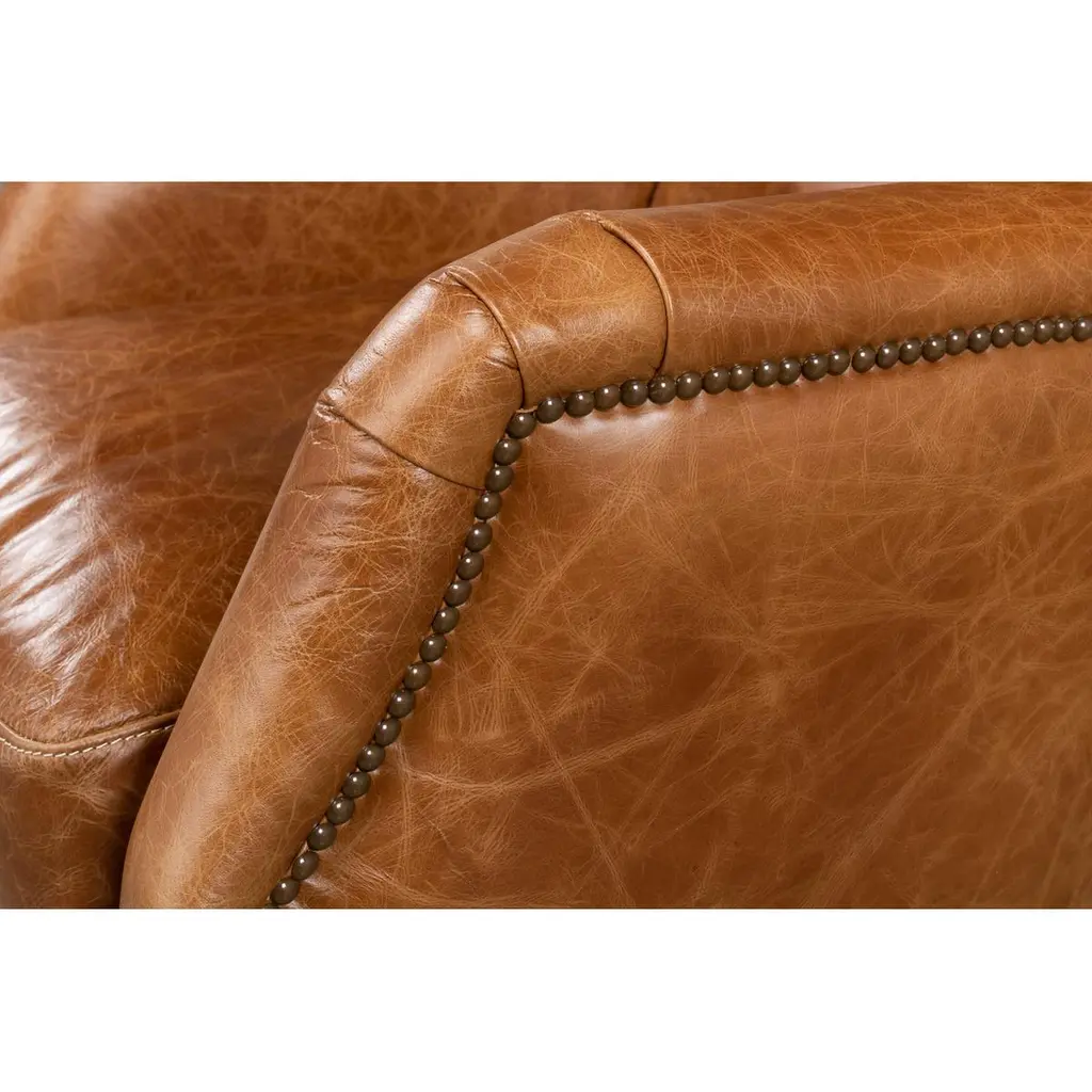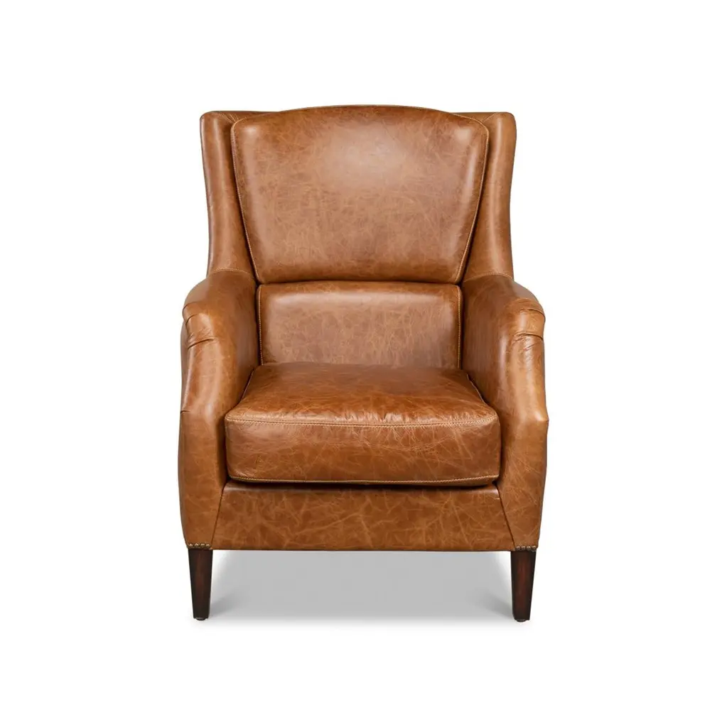 A traditional brown leather armchair with nailhead trim accents. This classic chair is crafted with pure Aniline top-grade leather in a Cuba brown color.Dimensions: 30" W x 39" D x 41" HSeat - 15" HArm - 23" HColor variation is common and acceptable on vintage leather.