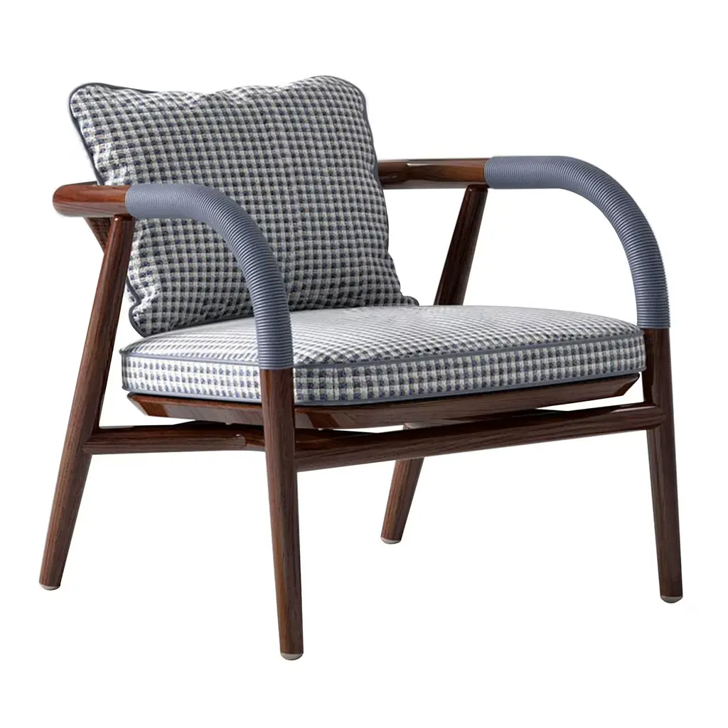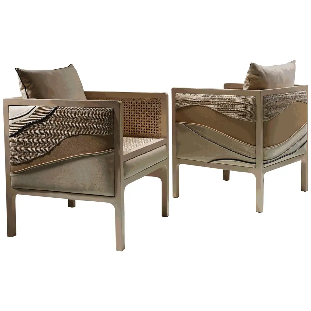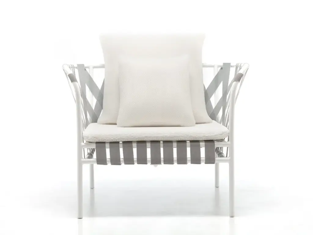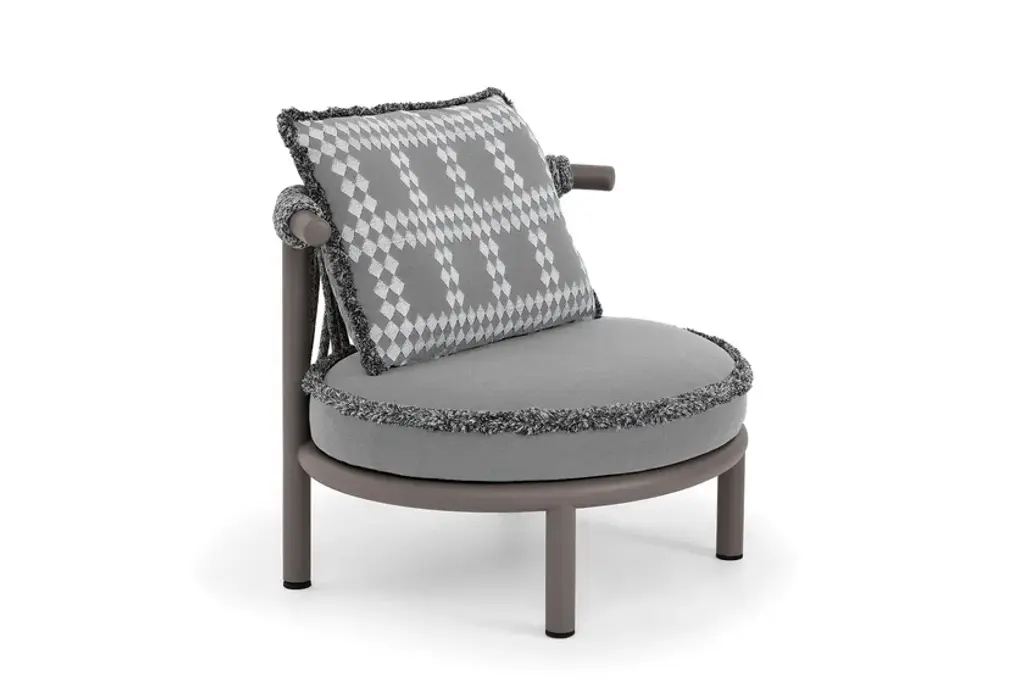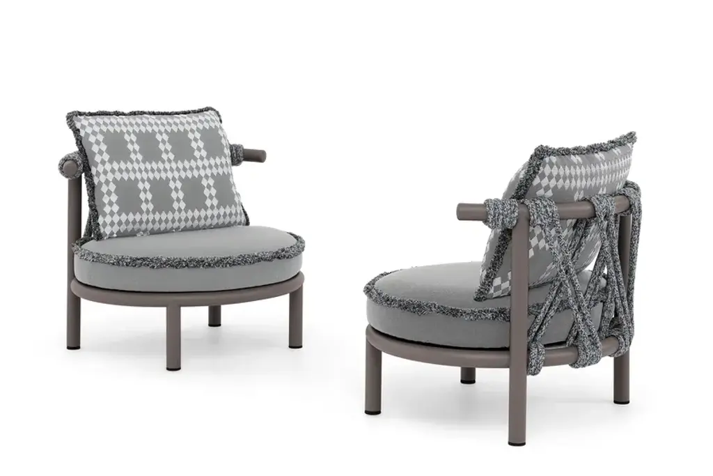 Patricia Urquiola interprets the joy of open-air living with a playful design in her outdoor collection, filled with soft, curvy shapes, it takes a sensible approach to the environment by using innovative, sustainable materials, completely Made in Italy. The backrest features a handcrafted polypropylene and nylon woven cord while the backrest and seat cushions are in 100% PET-derived recycled fiber and upholstered in water-repellent polyester fabric. Optional fringe on the cushions is in the same shade as the cord.
