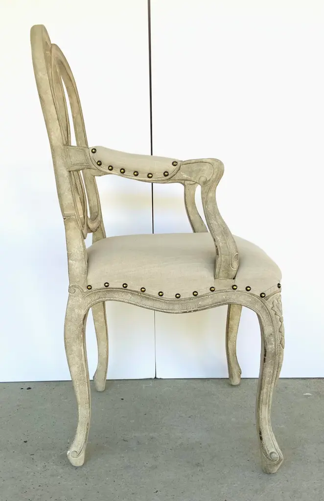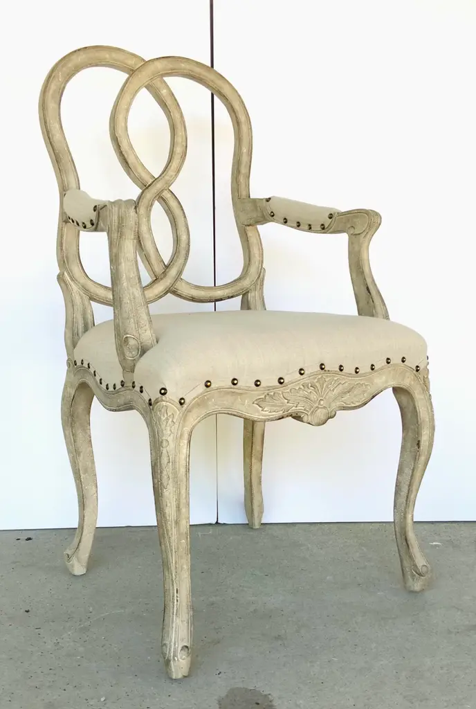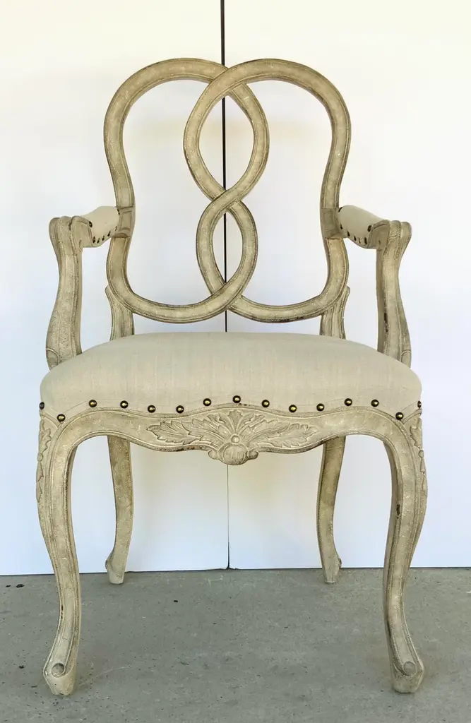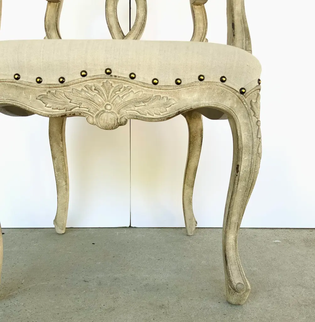 Stylish Transitional Greige Finished Craved Mahogany Ribbon Arm Chair, greige linen blend upholstery, nailhead accents, showroom floor sample
