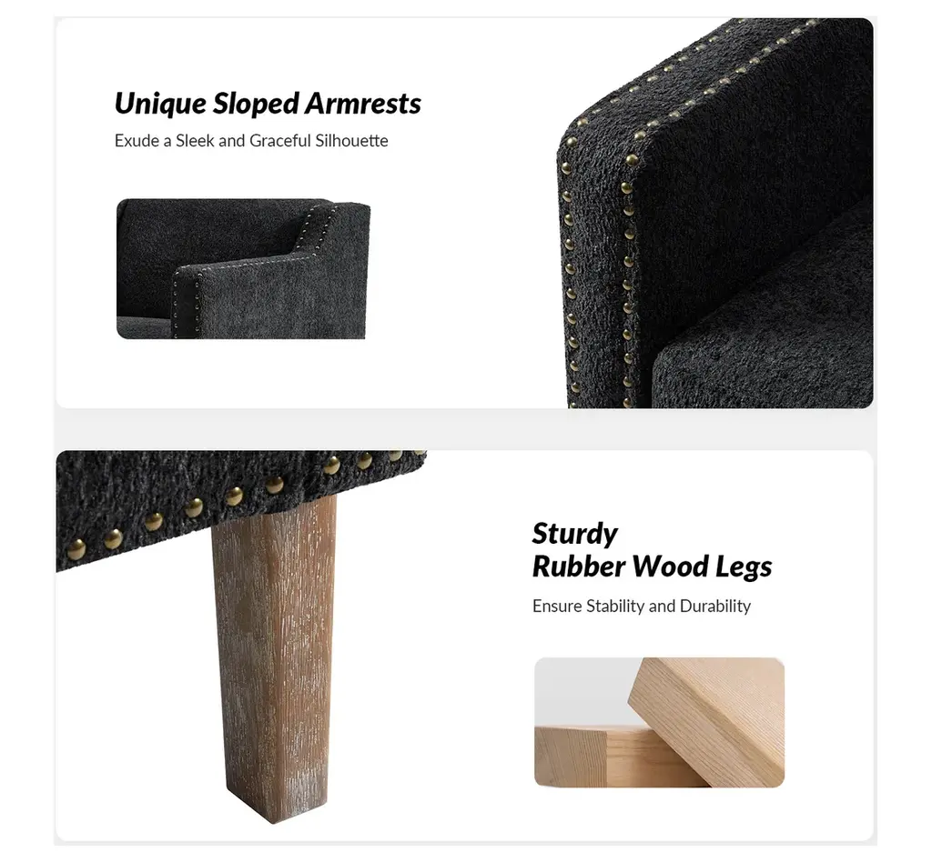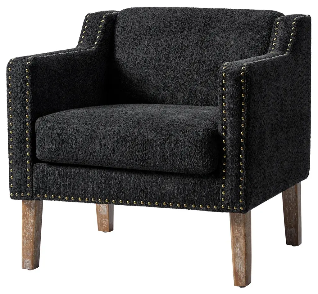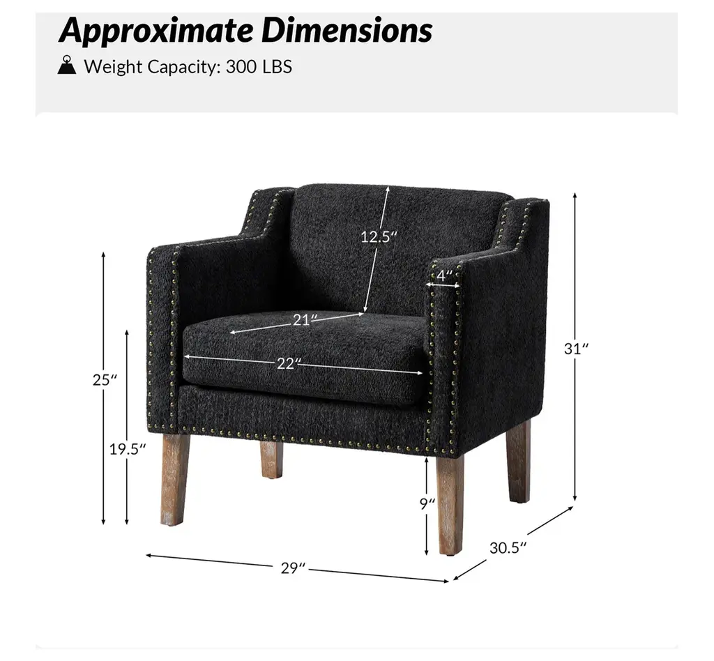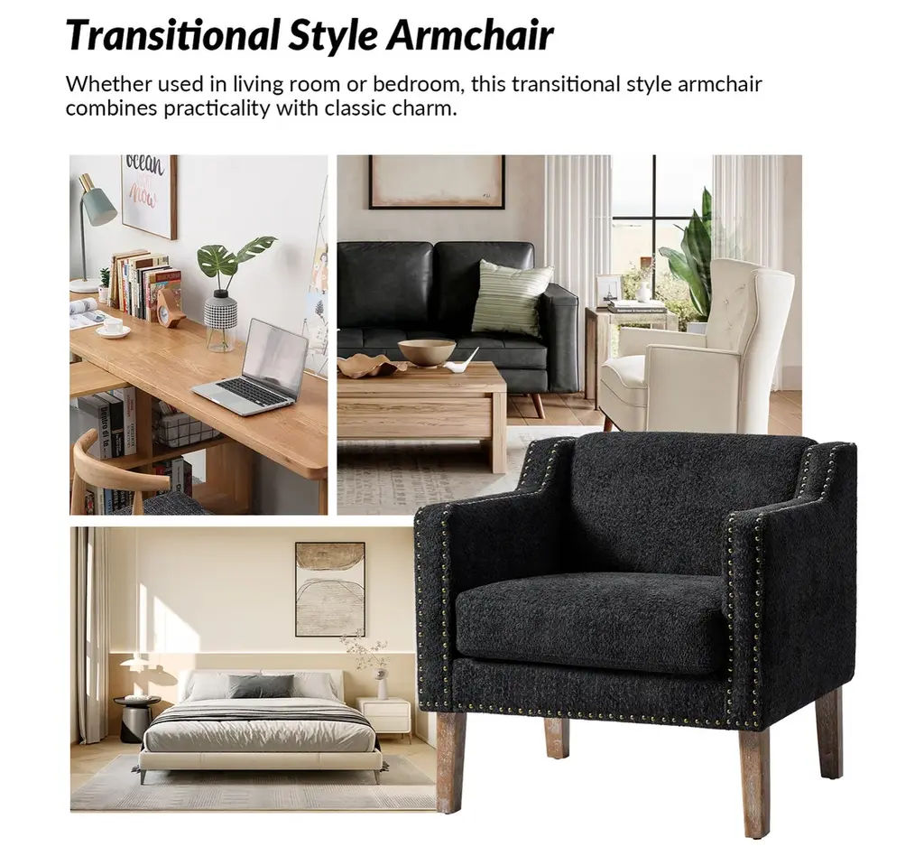 Discover the blend of style and comfort with this transitional style armchair, an exquisite addition to any living space. Upholstered in boucle fabric, the armchair features a soft texture that enhances your seating experience. The sloped, slipper-style arms provide a graceful silhouette, making it aesthetically pleasing. This armchair is adorned with decorative nailhead trim along the edges of the arms and the base, adding a touch of sophistication and detail to its design. Built from solid rubberwood, the frame ensures durability and stability, while the soft cushioning invites you to sink in and unwind. Whether placed in your living room, a cozy reading nook, or a stylish bedroom, it effortlessly elevates your decor. With a unique design and comfortable seating, it enhances your relaxation experience, perfect for relaxing with a good book or entertaining guests.Product Highlights:Solid Wood Frame: Built from robust rubberwood, this armchair offers stability and durability for everyday use. The solid wood structure provides a strong foundation, making it as dependable as it is stylish, and suitable for high-traffic areas in your home or office.Comfortable Sloped Arms: Featuring thoughtfully designed sloped arms, this armchair offers a cozy spot to rest your arms while adding to the chair's modern charm. The soft, inviting edges are perfect for relaxing, whether you’re reading, watching TV, or enjoying a leisurely afternoon.Textured, Soft Boucle Fabric: Upholstered in a unique circle-patterned fabric, the armchair combines soft texture with visual appeal. The fabric is soft to the touch and designed to resist wear, ensuring both comfort and style over time.Enhanced Comfort with Plush Seating: Designed for your comfort, the armchair features plush cushioning that invites you to sit back and unwind. Whether placed in a living room, home office, or reading nook, it promises a comfortable seating experience that enhances relaxation.Refined Transitional Style: This armchair merges classic and contemporary design elements for a unique, versatile look. Its elegant silhouette is enhanced by carefully placed nailhead trim along the edges of the arms and base, adding a touch of sophistication that complements any decor.Product Including: One armchair, assembly is required.Product DetailsWeight Capacity: 300 LBSWeights & DimensionsItem Size: 29"Wx30.5"Dx31"HSeat Size: 22"Wx21"Dx19.5"HBack Height to Seat: 12.5"Item Weight: 44.5 LBSLeg Height: 9"Leg Material: Rubber WoodSpecificationsUpholstered: YesArms Included: NoOttoman Included: NoPillow Included: NoInstructions:Because the size of the product is measured manually, there may be errors.Made in China.