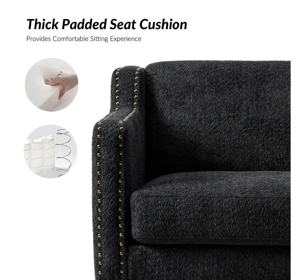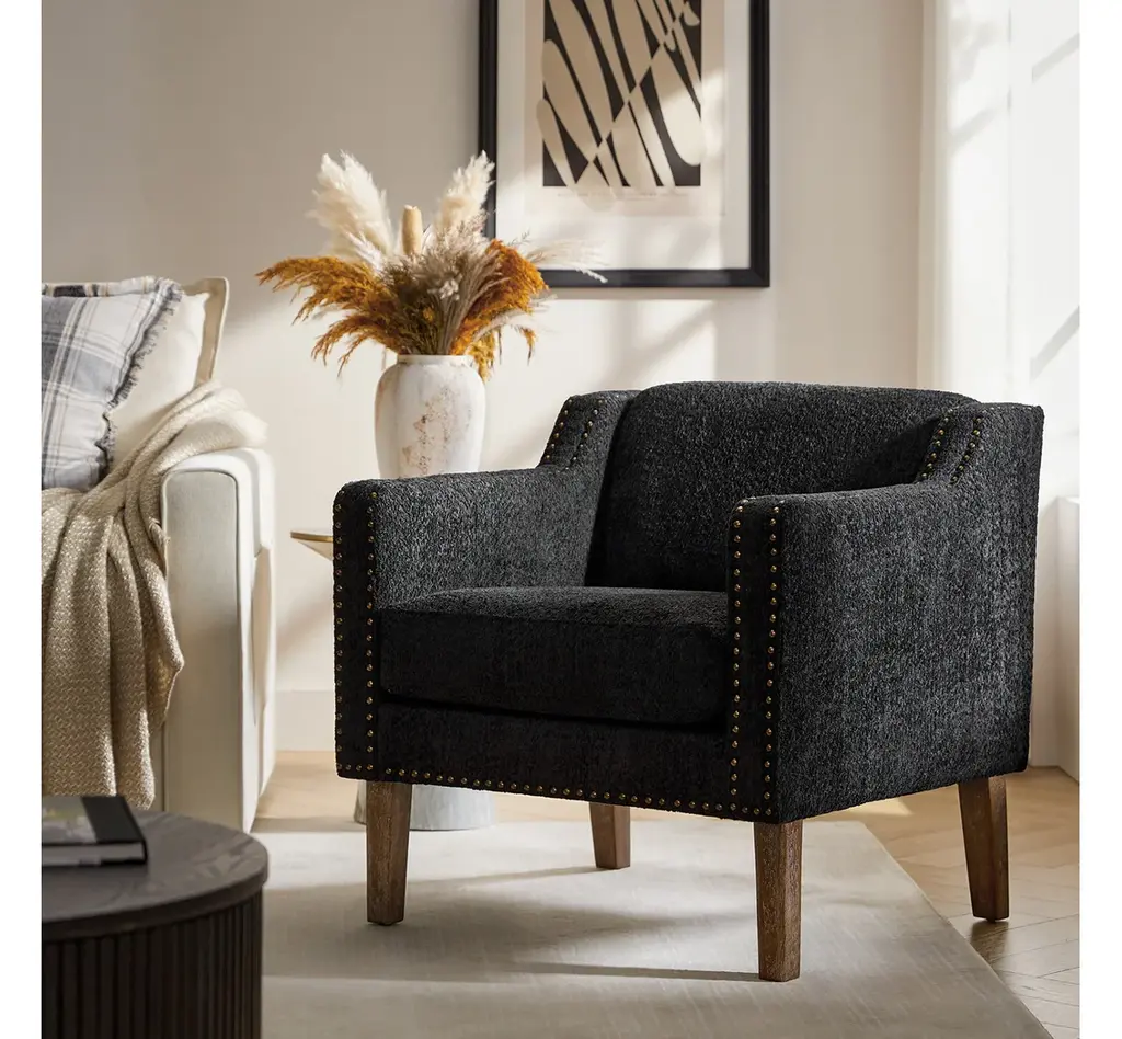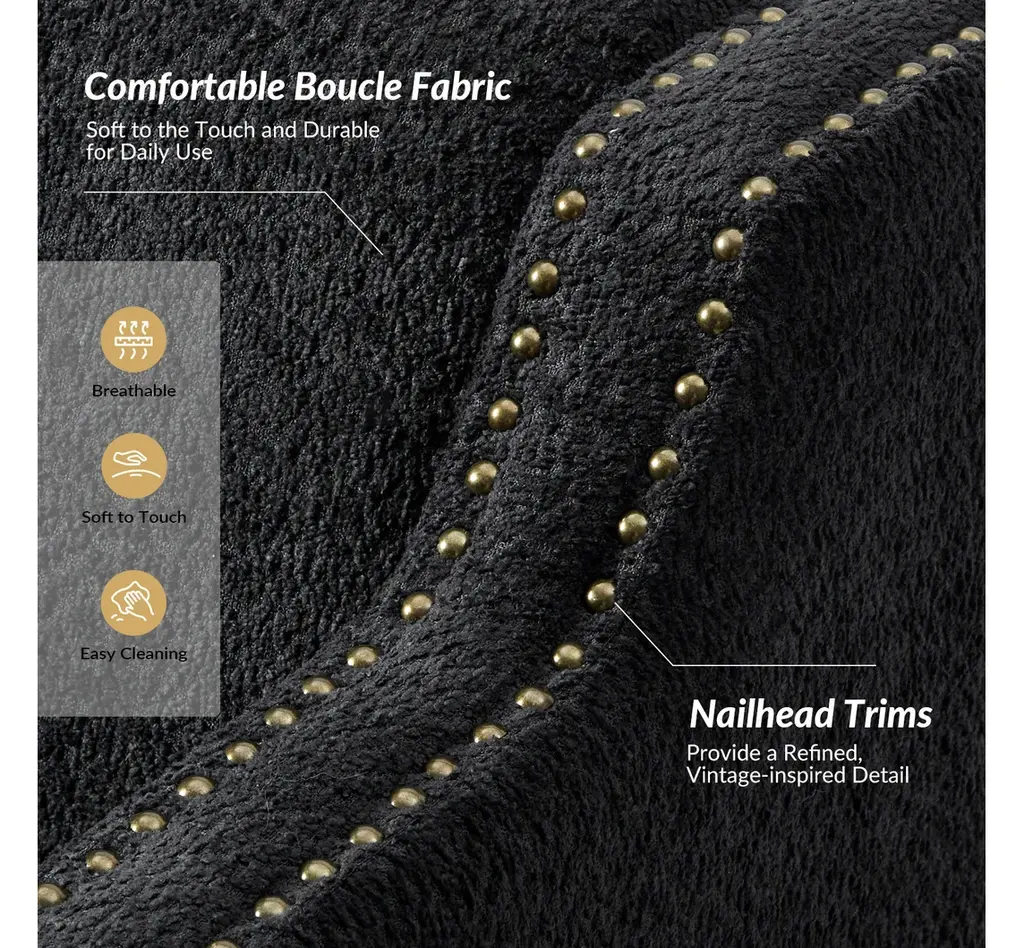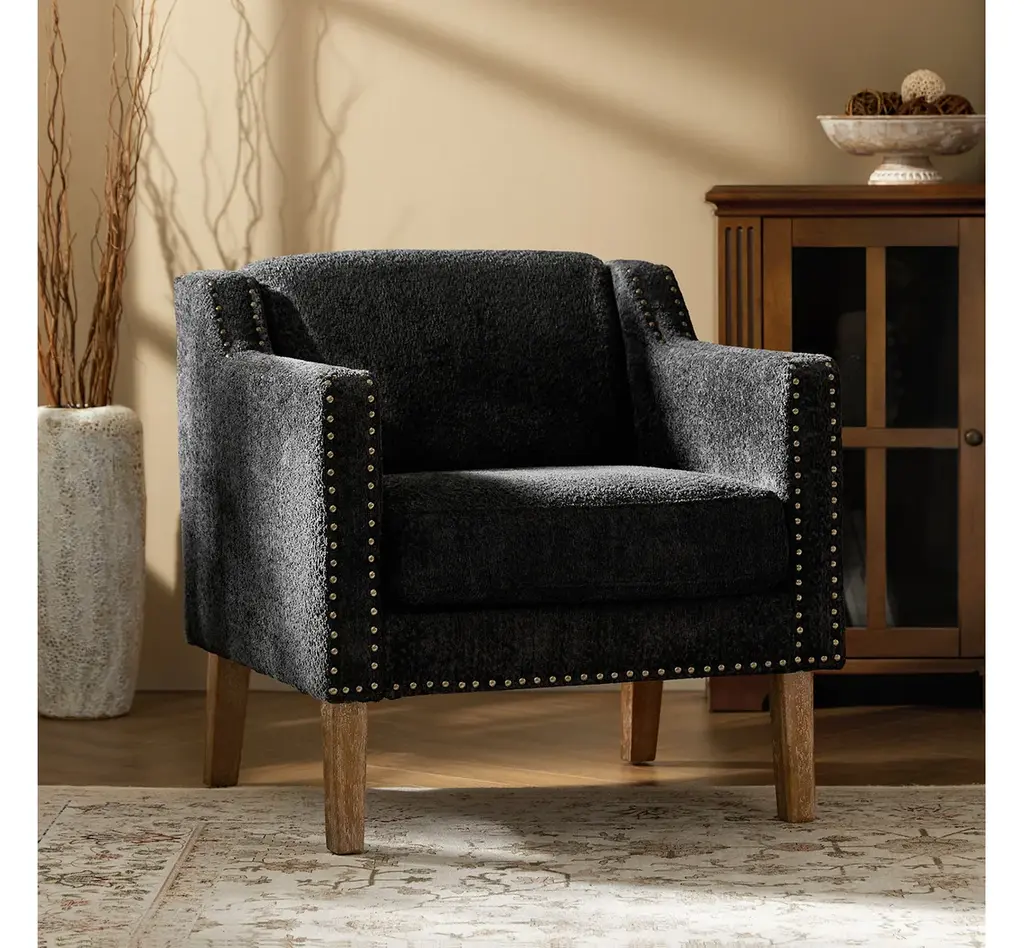 Discover the blend of style and comfort with this transitional style armchair, an exquisite addition to any living space. Upholstered in boucle fabric, the armchair features a soft texture that enhances your seating experience. The sloped, slipper-style arms provide a graceful silhouette, making it aesthetically pleasing. This armchair is adorned with decorative nailhead trim along the edges of the arms and the base, adding a touch of sophistication and detail to its design. Built from solid rubberwood, the frame ensures durability and stability, while the soft cushioning invites you to sink in and unwind. Whether placed in your living room, a cozy reading nook, or a stylish bedroom, it effortlessly elevates your decor. With a unique design and comfortable seating, it enhances your relaxation experience, perfect for relaxing with a good book or entertaining guests.Product Highlights:Solid Wood Frame: Built from robust rubberwood, this armchair offers stability and durability for everyday use. The solid wood structure provides a strong foundation, making it as dependable as it is stylish, and suitable for high-traffic areas in your home or office.Comfortable Sloped Arms: Featuring thoughtfully designed sloped arms, this armchair offers a cozy spot to rest your arms while adding to the chair's modern charm. The soft, inviting edges are perfect for relaxing, whether you’re reading, watching TV, or enjoying a leisurely afternoon.Textured, Soft Boucle Fabric: Upholstered in a unique circle-patterned fabric, the armchair combines soft texture with visual appeal. The fabric is soft to the touch and designed to resist wear, ensuring both comfort and style over time.Enhanced Comfort with Plush Seating: Designed for your comfort, the armchair features plush cushioning that invites you to sit back and unwind. Whether placed in a living room, home office, or reading nook, it promises a comfortable seating experience that enhances relaxation.Refined Transitional Style: This armchair merges classic and contemporary design elements for a unique, versatile look. Its elegant silhouette is enhanced by carefully placed nailhead trim along the edges of the arms and base, adding a touch of sophistication that complements any decor.Product Including: One armchair, assembly is required.Product DetailsWeight Capacity: 300 LBSWeights & DimensionsItem Size: 29"Wx30.5"Dx31"HSeat Size: 22"Wx21"Dx19.5"HBack Height to Seat: 12.5"Item Weight: 44.5 LBSLeg Height: 9"Leg Material: Rubber WoodSpecificationsUpholstered: YesArms Included: NoOttoman Included: NoPillow Included: NoInstructions:Because the size of the product is measured manually, there may be errors.Made in China.