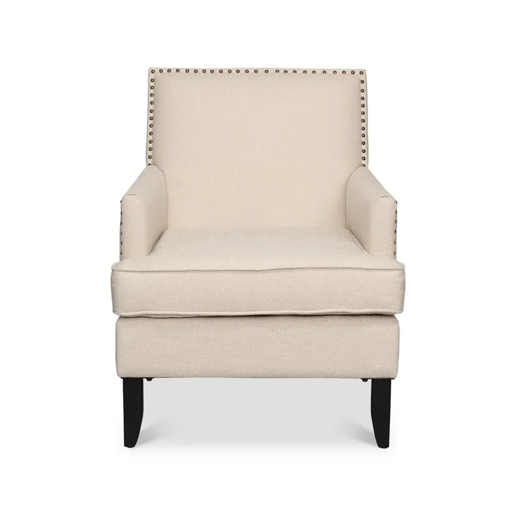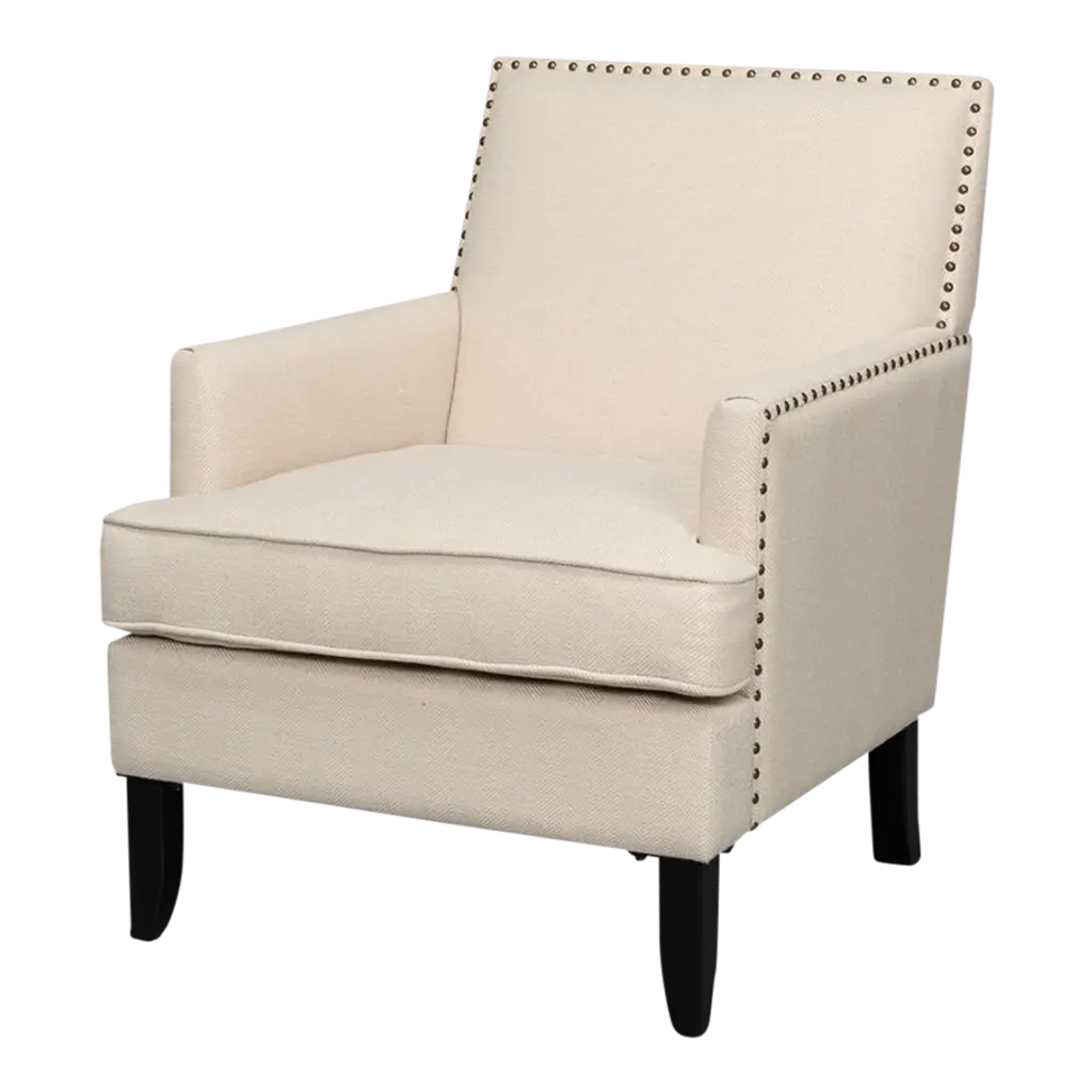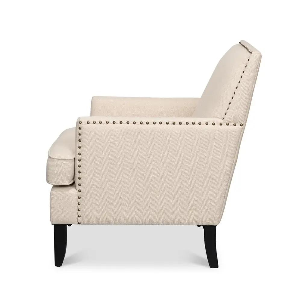 Transitional Upholstered Armchair, with a solid maple ebonized frame and ivory linen fabric, with an upholstered cushion backrest and seat cushion having large brass nailhead detailing.Dimensions: 27" W x 33" D x 35" HSeat - 19" HArm - 24" H.