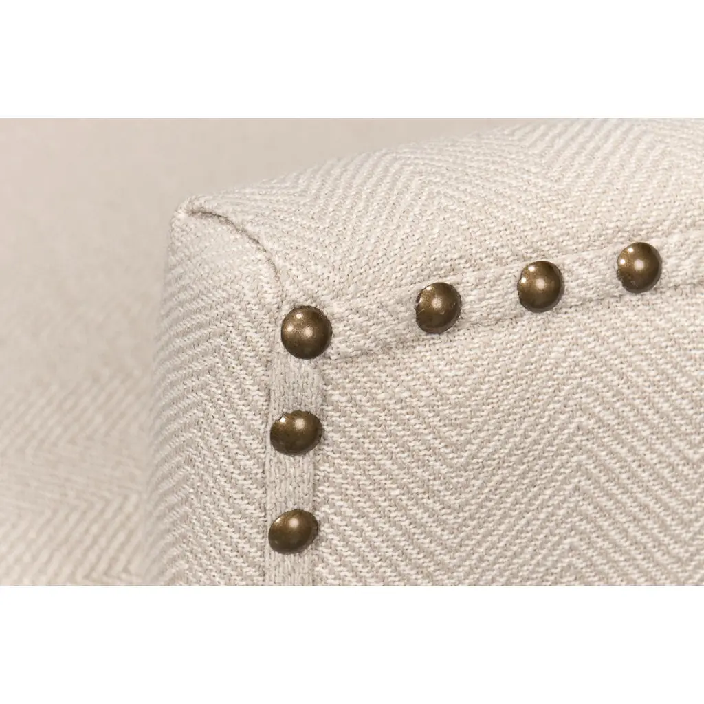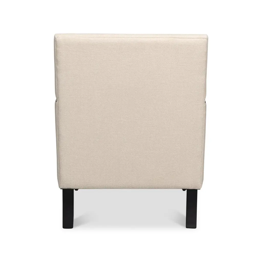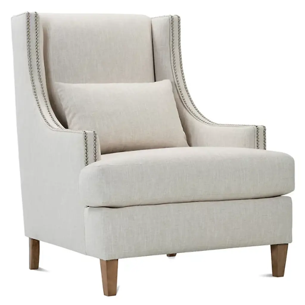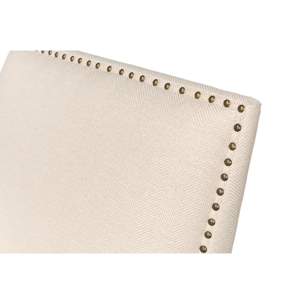 Transitional Upholstered Armchair, with a solid maple ebonized frame and ivory linen fabric, with an upholstered cushion backrest and seat cushion having large brass nailhead detailing.Dimensions: 27" W x 33" D x 35" HSeat - 19" HArm - 24" H.