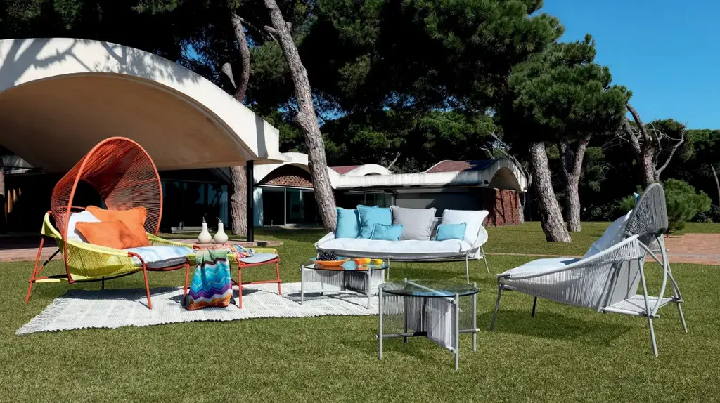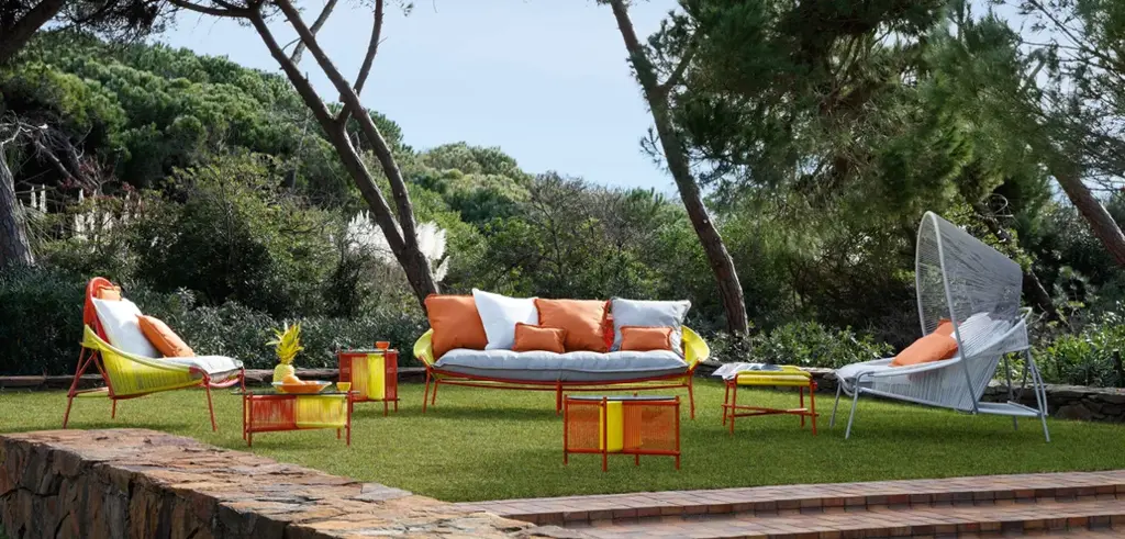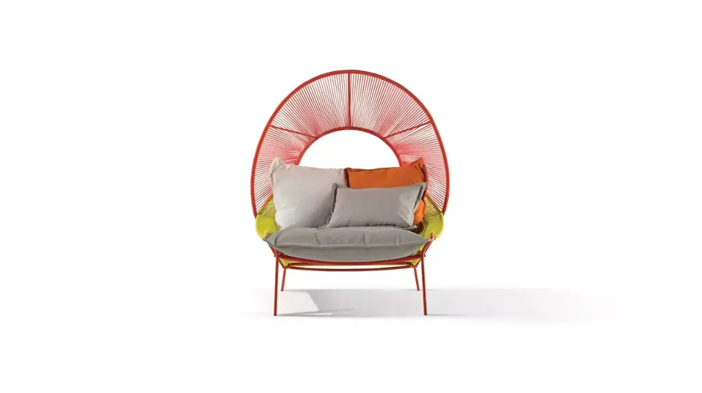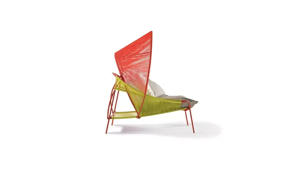 Designed by American designer Stephen Burks, Traveler is a complete collection for reading, dining, and lounging outdoors. Its signature characteristic is the thin lacquered aluminium tube structures with woven coloured cords in three colour combinations: vibrant (coral, red and yellow), calm (grey, white and cobalt blue) and natural (ropelike cord in mouse grey, beige and brick). With its polyester padding, this spectacular hooded chair is not only sculptural, but also extremely comfortable!