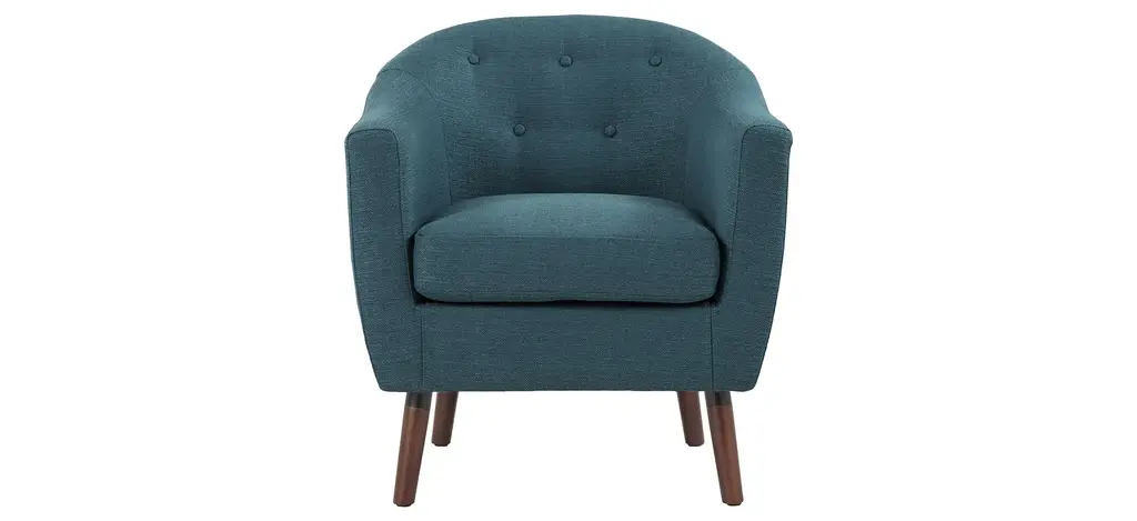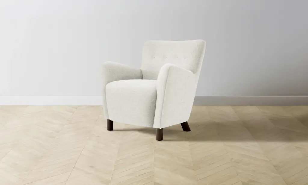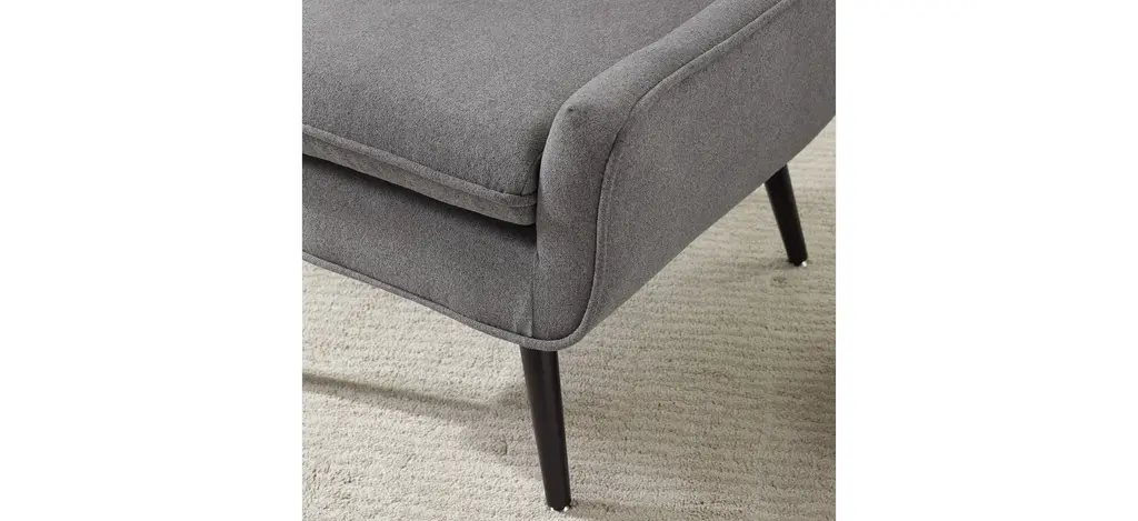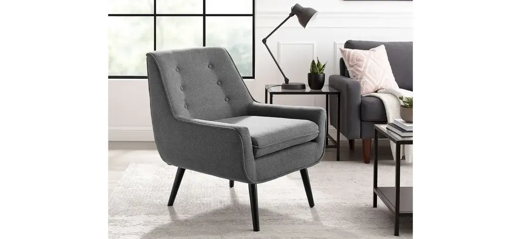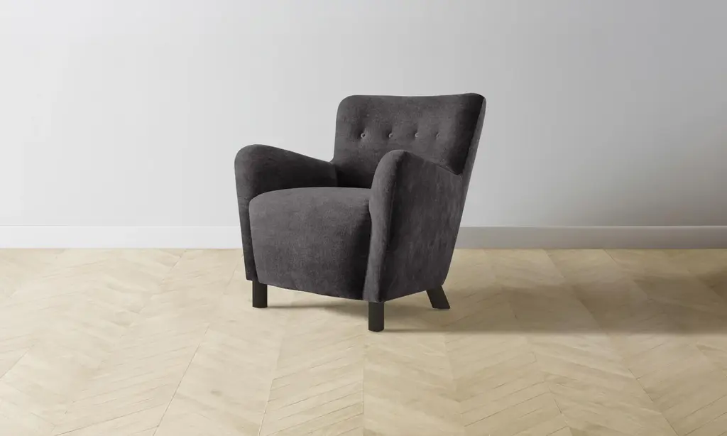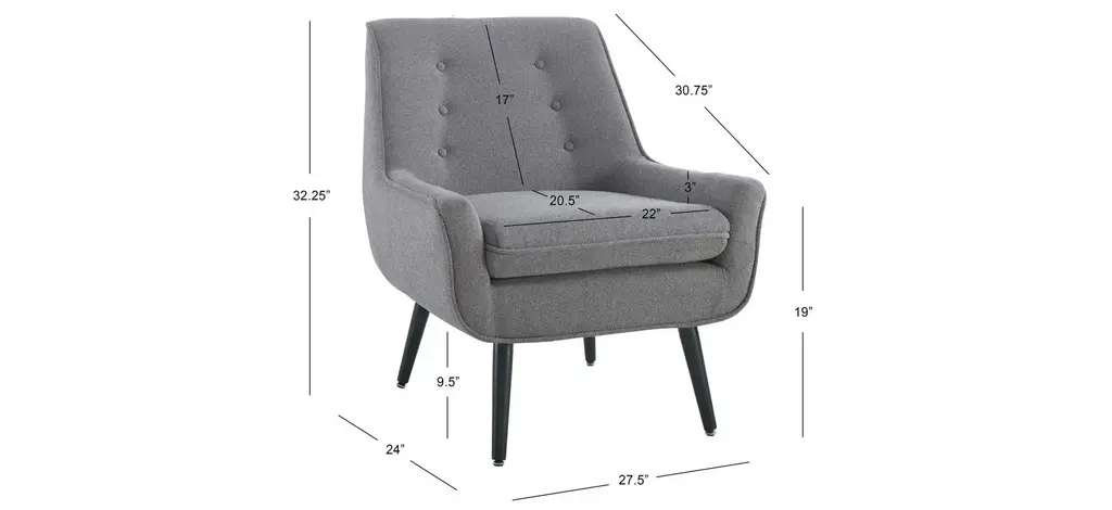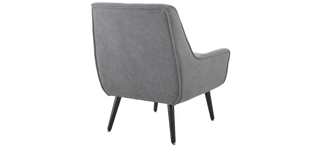 The Trelis Chair exudes modern design and style. The gentle curves and rounded frame is accented by round splayed black finished legs. The gray flannel upholstery keeps the piece simple and versatile. Button tufts and piping complete the chair.