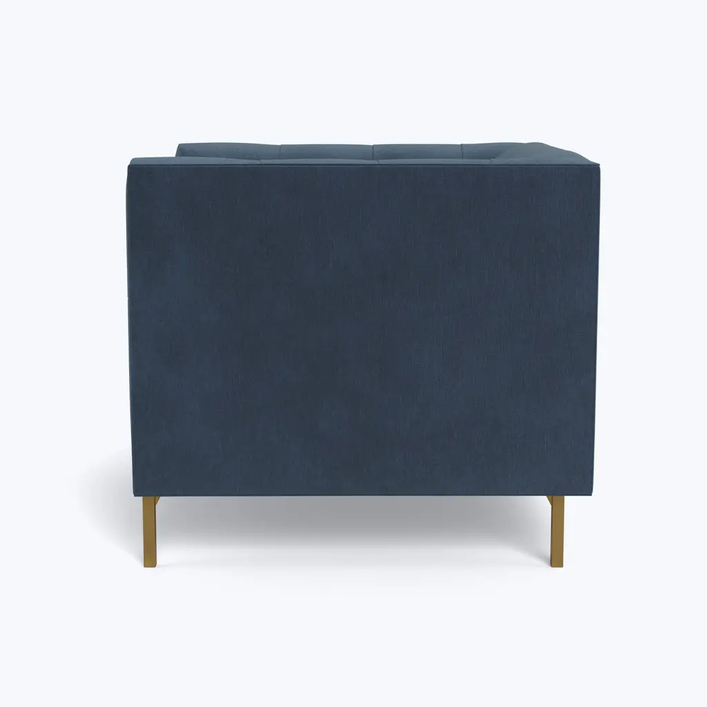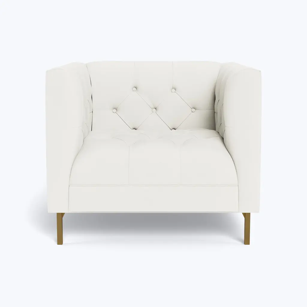 Experience the crossroads of modern sophistication and timeless elegance with the Tribeca Chair, an exclusive offering from abc carpet & home. Featuring clean lines and a tuxedo-like aesthetic paired with square arms and sleek legs, this contemporary armchair exudes a sense of refined luxury that effortlessly complements any decor. The Tribeca Collection goes beyond aesthetics to prioritize your comfort. This collection features tight seat cushions, exuding a formal aesthetic while providing unparalleled comfort atop a balanced suspension base. Crafted with a sustainably sourced Goodwood frame, this chair is not only aesthetically pleasing but also eco-conscious, offering peace of mind as you create lasting memories at home. Customize your Tribeca Chair with Cobble Hill's wide range of color and fabric combinations, offering more than 80 options to suit your unique style and preferences. Whether it's the Crypton Performance Blend or Kelley Performance Velvet, rest assured that each upholstery option is durable and easy to clean. From bold hues to subtle tones, our wide selection ensures that your chair reflects your unique taste and personality. Simply select your dream color and fabric scheme, and your custom chair will be shipped to your home in 8-10 weeks. Measuring 34 inches in width, 30 inches in height, and 32 inches in depth, with a seat height of 16 inches and a seat depth of 21 inches, the Tribeca Chair offers a comfortable and inviting space for relaxation. With a back and arm height of 30 inches, it provides optimal support for lounging. Additionally, choose between brass and silver leg finishes to perfectly match your interior style. Proudly made in the USA, each piece in the Cobble Hill collection reflects a commitment to quality craftsmanship and ethical manufacturing practices. Maintaining the pristine condition of your chair is effortless with simple care instructions. Spot clean with mild detergent and vacuum frequently to keep it looking fresh. For a deeper clean, professional services are recommended. The seat cushions of the Tribeca Chair are crafted with a blend of foam, fiber, and feather/down, channeled to ensure even fill distribution. Back cushions feature a fiber and feather blend encased in a channeled down-proof casing. Rest assured, our fill is Responsible Down Standard certified and meets USDA hypoallergenic regulations, free from flame retardant chemicals. Whether used as a standalone statement piece or paired with other Tribeca sofas and sectionals to create a unique ensemble, the Tribeca Chair from Cobble Hill is sure to impress.