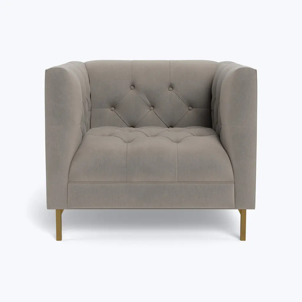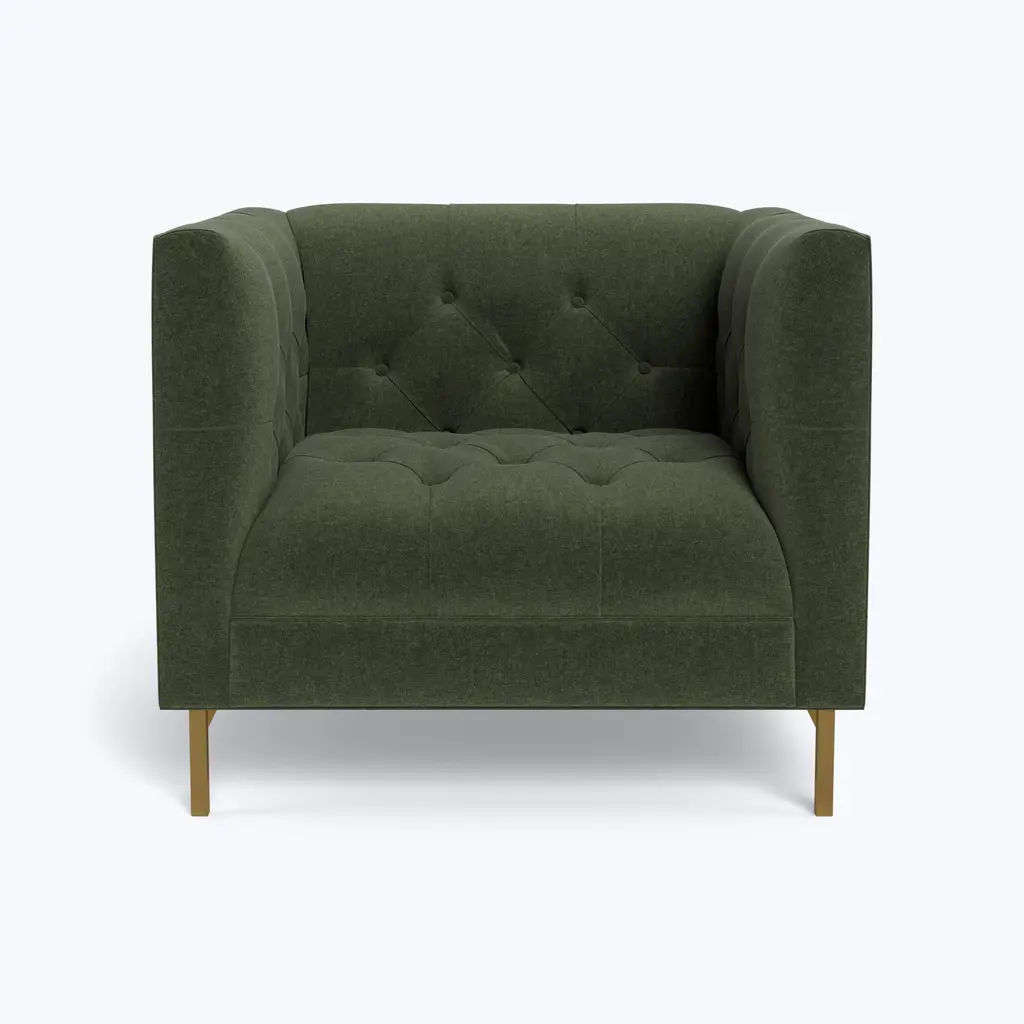 Experience the crossroads of modern sophistication and timeless elegance with the Tribeca Chair, an exclusive offering from abc carpet & home. Featuring clean lines and a tuxedo-like aesthetic paired with square arms and sleek legs, this contemporary armchair exudes a sense of refined luxury that effortlessly complements any decor. The Tribeca Collection goes beyond aesthetics to prioritize your comfort. This collection features tight seat cushions, exuding a formal aesthetic while providing unparalleled comfort atop a balanced suspension base. Crafted with a sustainably sourced Goodwood frame, this chair is not only aesthetically pleasing but also eco-conscious, offering peace of mind as you create lasting memories at home. Customize your Tribeca Chair with Cobble Hill's wide range of color and fabric combinations, offering more than 80 options to suit your unique style and preferences. Whether it's the Crypton Performance Blend or Kelley Performance Velvet, rest assured that each upholstery option is durable and easy to clean. From bold hues to subtle tones, our wide selection ensures that your chair reflects your unique taste and personality. Simply select your dream color and fabric scheme, and your custom chair will be shipped to your home in 8-10 weeks. Measuring 34 inches in width, 30 inches in height, and 32 inches in depth, with a seat height of 16 inches and a seat depth of 21 inches, the Tribeca Chair offers a comfortable and inviting space for relaxation. With a back and arm height of 30 inches, it provides optimal support for lounging. Additionally, choose between brass and silver leg finishes to perfectly match your interior style. Proudly made in the USA, each piece in the Cobble Hill collection reflects a commitment to quality craftsmanship and ethical manufacturing practices. Maintaining the pristine condition of your chair is effortless with simple care instructions. Spot clean with mild detergent and vacuum frequently to keep it looking fresh. For a deeper clean, professional services are recommended. The seat cushions of the Tribeca Chair are crafted with a blend of foam, fiber, and feather/down, channeled to ensure even fill distribution. Back cushions feature a fiber and feather blend encased in a channeled down-proof casing. Rest assured, our fill is Responsible Down Standard certified and meets USDA hypoallergenic regulations, free from flame retardant chemicals. Whether used as a standalone statement piece or paired with other Tribeca sofas and sectionals to create a unique ensemble, the Tribeca Chair from Cobble Hill is sure to impress.
