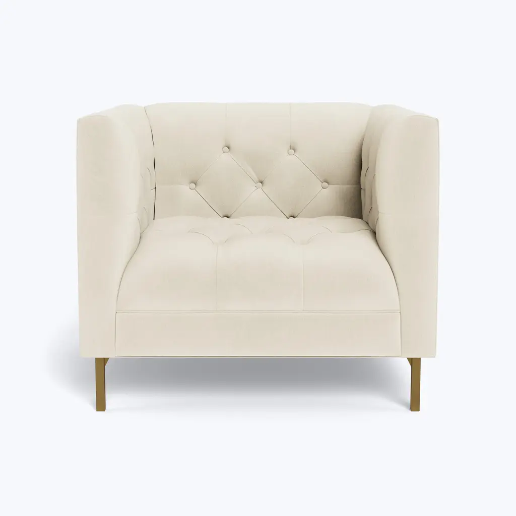 Experience the crossroads of modern sophistication and timeless elegance with the Tribeca Chair, an exclusive offering from abc carpet & home. Featuring clean lines and a tuxedo-like aesthetic paired with square arms and sleek legs, this contemporary armchair exudes a sense of refined luxury that effortlessly complements any decor. The Tribeca Collection goes beyond aesthetics to prioritize your comfort. This collection features tight seat cushions, exuding a formal aesthetic while providing unparalleled comfort atop a balanced suspension base. Crafted with a sustainably sourced Goodwood frame, this chair is not only aesthetically pleasing but also eco-conscious, offering peace of mind as you create lasting memories at home. Customize your Tribeca Chair with Cobble Hill's wide range of color and fabric combinations, offering more than 80 options to suit your unique style and preferences. Whether it's the Crypton Performance Blend or Kelley Performance Velvet, rest assured that each upholstery option is durable and easy to clean. From bold hues to subtle tones, our wide selection ensures that your chair reflects your unique taste and personality. Simply select your dream color and fabric scheme, and your custom chair will be shipped to your home in 8-10 weeks. Measuring 34 inches in width, 30 inches in height, and 32 inches in depth, with a seat height of 16 inches and a seat depth of 21 inches, the Tribeca Chair offers a comfortable and inviting space for relaxation. With a back and arm height of 30 inches, it provides optimal support for lounging. Additionally, choose between brass and silver leg finishes to perfectly match your interior style. Proudly made in the USA, each piece in the Cobble Hill collection reflects a commitment to quality craftsmanship and ethical manufacturing practices. Maintaining the pristine condition of your chair is effortless with simple care instructions. Spot clean with mild detergent and vacuum frequently to keep it looking fresh. For a deeper clean, professional services are recommended. The seat cushions of the Tribeca Chair are crafted with a blend of foam, fiber, and feather/down, channeled to ensure even fill distribution. Back cushions feature a fiber and feather blend encased in a channeled down-proof casing. Rest assured, our fill is Responsible Down Standard certified and meets USDA hypoallergenic regulations, free from flame retardant chemicals. Whether used as a standalone statement piece or paired with other Tribeca sofas and sectionals to create a unique ensemble, the Tribeca Chair from Cobble Hill is sure to impress.