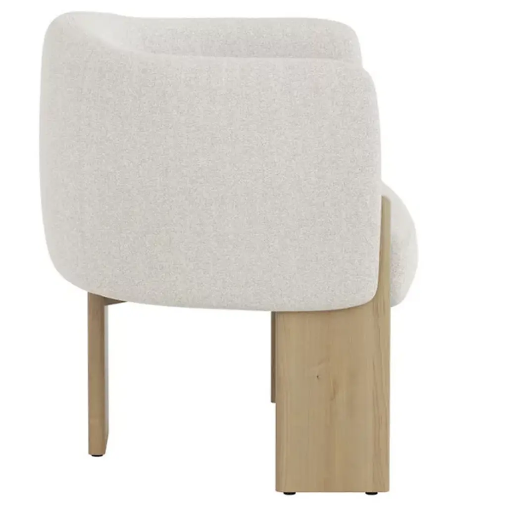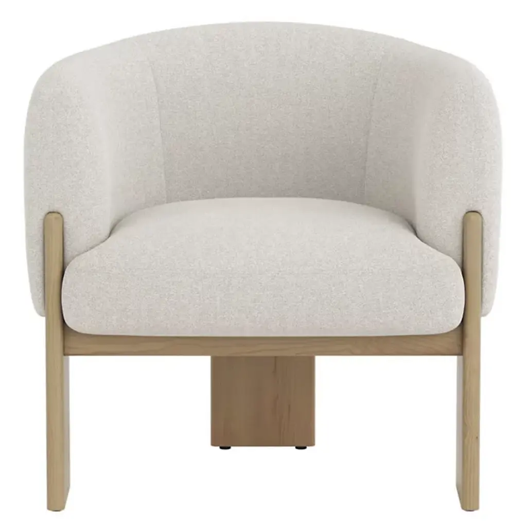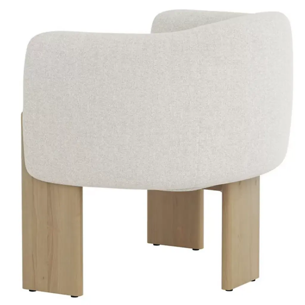 The Trine Lounge Chair from Sunpan combines artisanal design with luxurious comfort. Its gently curved seat and back, upholstered in soft, textured fabric, are accented by a natural patina and subtle markings that showcase its character. Plush foam and fiber cushioning rest on durable webbing for long-lasting support. Anchored by a trio of rounded cerused oak planks, the wooden base highlights unique grain patterns and organic textures, creating a distinctive piece that balances rustic charm with modern refinement.