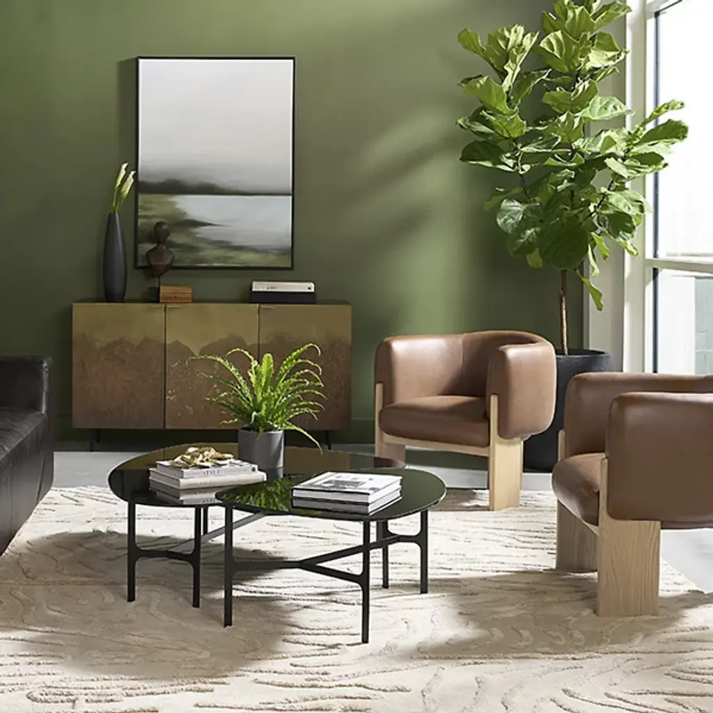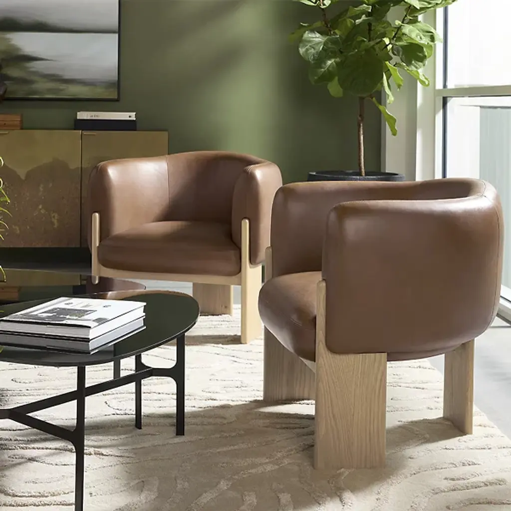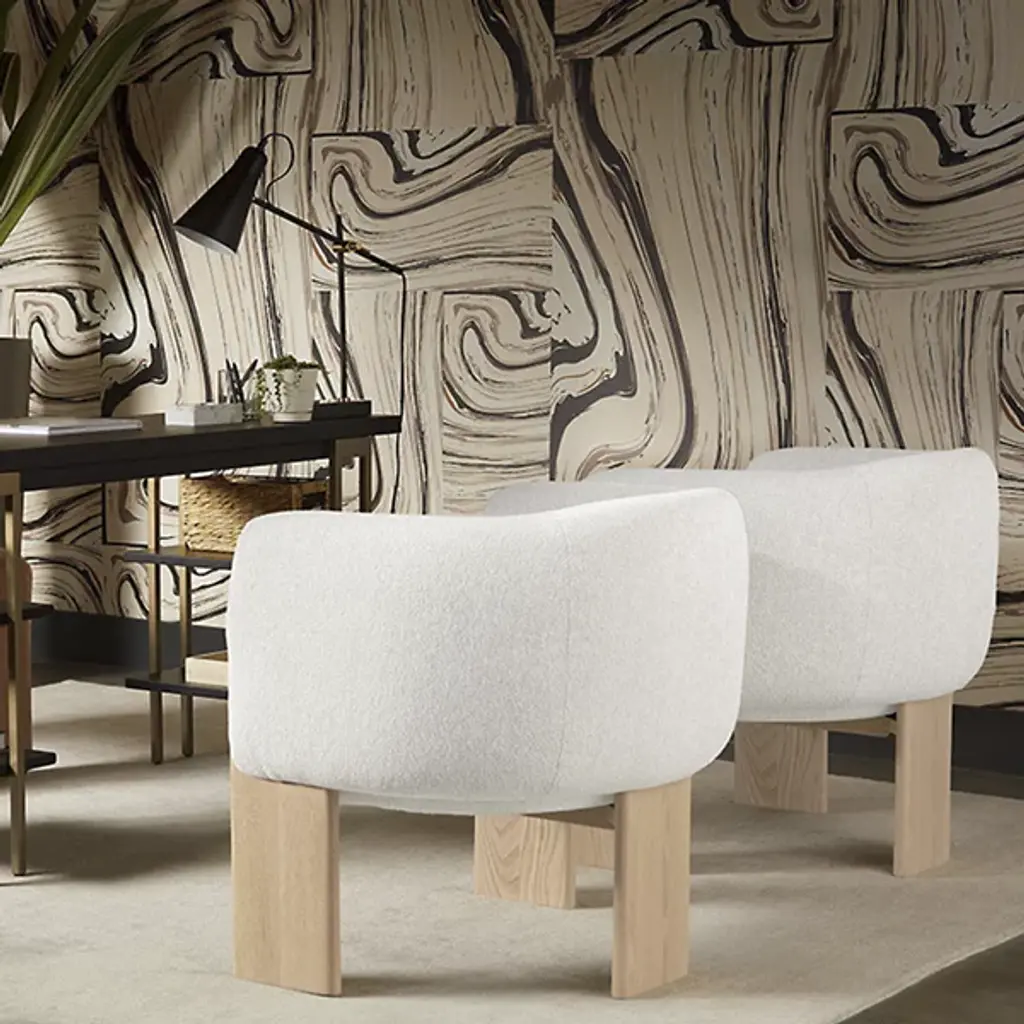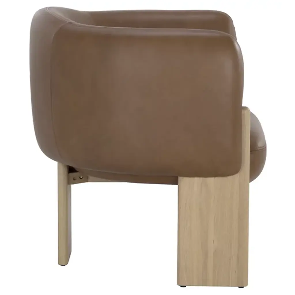 The Trine Lounge Chair from Sunpan combines artisanal design with luxurious comfort. Its gently curved seat and back, upholstered in soft, textured fabric, are accented by a natural patina and subtle markings that showcase its character. Plush foam and fiber cushioning rest on durable webbing for long-lasting support. Anchored by a trio of rounded cerused oak planks, the wooden base highlights unique grain patterns and organic textures, creating a distinctive piece that balances rustic charm with modern refinement.