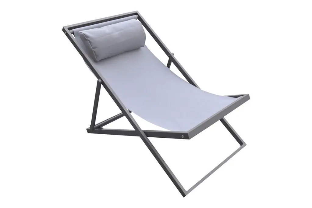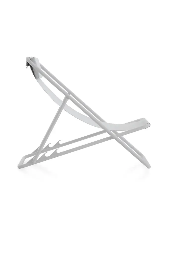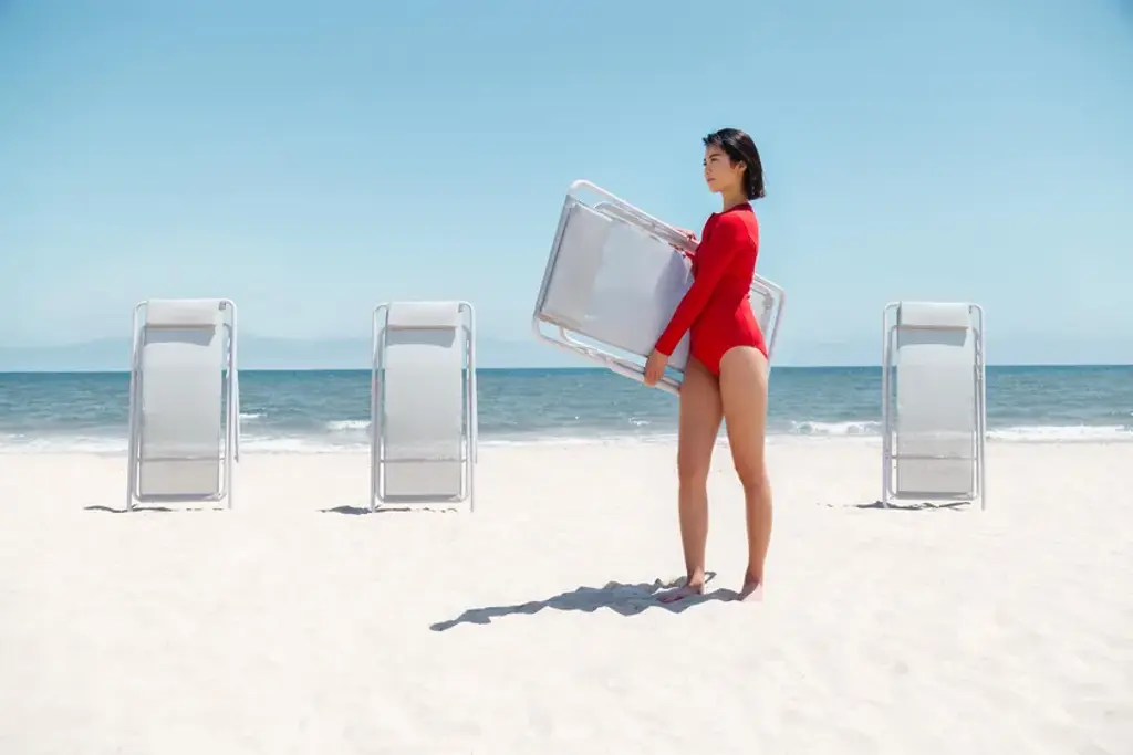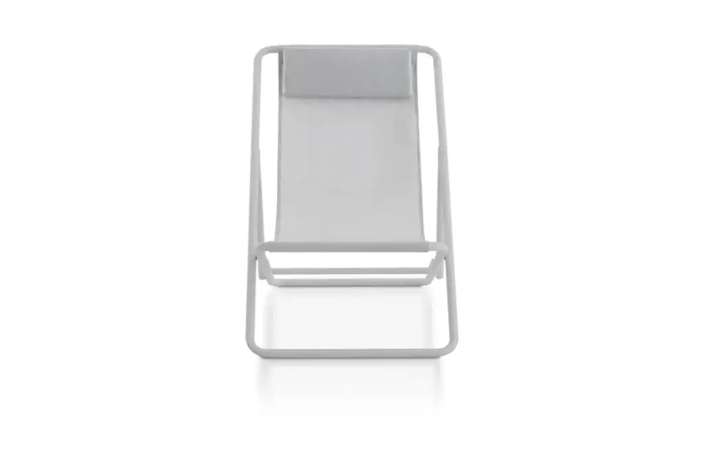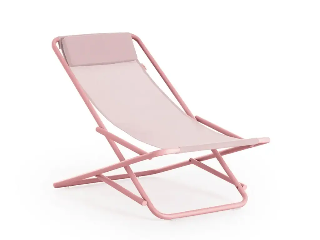 Rest, read or clear your mind while looking at the horizon. Disconnection from the rest of the world is ensured in any of the three positions of our Trip folding chair. With its soft headrest cushion, this folding and lightweight sling chair is the best company for a relaxing day outdoors. Take it to the beach or the countryside, place it next to the pool, on your terrace or even an urban balcony.Its sling is made with a special outdoor plastic fabric, and its structure is made of tubular aluminium, which is why it is so light and holds up perfectly to the elements. You can use it for your trips to the beach or the countryside, or as a permanent fixture for your outdoor space.Trip features soft rounded shapes, thanks to its tubular aluminium structure. If you prefer a more rectilinear profile, check out our Picnic. This is the bicolour version, with a white frame and a contrasting sling in the colour of your choice. An elegant monochrome version is also available.Monocolour: White, pink, red, grey, anthracite, sand, bronze.Bicolour with white structure: Pink, red, grey, anthracite, mustard, sand, bronze.