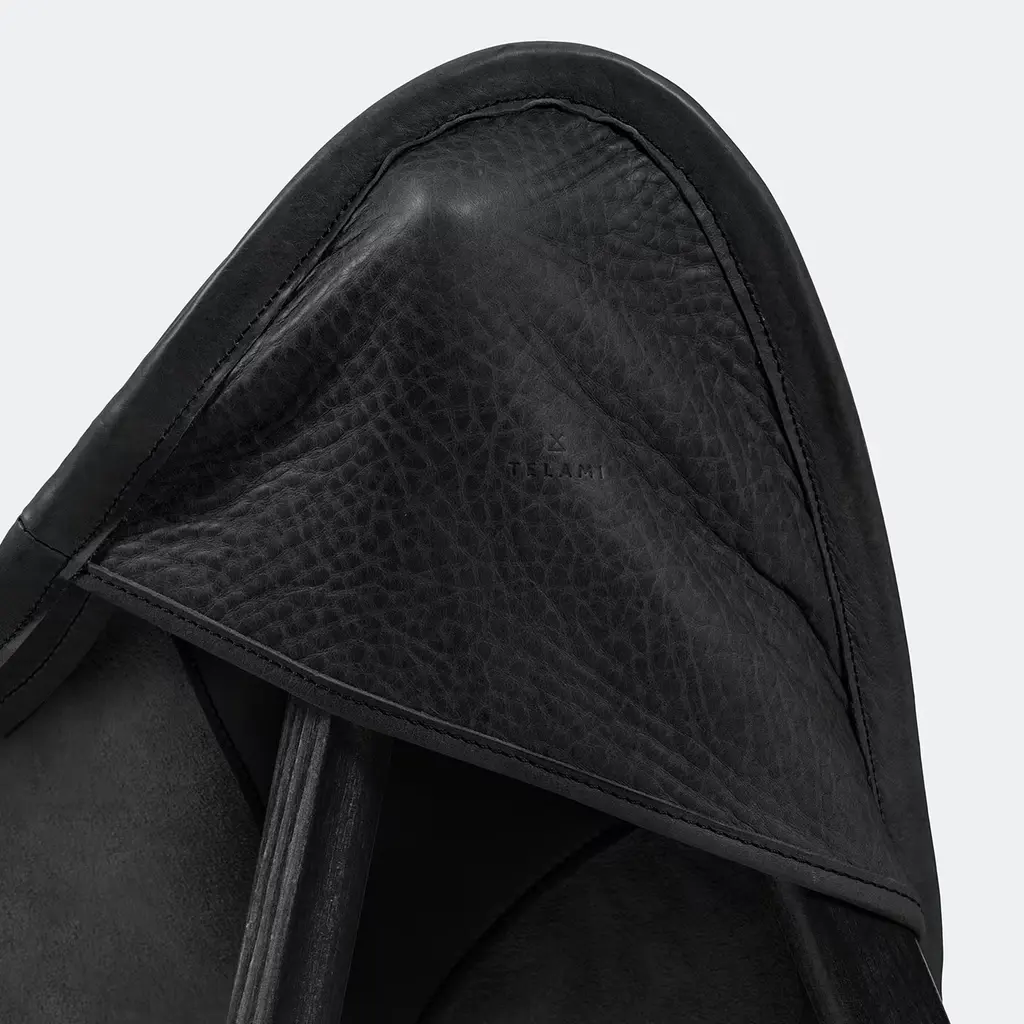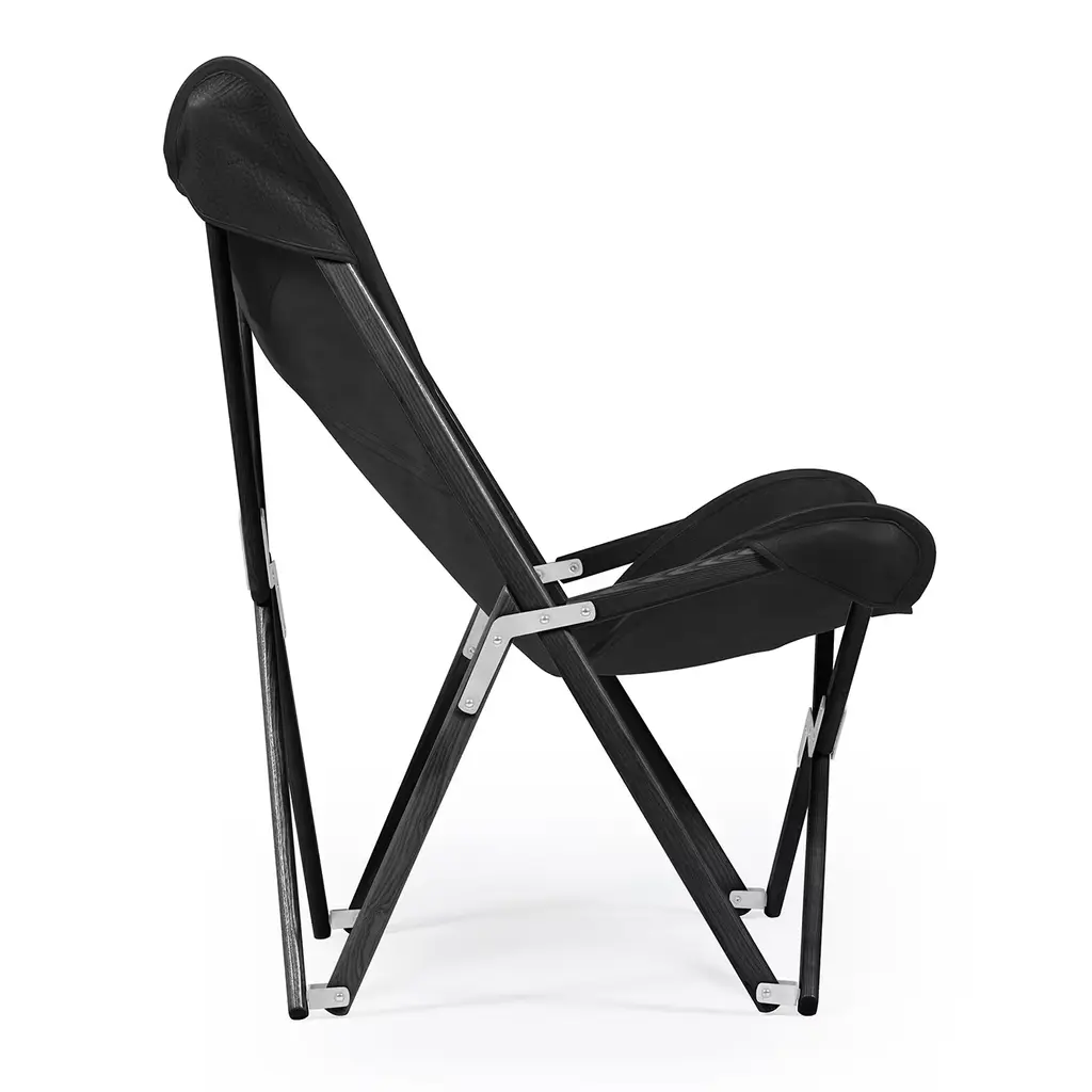 The sophisticated and rustic feel of the iconic Tripolina chair, originally used by Italian soldiers in the sand-filled fields of Libya, is reinterpreted here as an entirely handmade accent piece that will enliven a study, living room, or entryway, thanks to its exquisite craftsmanship and high-quality materials. The fine ash wood structure is combined with 100% Tuscan vegetable-tanned leather upholstery: the wood is stained a deep black matching the leather's black tone, while the hardware is fashioned of polished metal. The comfortable seat is 32 cm high.
