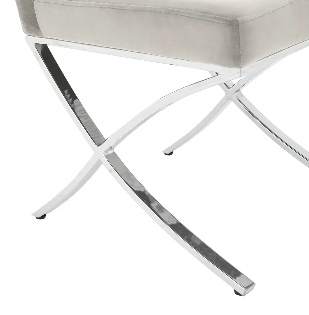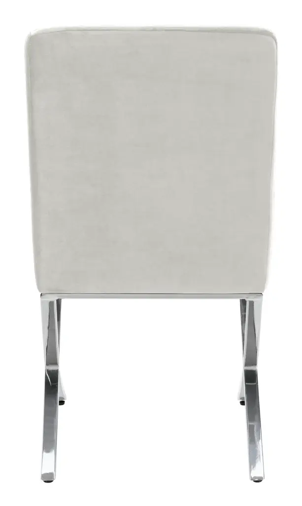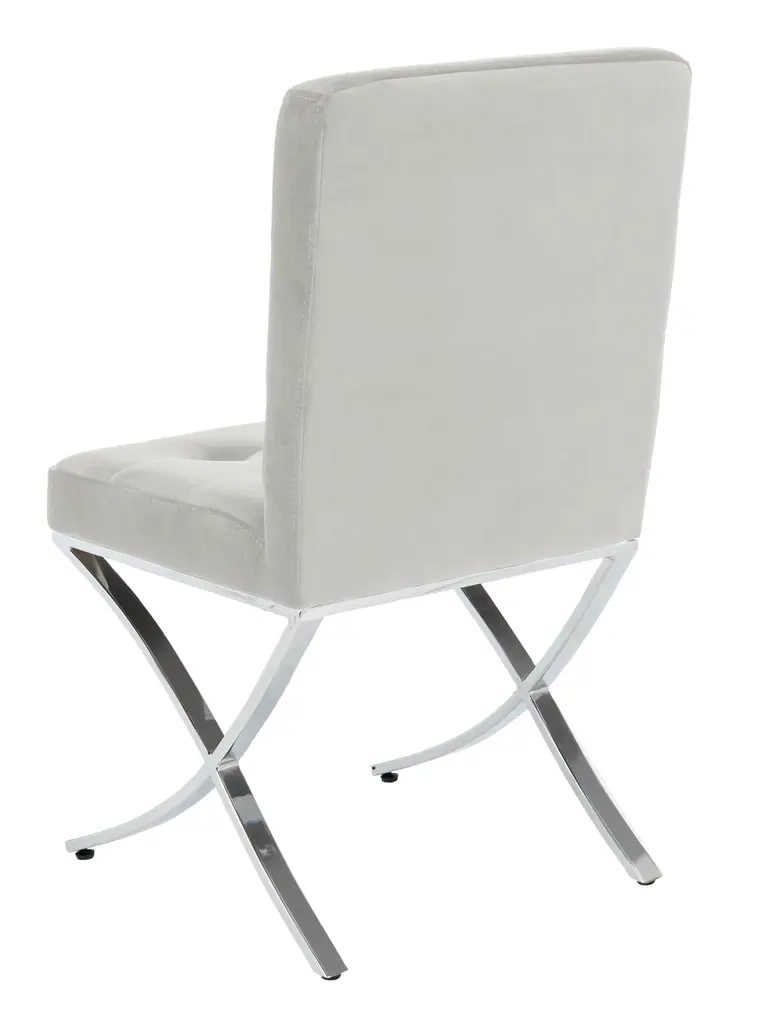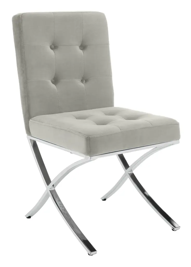 a instant sign of sophistication, this contemporary grey tufted side chair brings refined relaxation to any living room. Designed with modern geometric lines and generously tufted velvet upholstery, it's polished chrome legs make it a new classic. To prevent overall soiling, frequent vacuum light brushing is recommended. Cushions and pillows should be turned on a weekly basis. Down-filled cushions should be brushed rather than vacuumed. Spot clean, using a mild water-free solvent or dry cleaning product. Only a professional cleaner should undertake a complete overall cleaning. The use of steam or water-based cleaners may cause excessive shrinking or staining. Some assembly required.