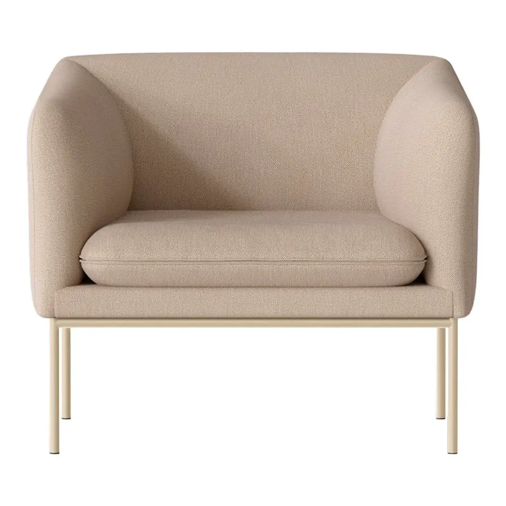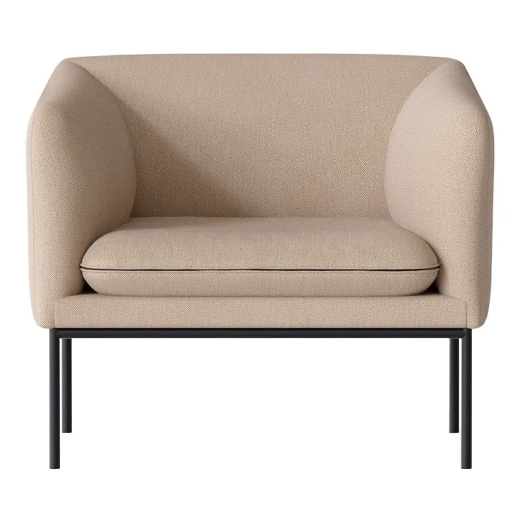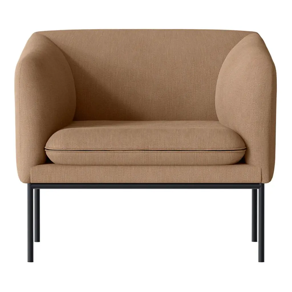 This inviting armchair has a strict sculptural outer shape that complements the curves of the inviting, rounded inner. With its tight upholstery and simple frame made from powder coated steel, the chair achieves a timeless, clean look with a feminine touch and an elevated feel thanks to its thin, delicate legs.