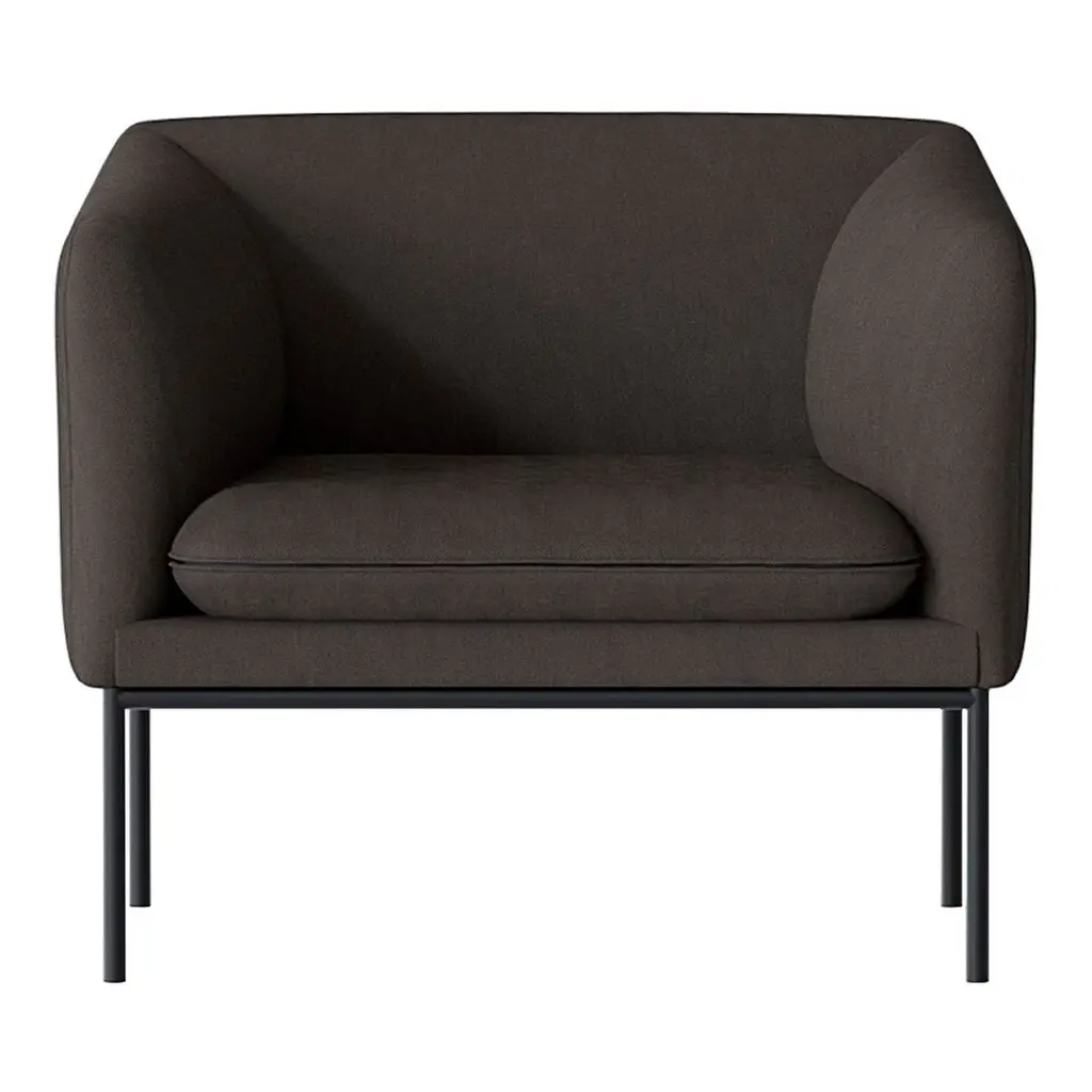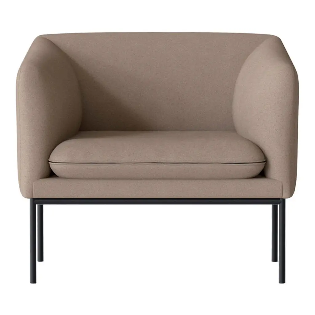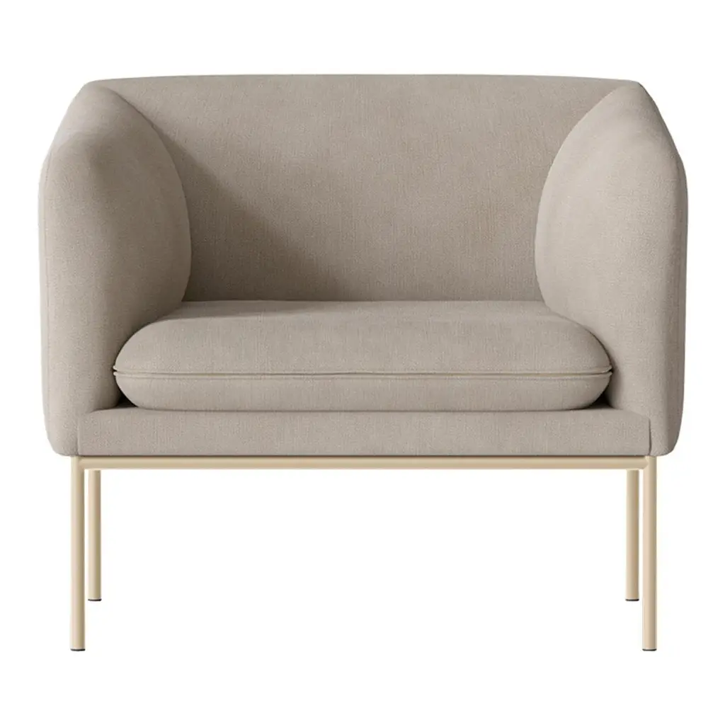 This inviting armchair has a strict sculptural outer shape that complements the curves of the inviting, rounded inner. With its tight upholstery and simple frame made from powder coated steel, the chair achieves a timeless, clean look with a feminine touch and an elevated feel thanks to its thin, delicate legs.