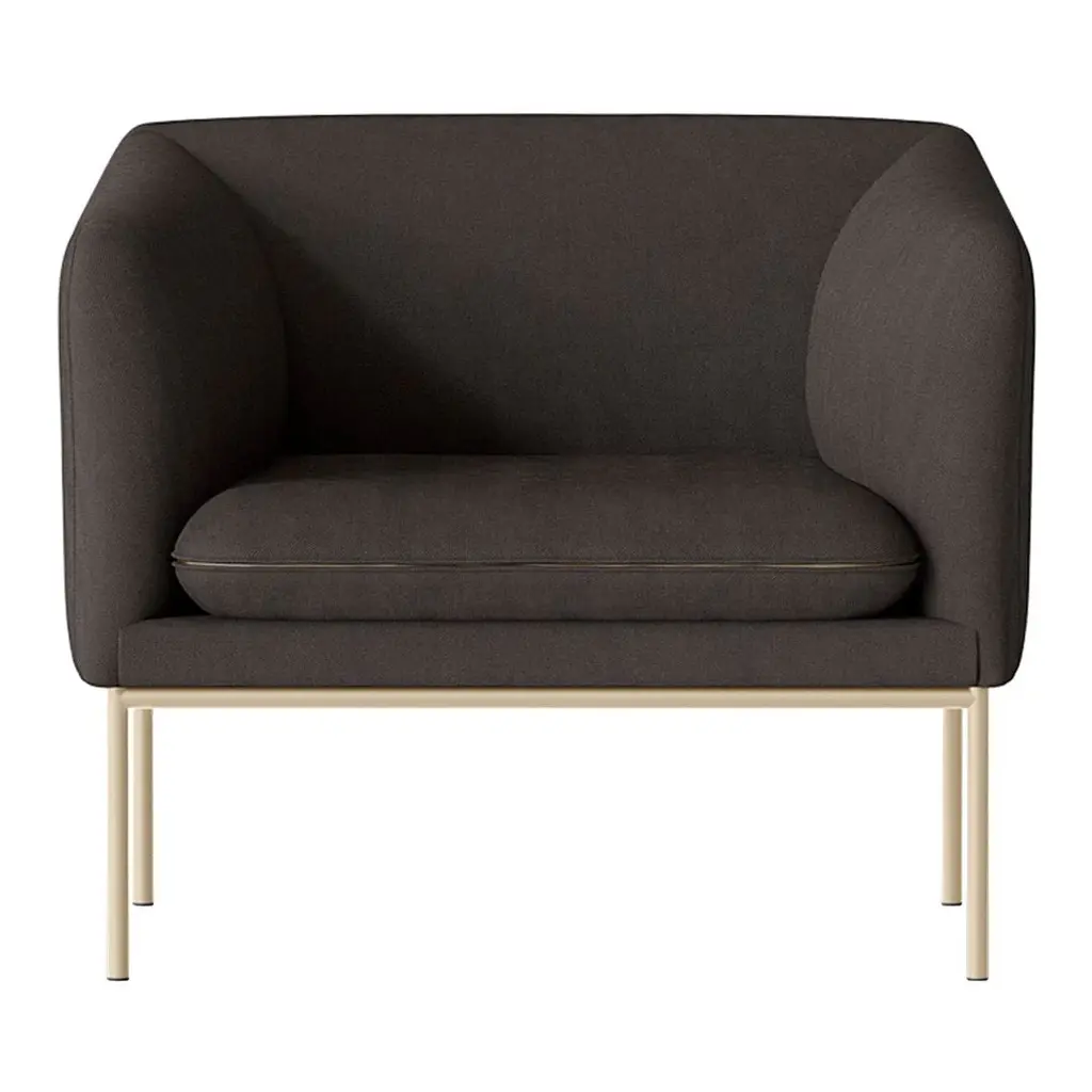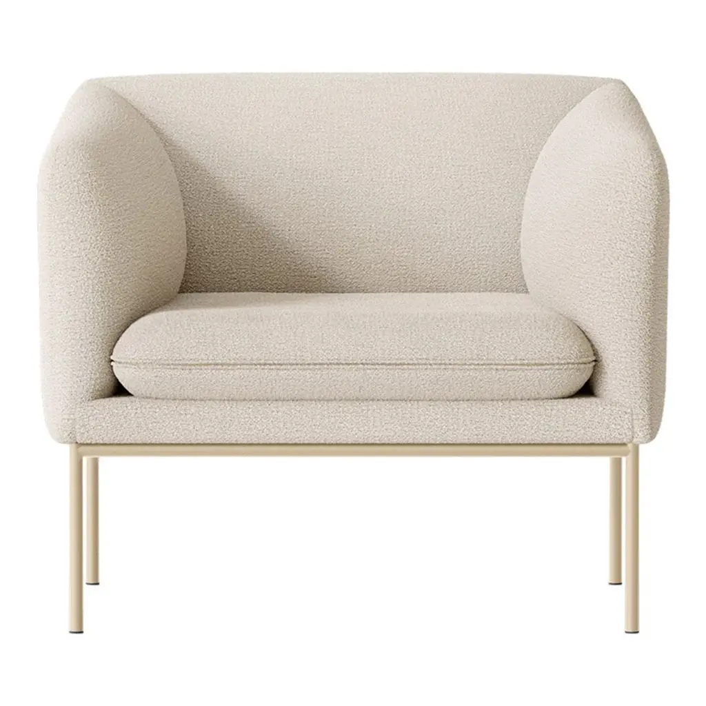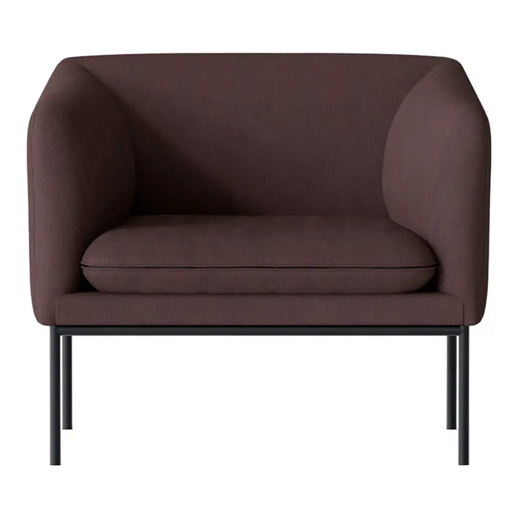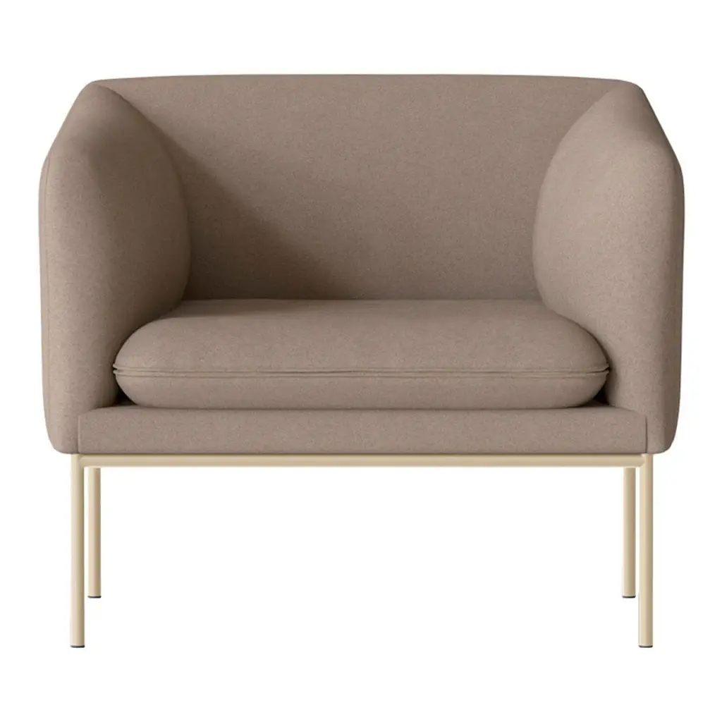This inviting armchair has a strict sculptural outer shape that complements the curves of the inviting, rounded inner. With its tight upholstery and simple frame made from powder coated steel, the chair achieves a timeless, clean look with a feminine touch and an elevated feel thanks to its thin, delicate legs.