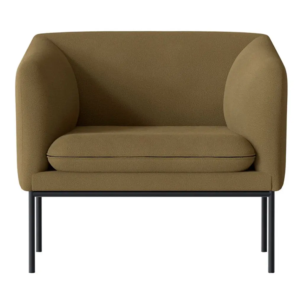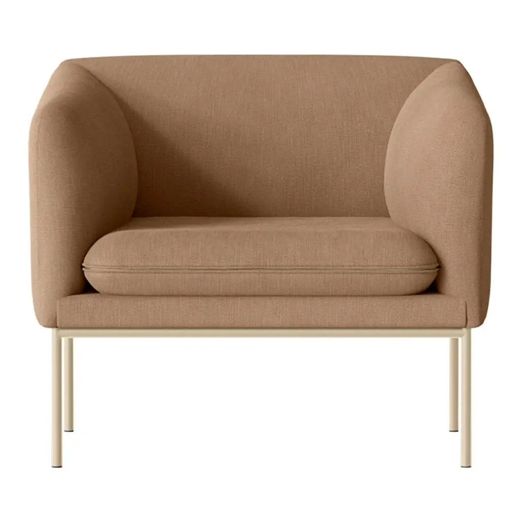 This inviting armchair has a strict sculptural outer shape that complements the curves of the inviting, rounded inner. With its tight upholstery and simple frame made from powder coated steel, the chair achieves a timeless, clean look with a feminine touch and an elevated feel thanks to its thin, delicate legs.