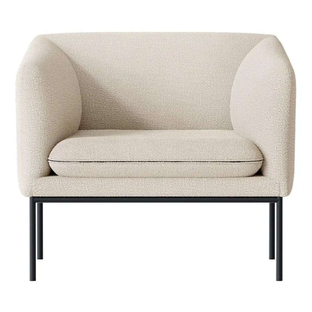 This inviting armchair has a strict sculptural outer shape that complements the curves of the inviting, rounded inner. With its tight upholstery and simple frame made from powder coated steel, the chair achieves a timeless, clean look with a feminine touch and an elevated feel thanks to its thin, delicate legs.
