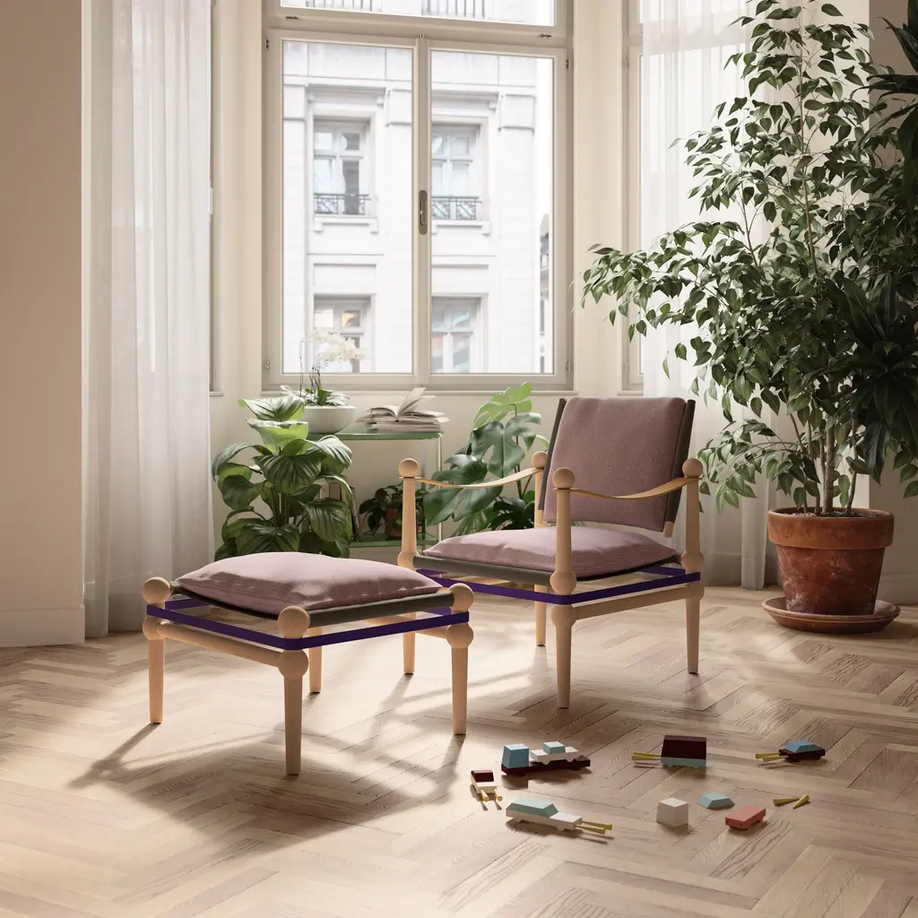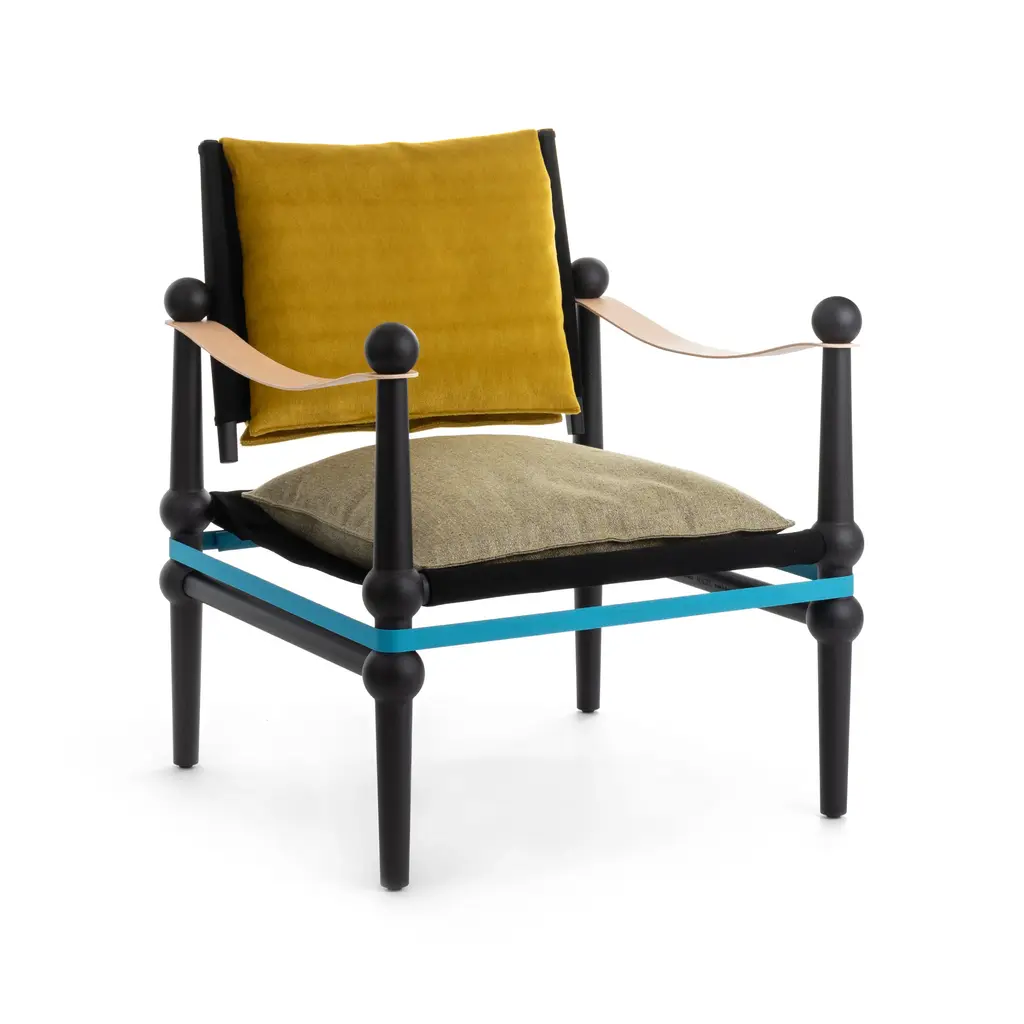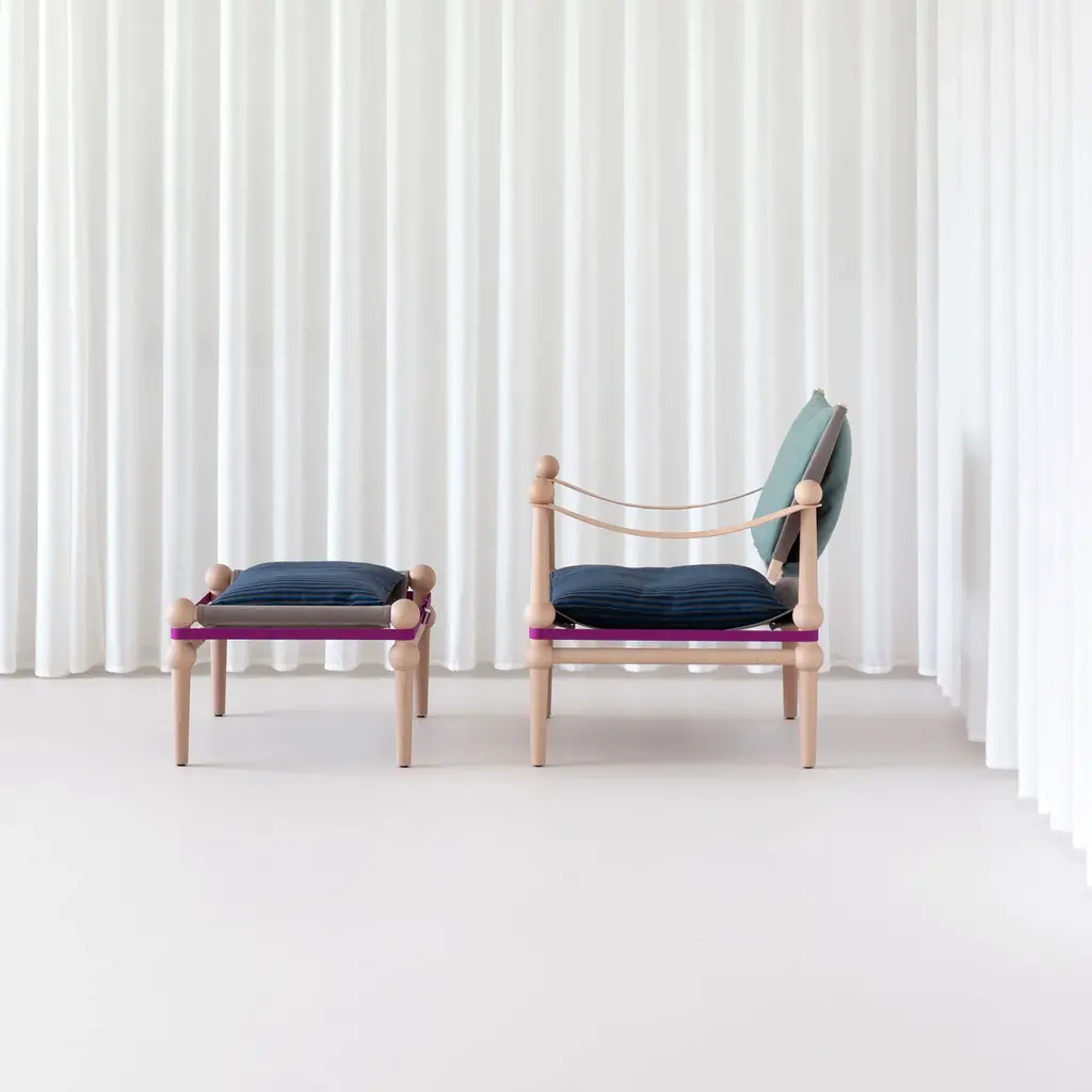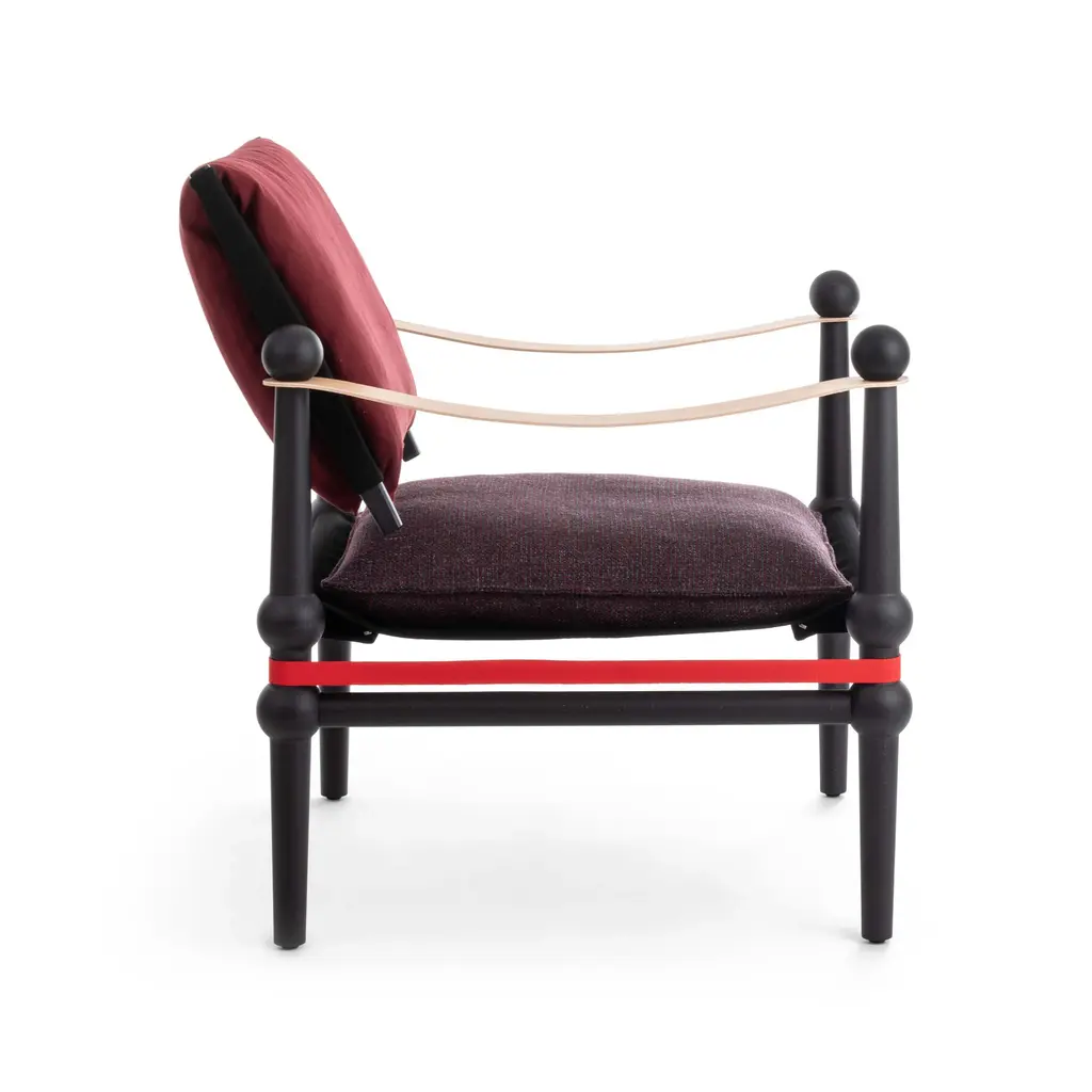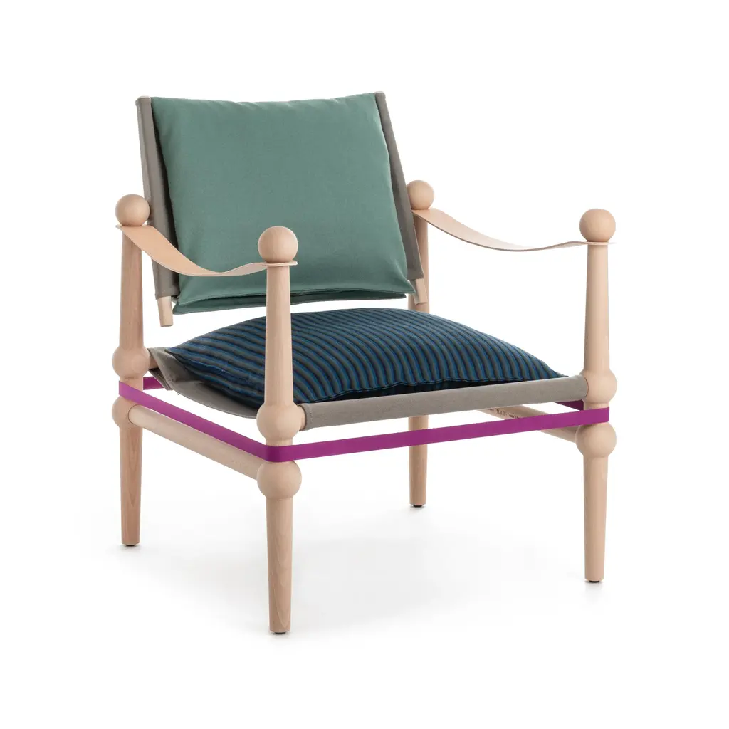 Discover the ultimate luxury in seating with the Twain Lounge Chair from Magis. Designed by German designer Konstantin Grcic, this safari-inspired chair features an interlocking beech frame, supple leather armrests, and self-supporting fabric for maximum comfort. Topped with two cushions with removable covers, this chair adds visual interest with its unique combination of shapes and materials. Expertly crafted with an eye for detail, this chair is a stylish addition to any interior. Highlights